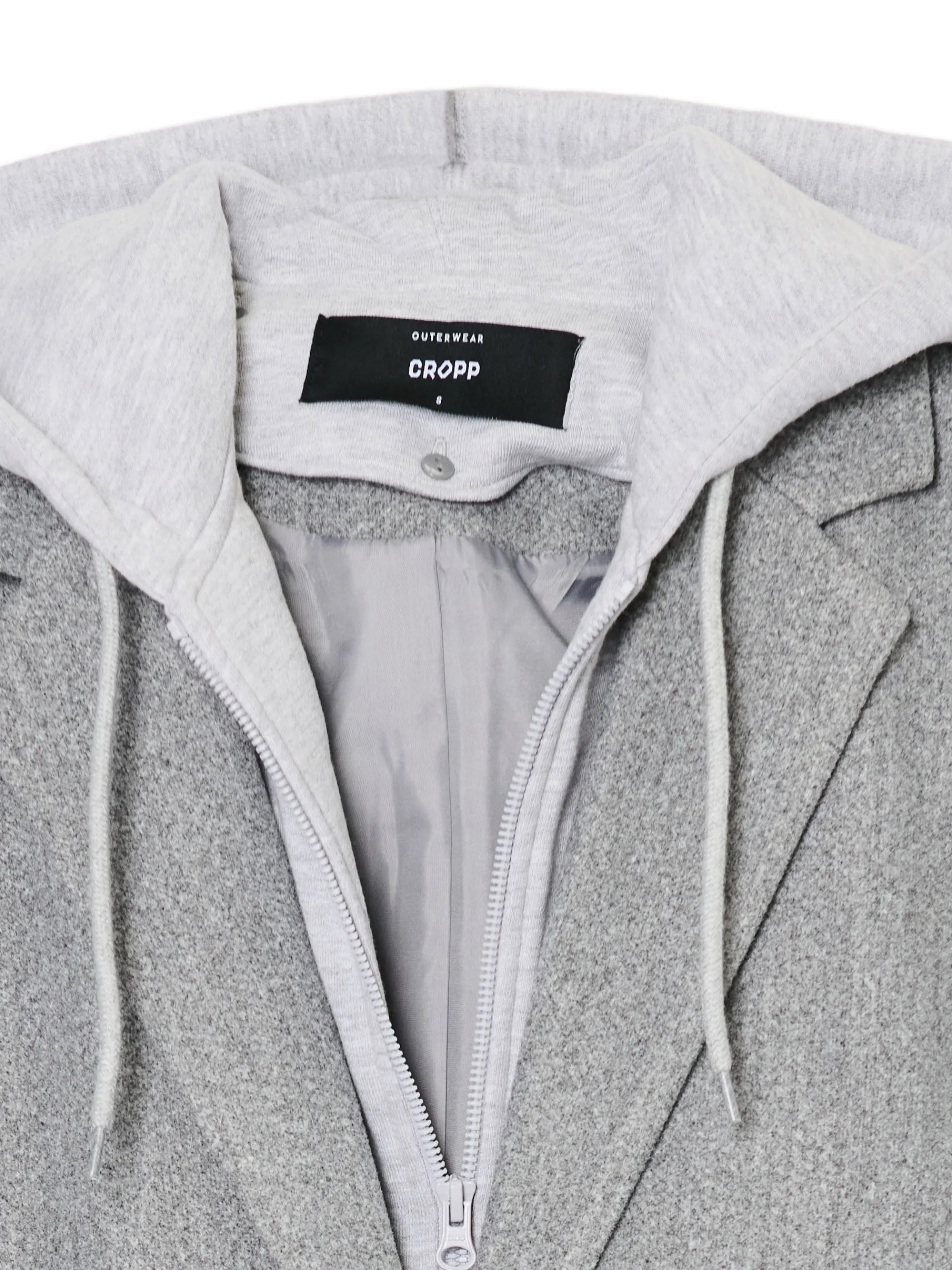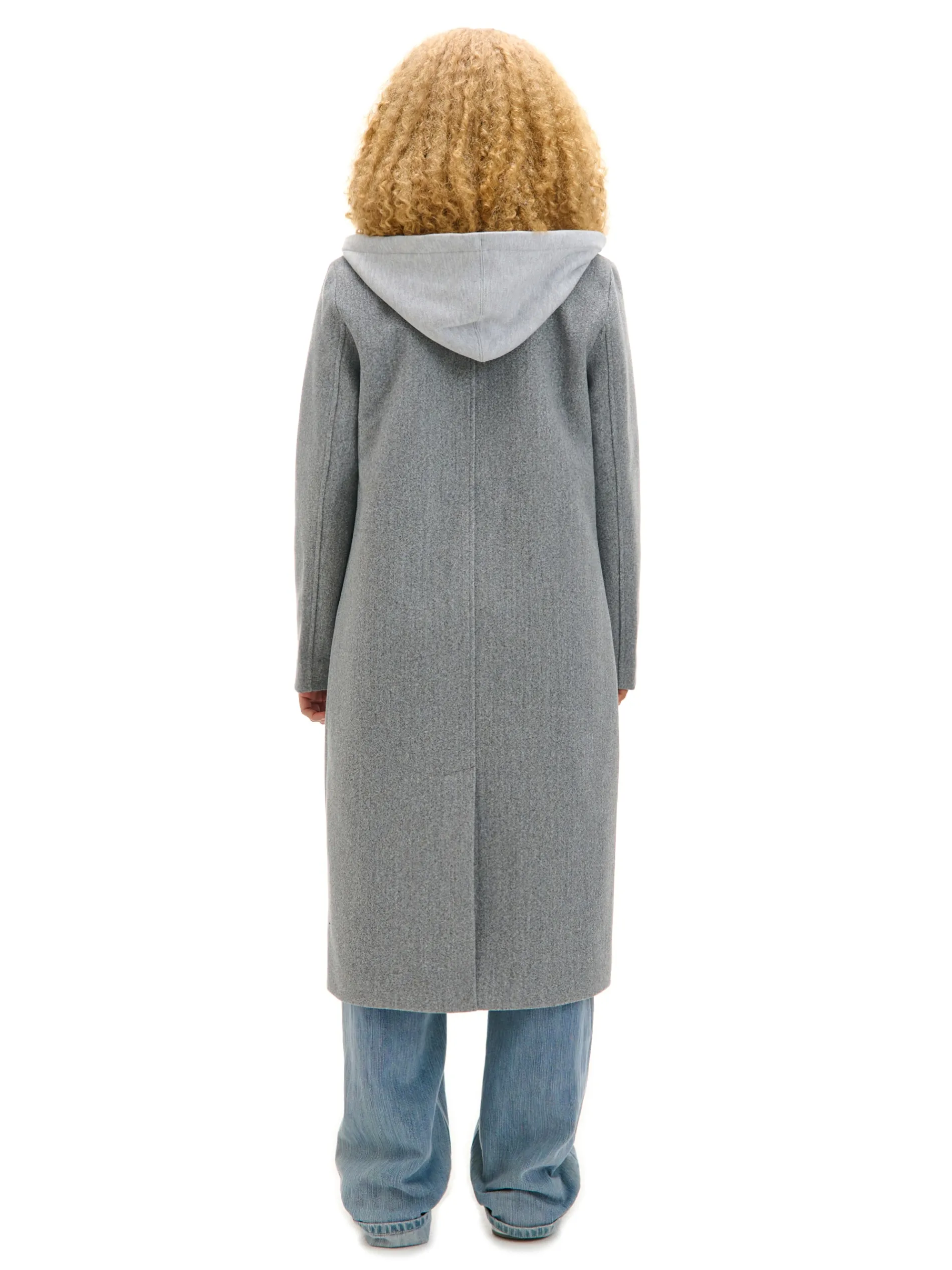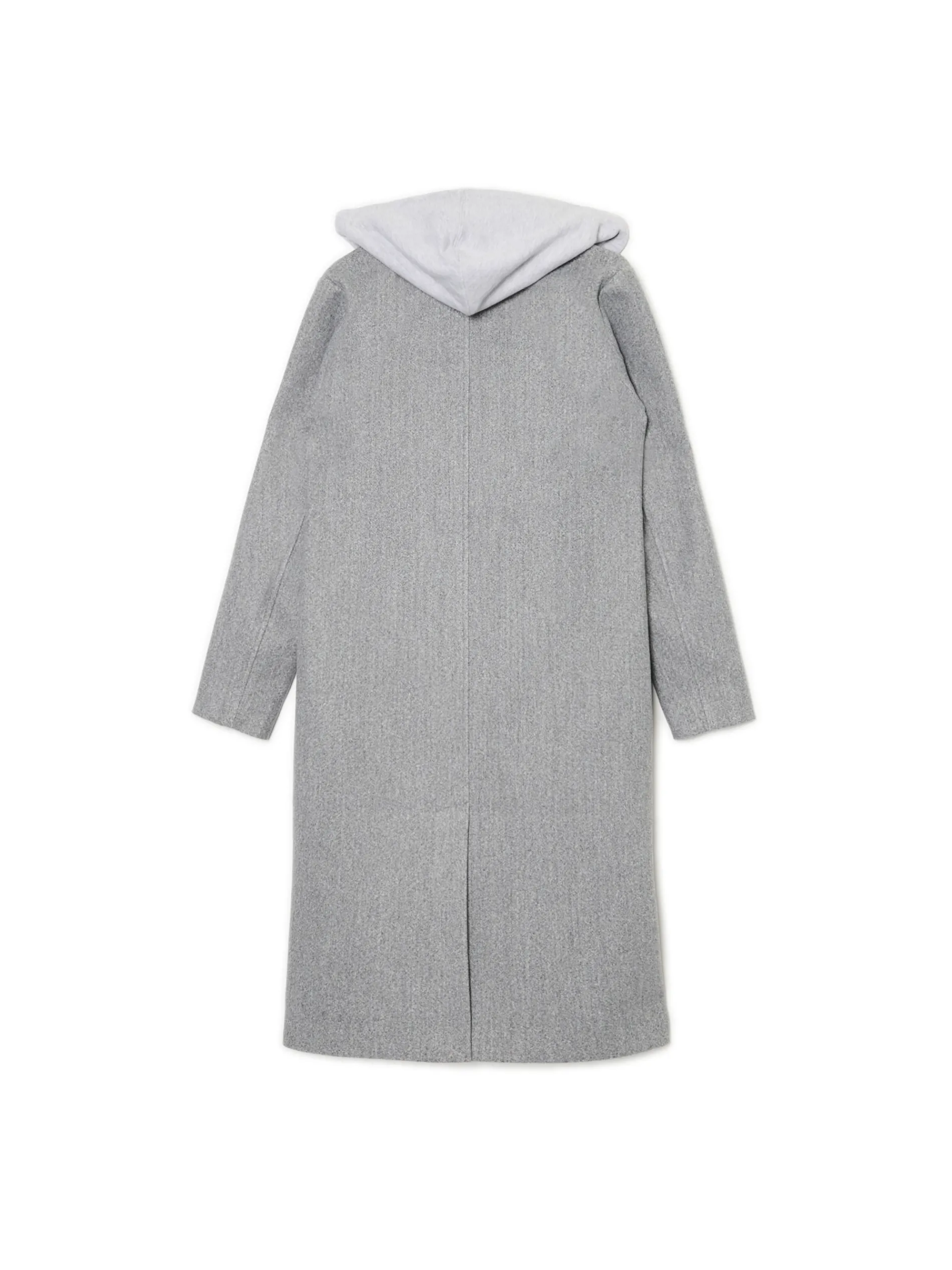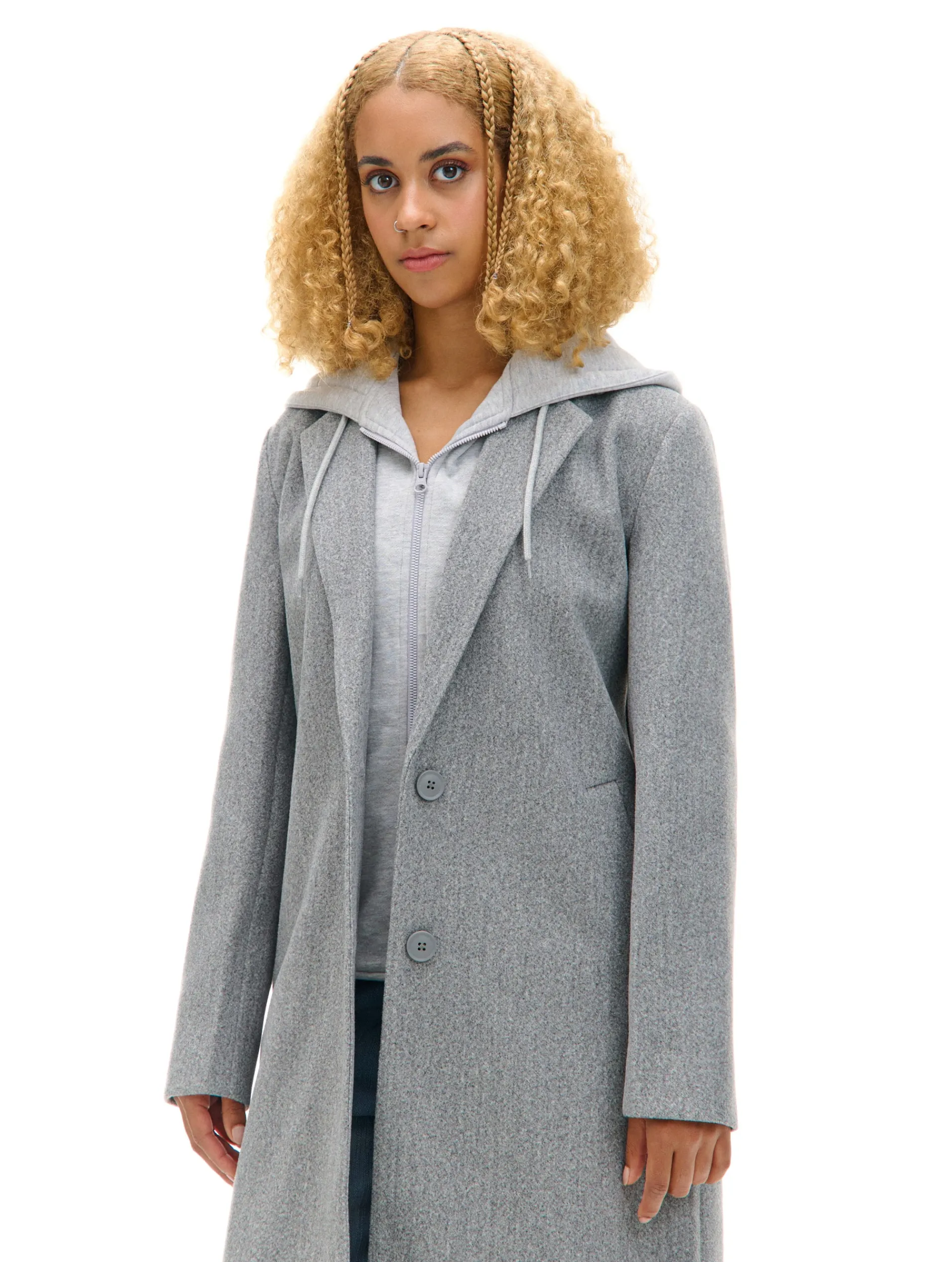 Melanżowy damski płaszcz uszyty z łączonych materiałów w kolorze szarym. Wstawka z miękkiej bluzy hoodie zapinanej na suwak nadaje jej sportowego charakteru. Oryginalny item na jesienne dni! regularny krój jednorzędowe zapięcie na guziki wykończenie na podszewce wykładany kołnierz miękki kaptur z troczkami długie rękawy dwie kieszenie po bokach praktyczne rozcięcie z tyłu