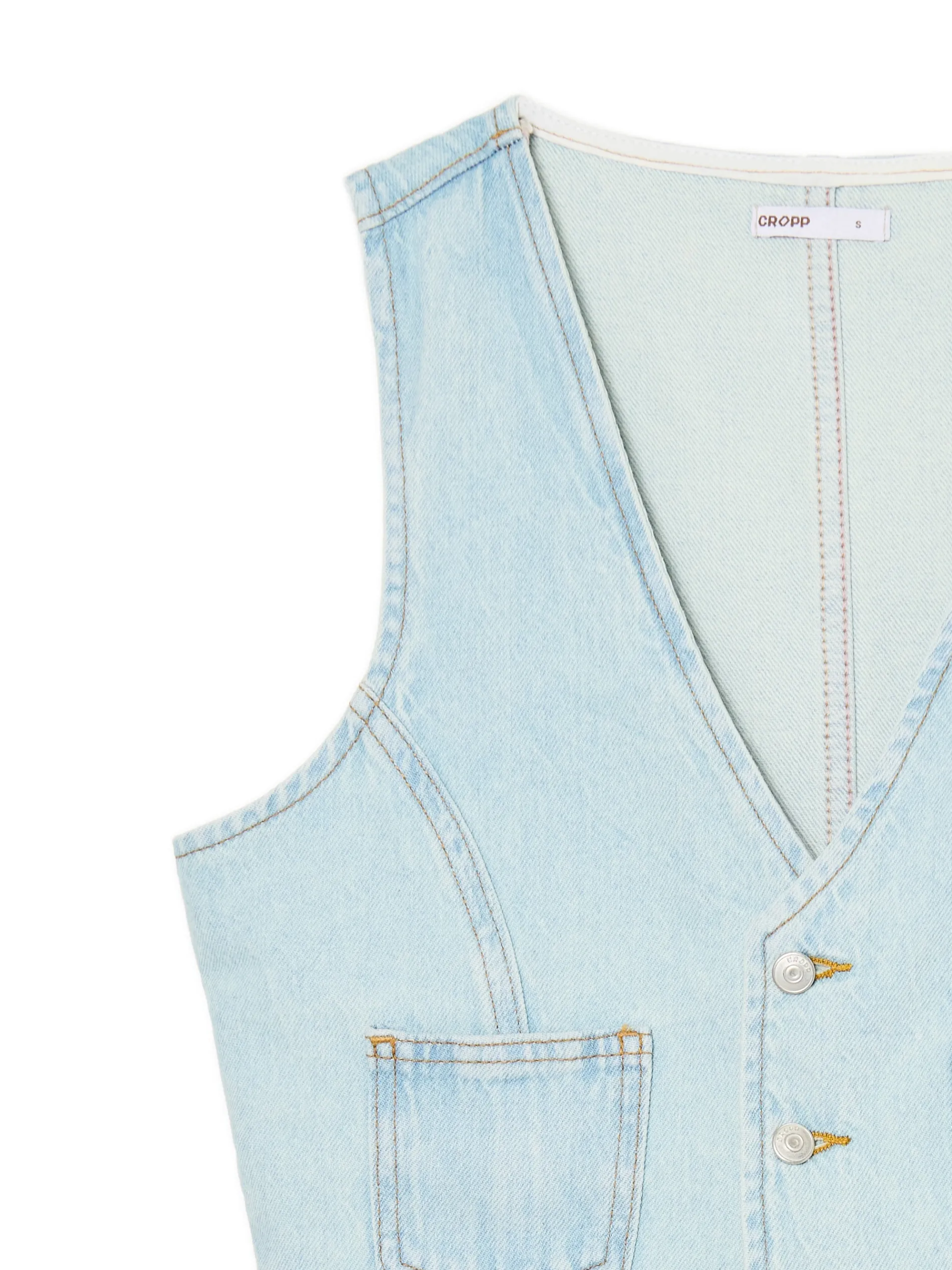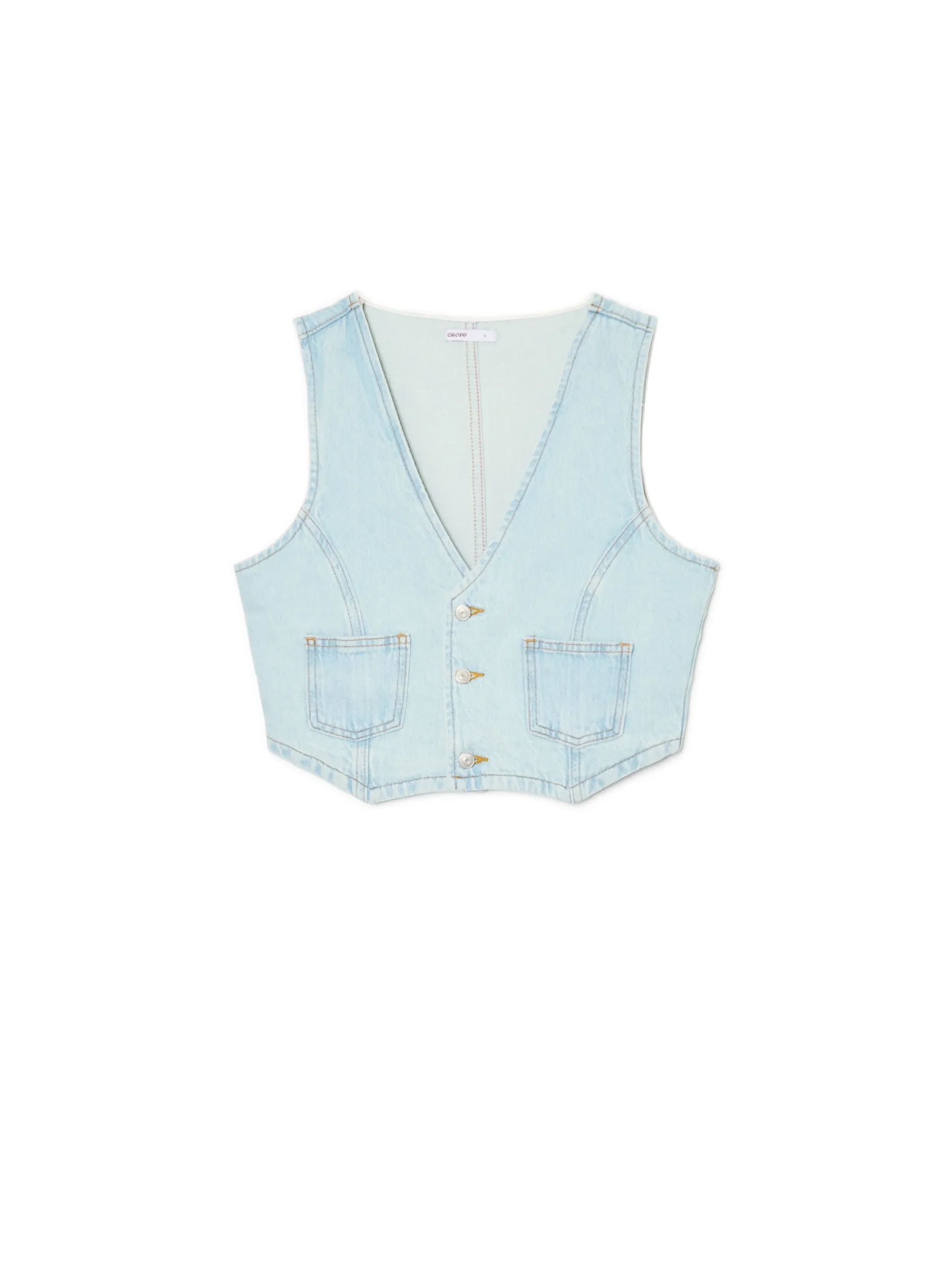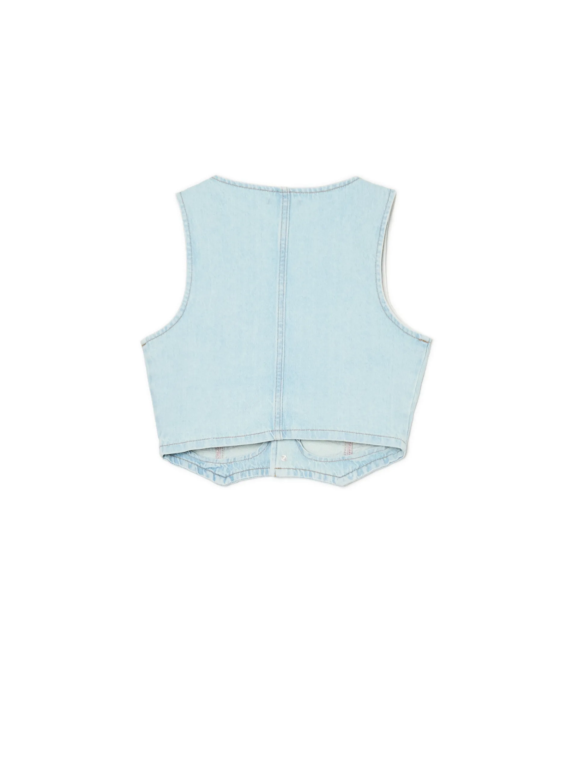Damska krótka kamizelka, uszyta z jasnego denimu. Idealna dla fanek kowbojskiego stylu – yee haw! krótki, dopasowany krój dekolt w kształcie litery V zapięcie na guziki dwie naszyte kieszonki ozdobne przeszycia Wzrost modelki: 172 cm