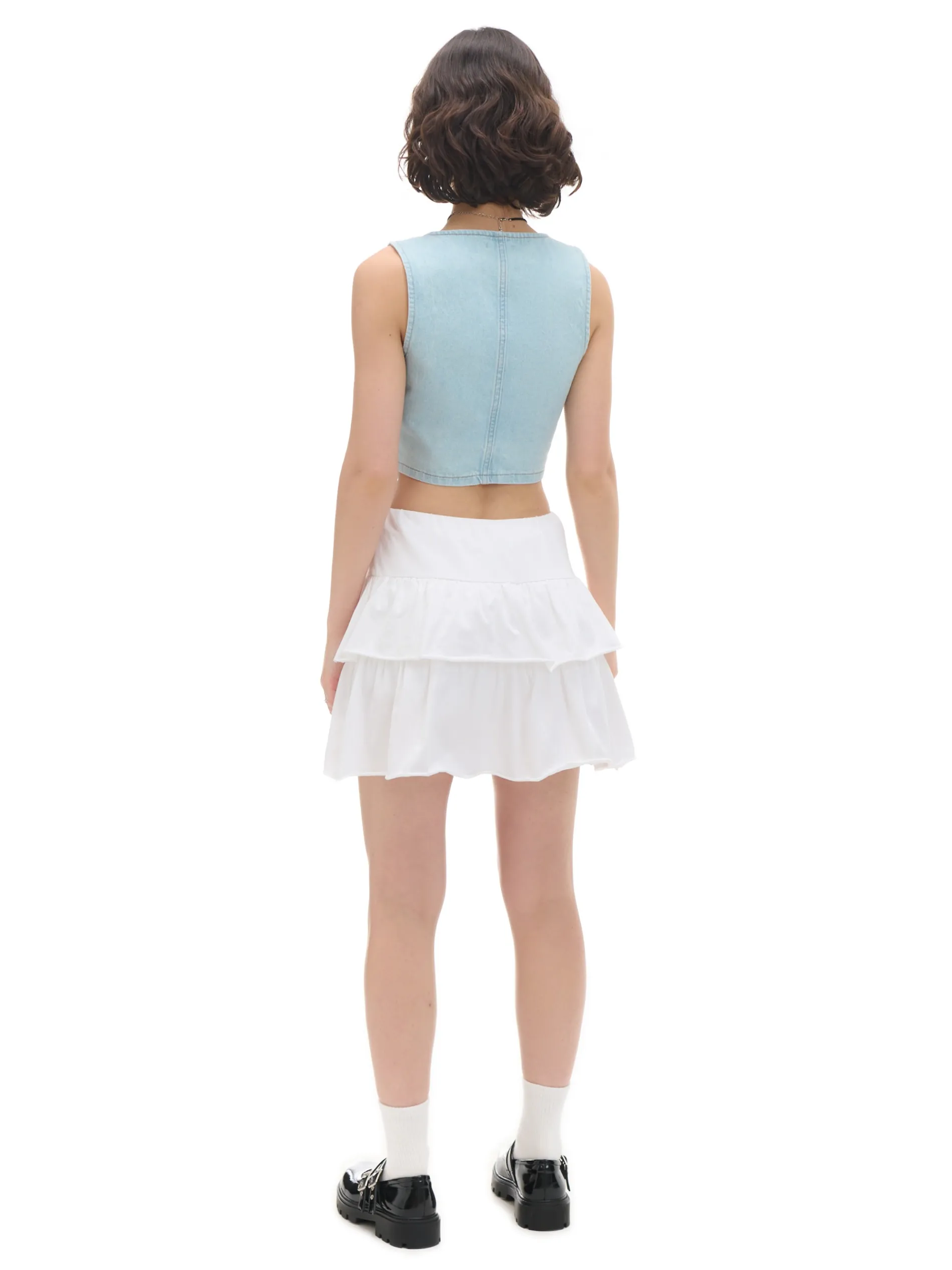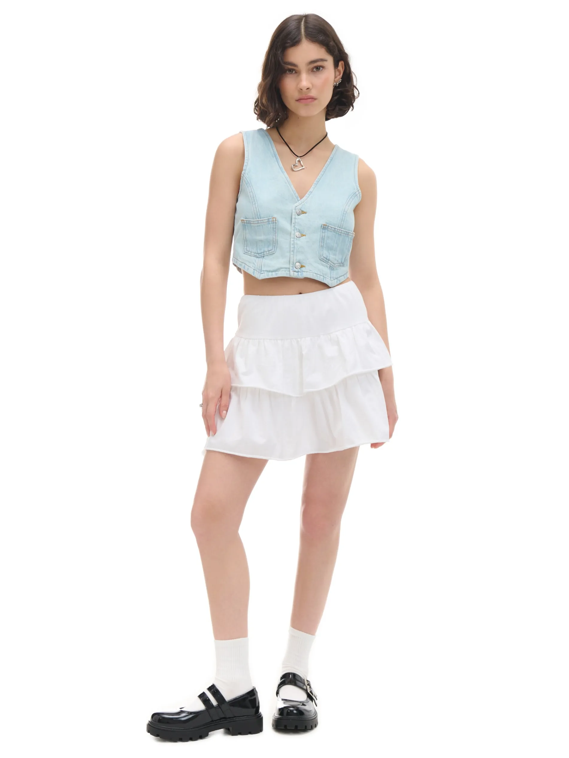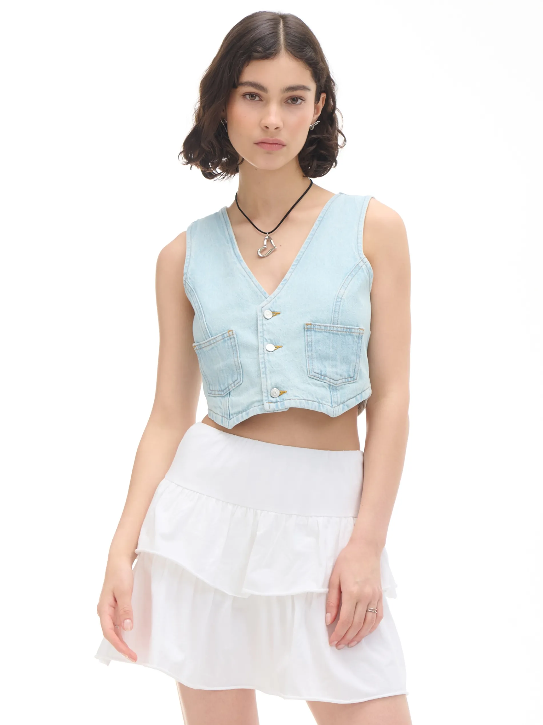 Damska krótka kamizelka, uszyta z jasnego denimu. Idealna dla fanek kowbojskiego stylu – yee haw! krótki, dopasowany krój dekolt w kształcie litery V zapięcie na guziki dwie naszyte kieszonki ozdobne przeszycia Wzrost modelki: 172 cm