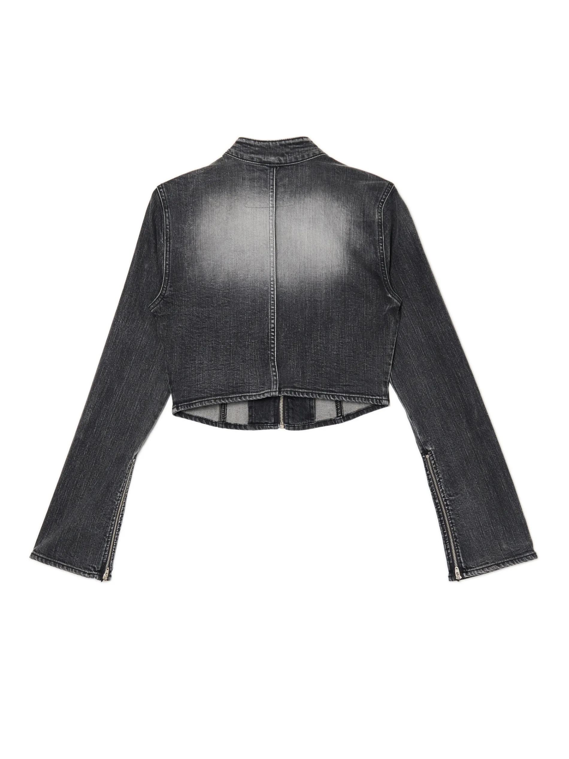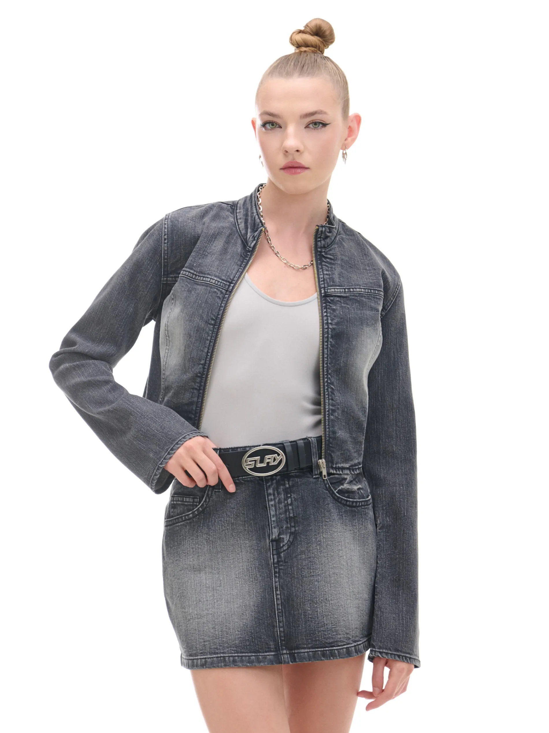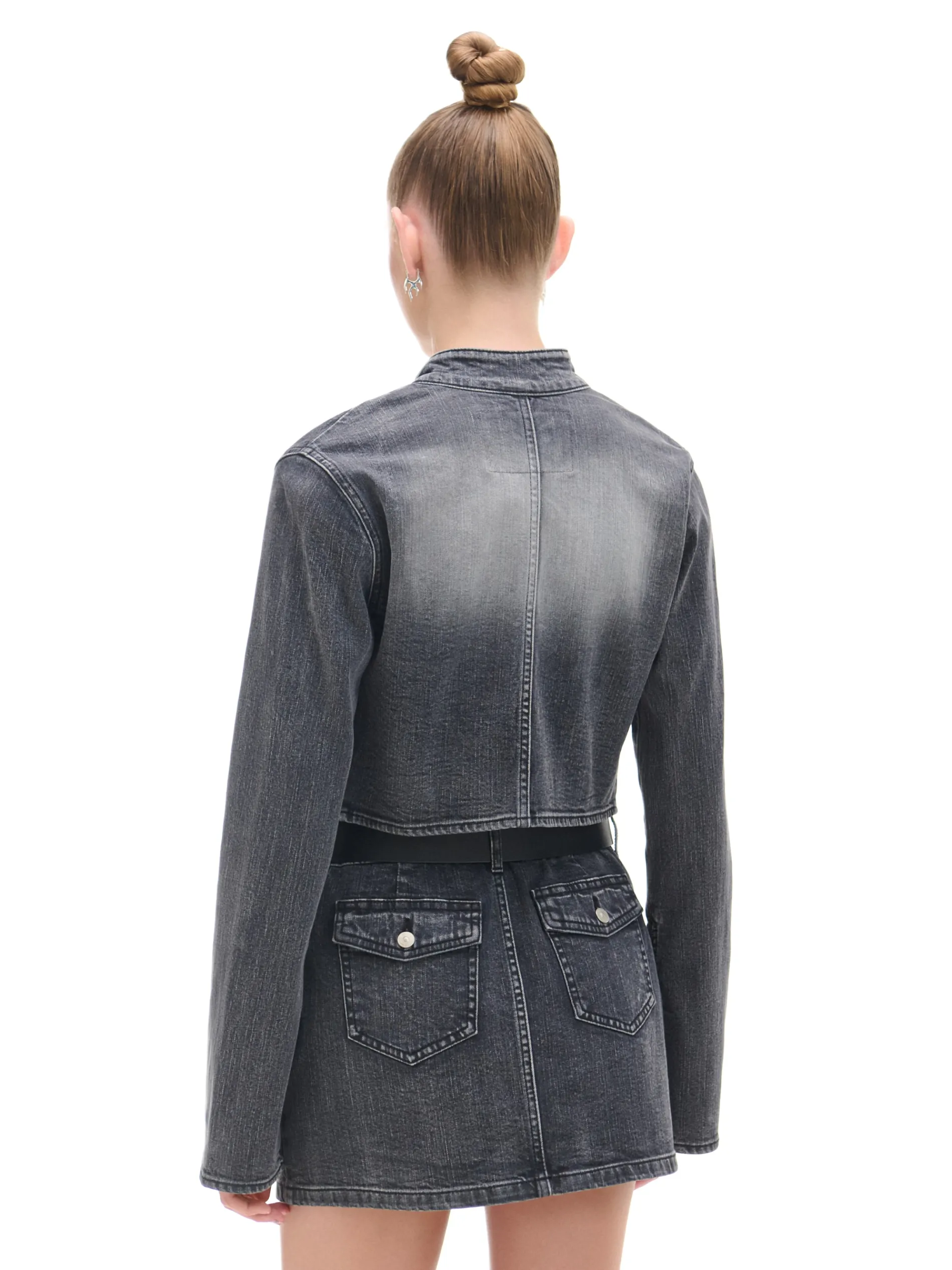 Damska kurtka typu katanka uszyta z ciemnego denimu. Ozdobą tego modelu jest delikatny efekt sprania na całości i kontrastowe detale z przodu. bawełna z dodatkiem elastycznych włókien krótki krój zapięcie na zamek na całej długości kołnierz z niską stójką długie rękawy z suwakiem przy mankiecie kontrastowe wstawki delikatny efekt sprania Tworzy zestaw z modelem 586AQ-99M .