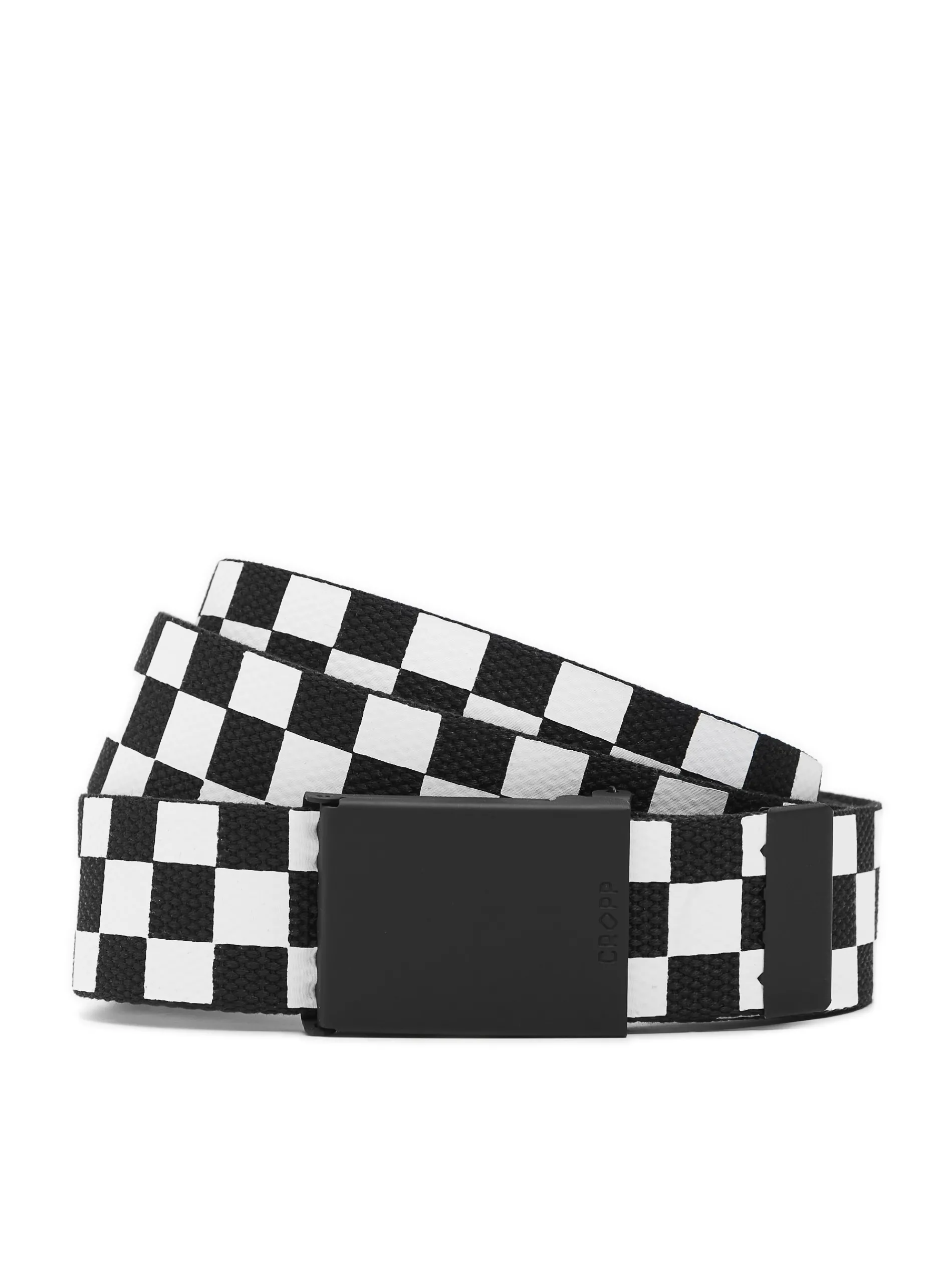 Męski materiałowy pasek do spodni, wykonany z syntetycznej tkaniny. Jedna strona – czarna, druga – ozdobiona biało-czarną kratką. Wymiary produktu 125 x 4 cm