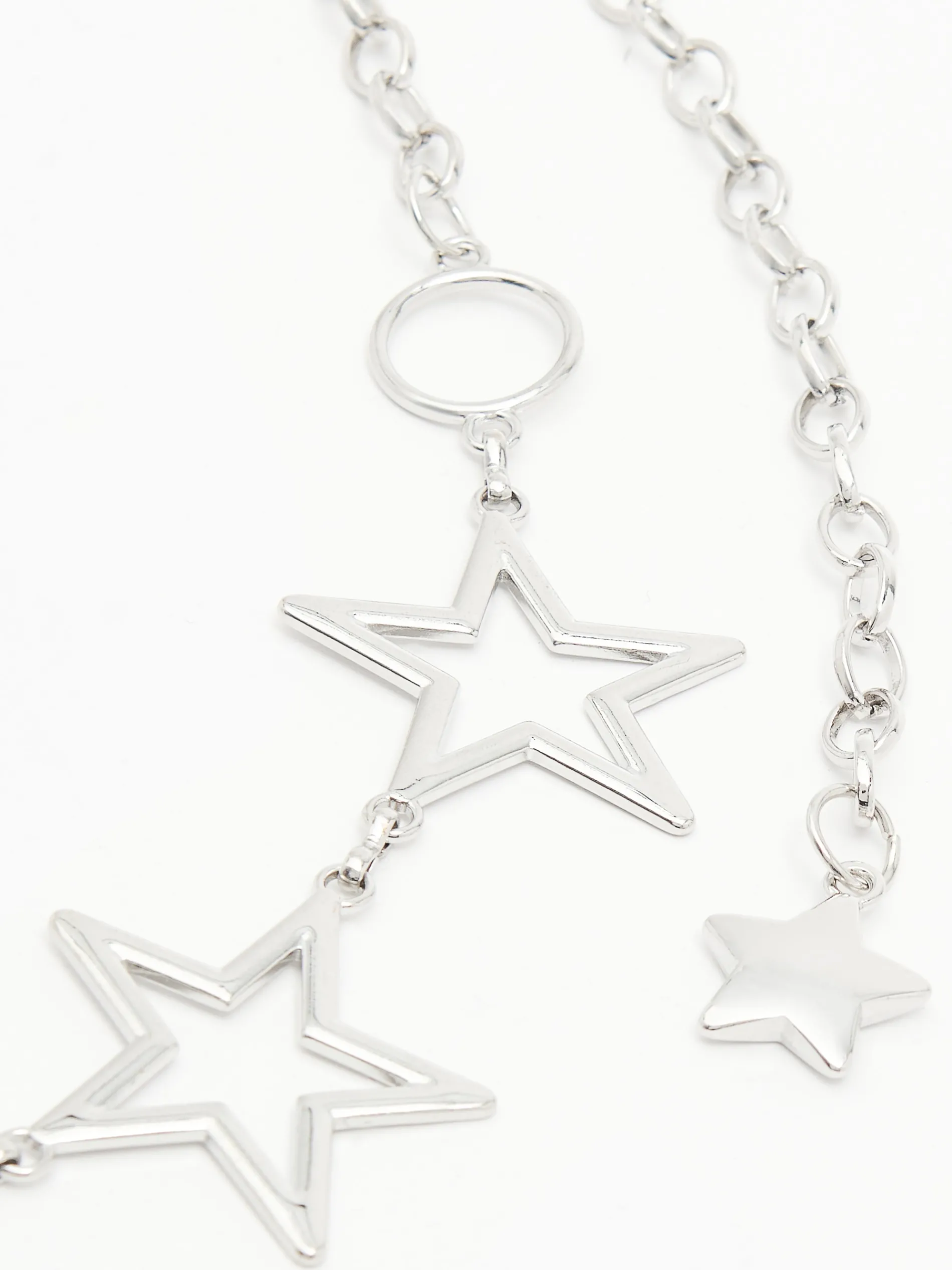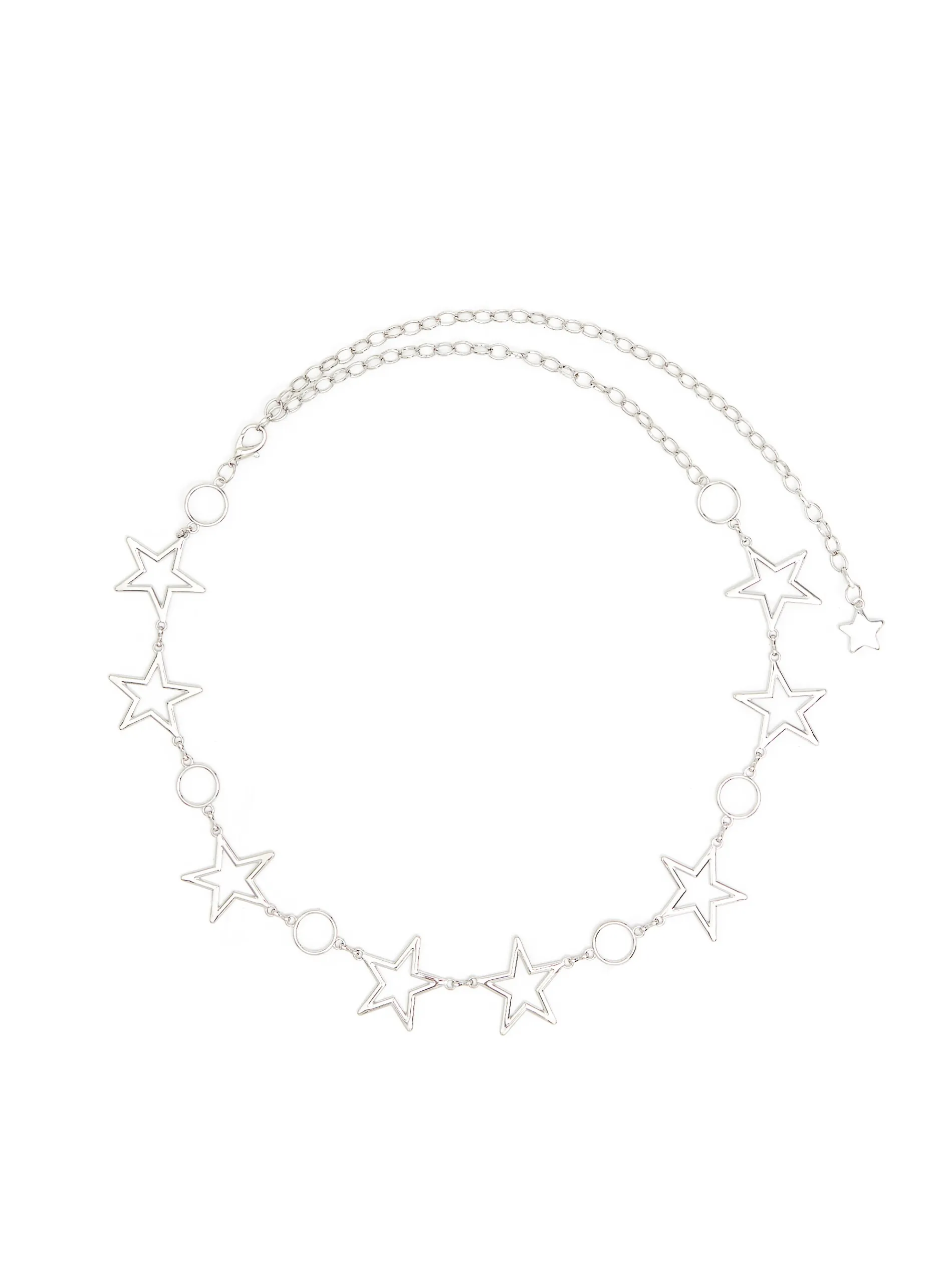 Łańcuszkowy pasek do spodni z motywem gwiazdek, wykonany z tworzywa w kolorze srebrnym.