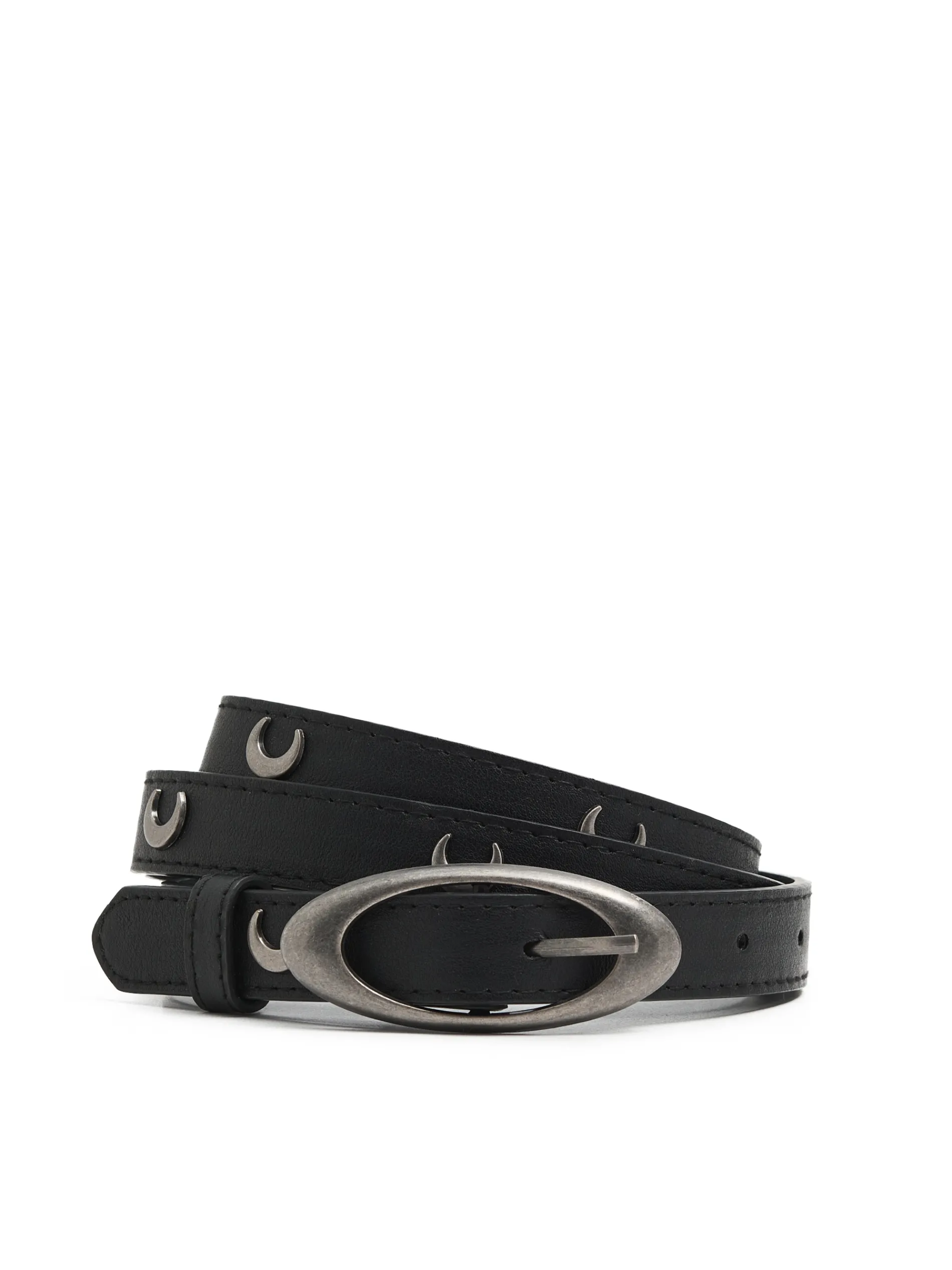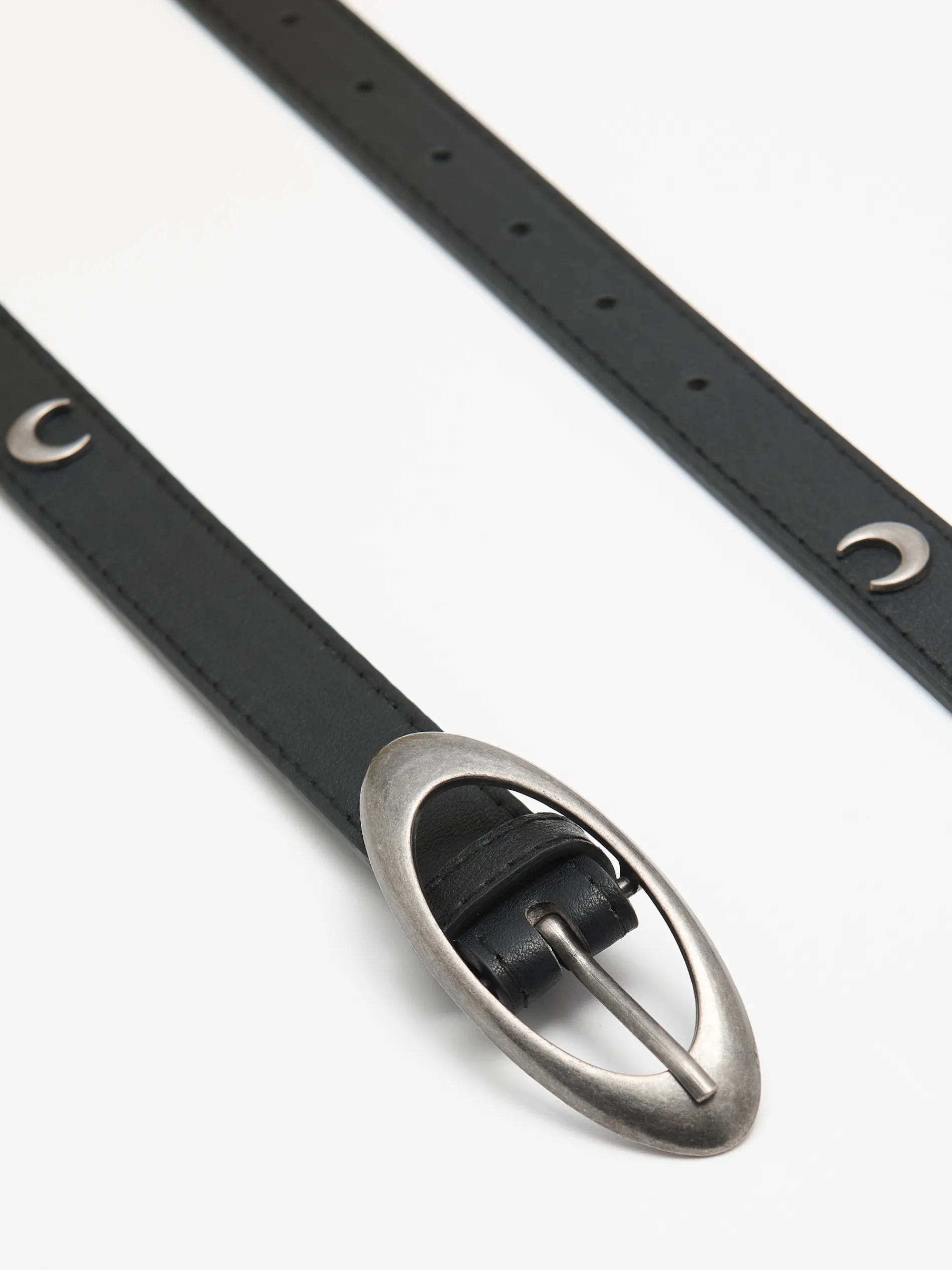 Damski pasek do spodni z owalną klamrą, wykonany z czarnej imitacji skóry. Ozdobiony aplikacją z motywem półksiężyca. Wymiary produktu: 110 x 3,3 cm
