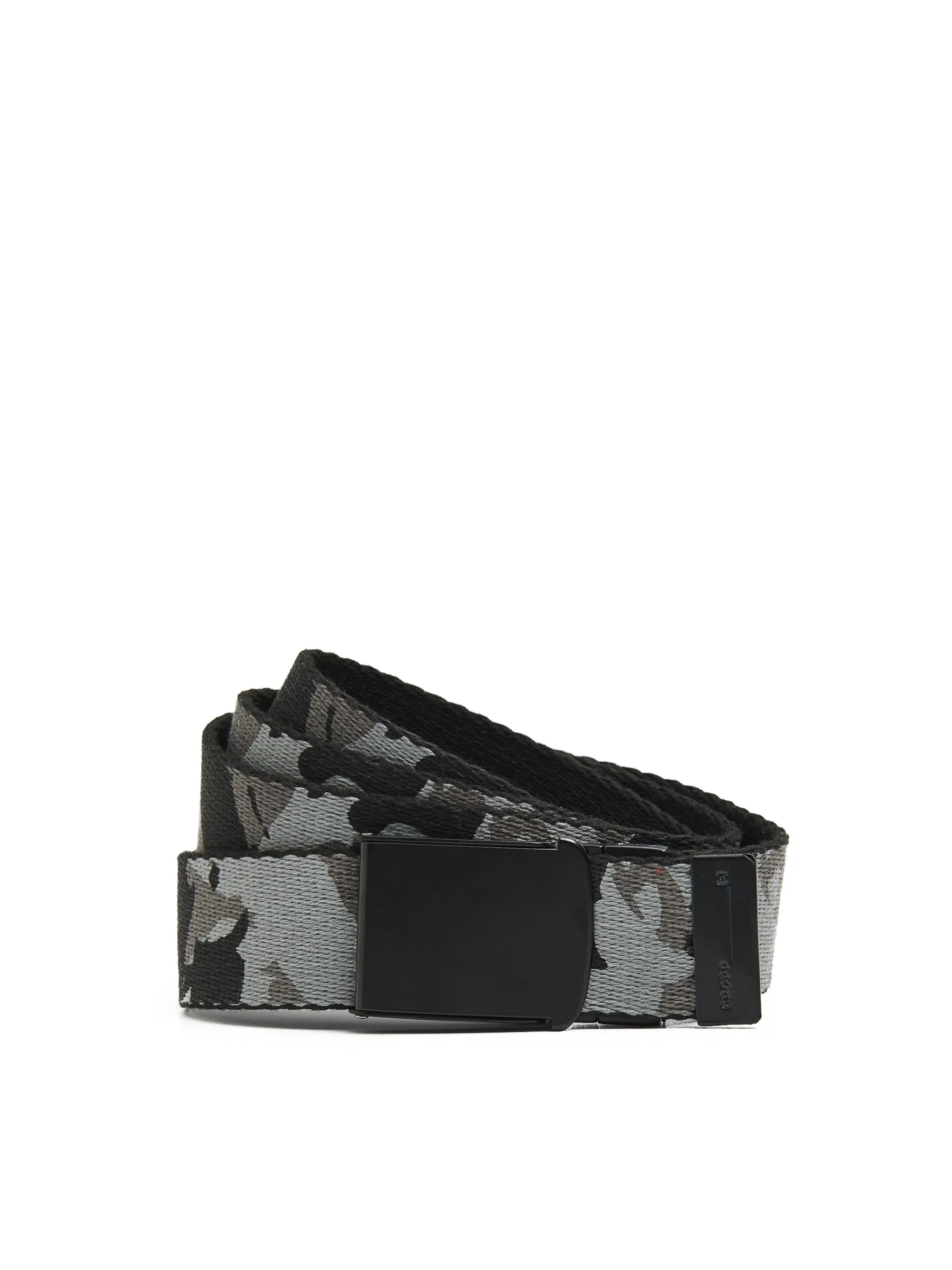 Męski parciany pasek do spodni wykonany z grubej, trwałej tkaniny z militarnym nadrukiem. Wyposażony w wygodne zapięcie z klamrą z brandowym wykończeniem.