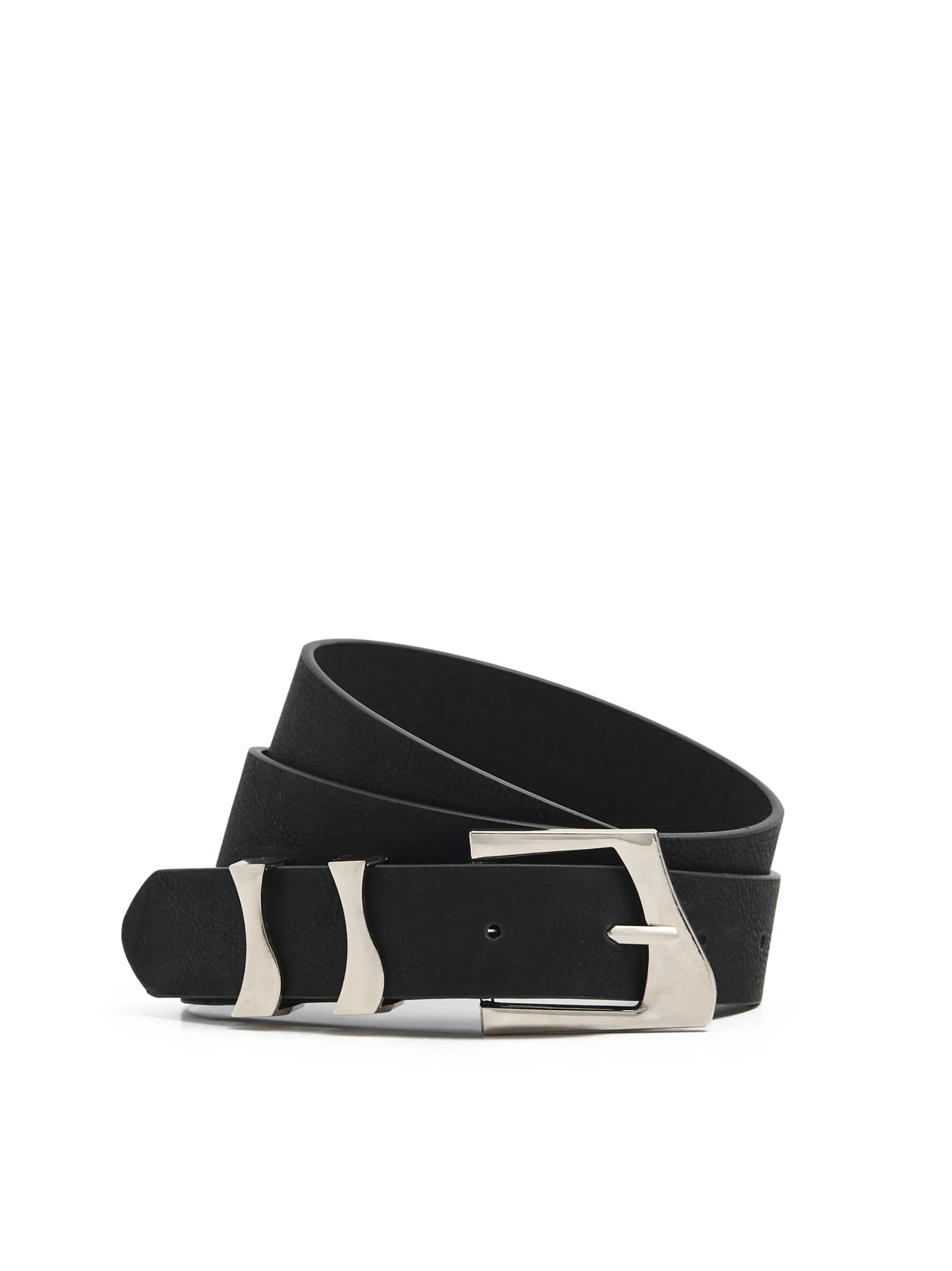 Damski pasek do spodni o węższym kroju wykonany z imitacji skóry w kolorze czarnym. Ozdobna klamra i szlufki w kolorze srebrnym będą fitowały z różnego typu spodniami. Just try! klasyczny pasek z imitacji skóry możliwość regulacji szerokości obwodu, dzięki zapięciu duża, dekoracyjna klamra z przodu metalowe detale