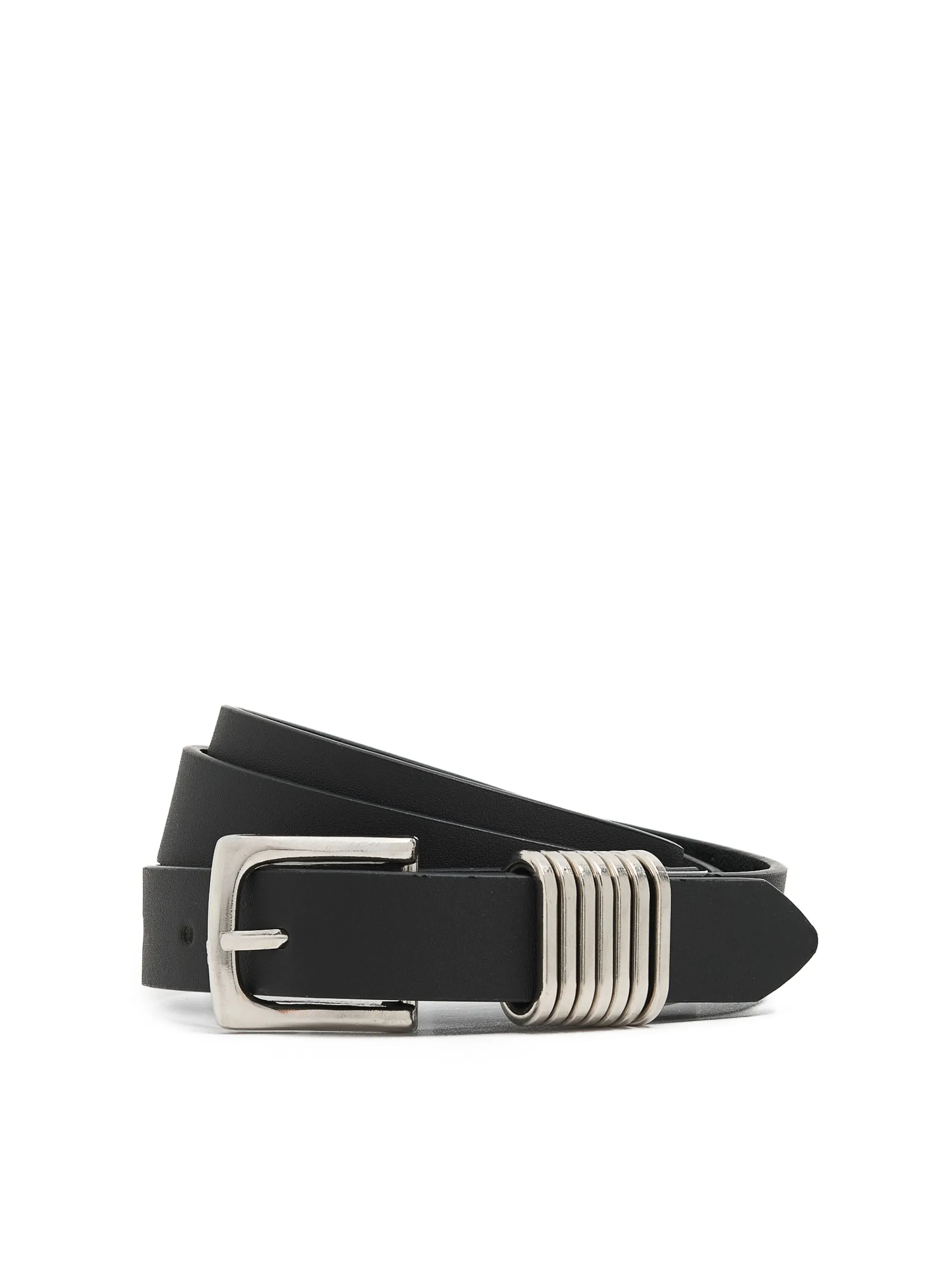 Damski pasek z imitacji skóry w kolorze czarnym. Posiada wygodne zapięcie zakończone kwadratową klamrą i dekoracyjnymi szlufkami. Detale wykonane z metalowego tworzywa są trwałe i pięknie prezentują się jako dodatek do stylizacji.