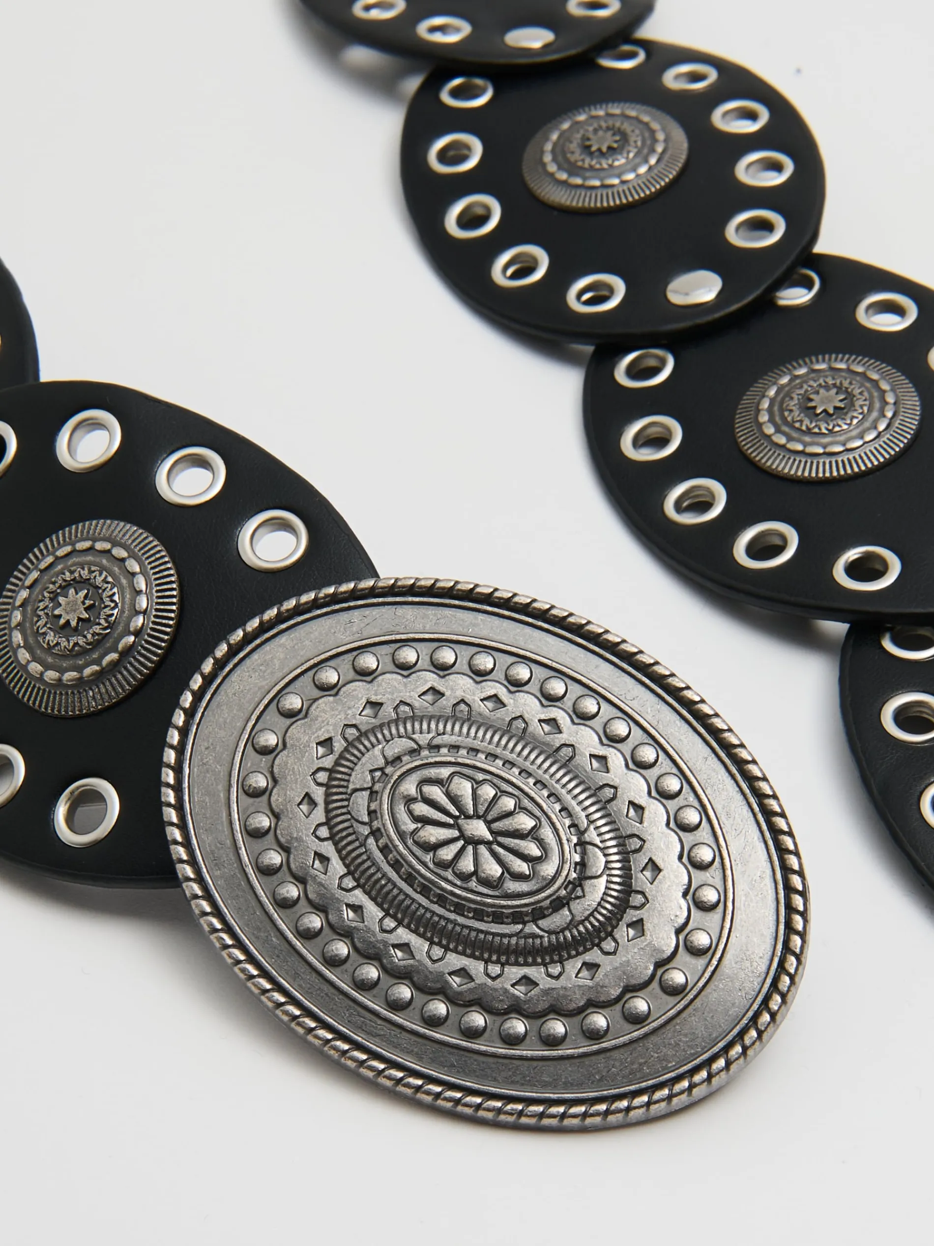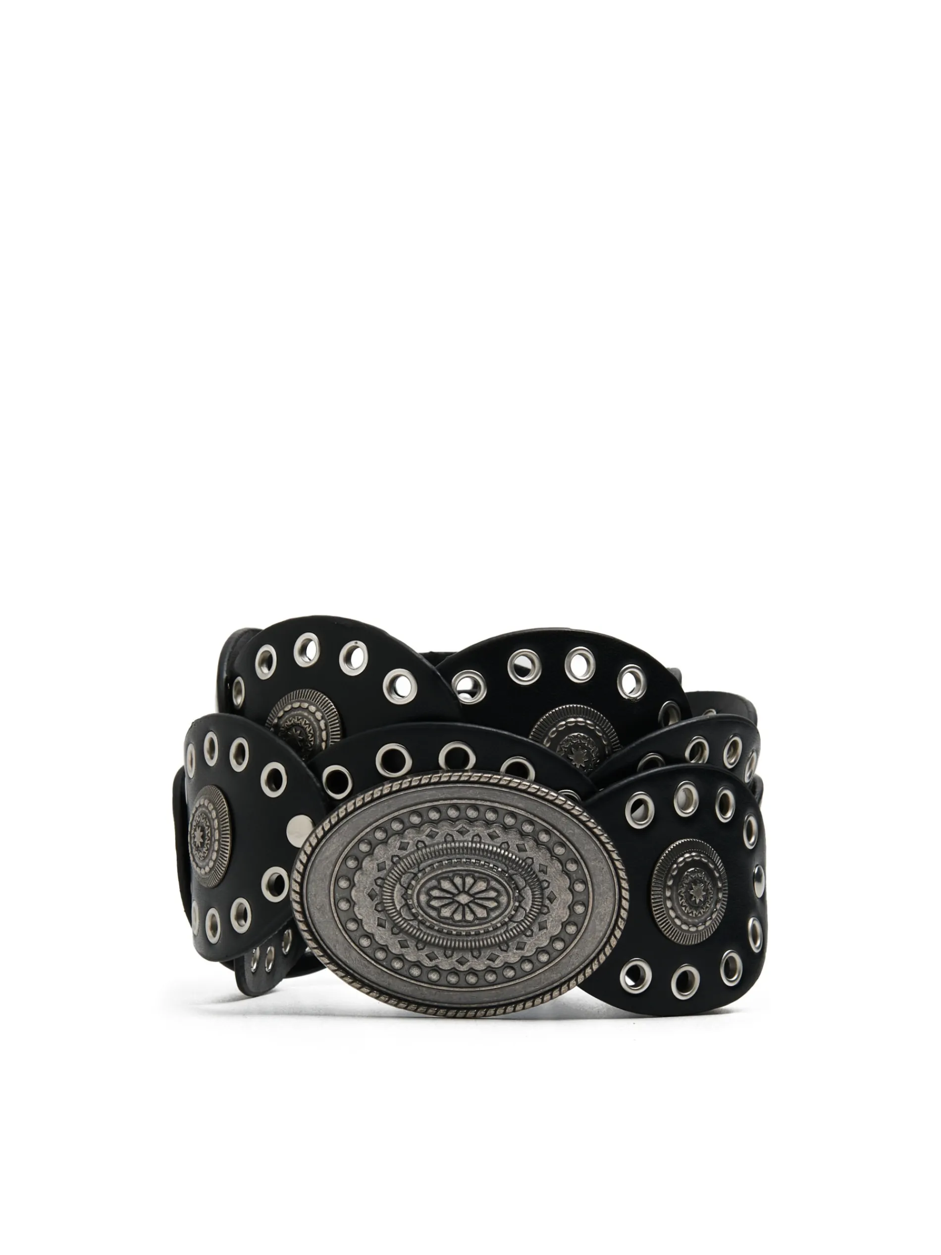 Damski ozdobny pasek wykonany z imitacji skóry w kolorze czarnym. Wyposażony w wygodną regulację, ozdobne przelotki i oryginalne detale. Zmatchuj ten dodatek z ulubionymi sukienkami, tunikami czy spódnicami.