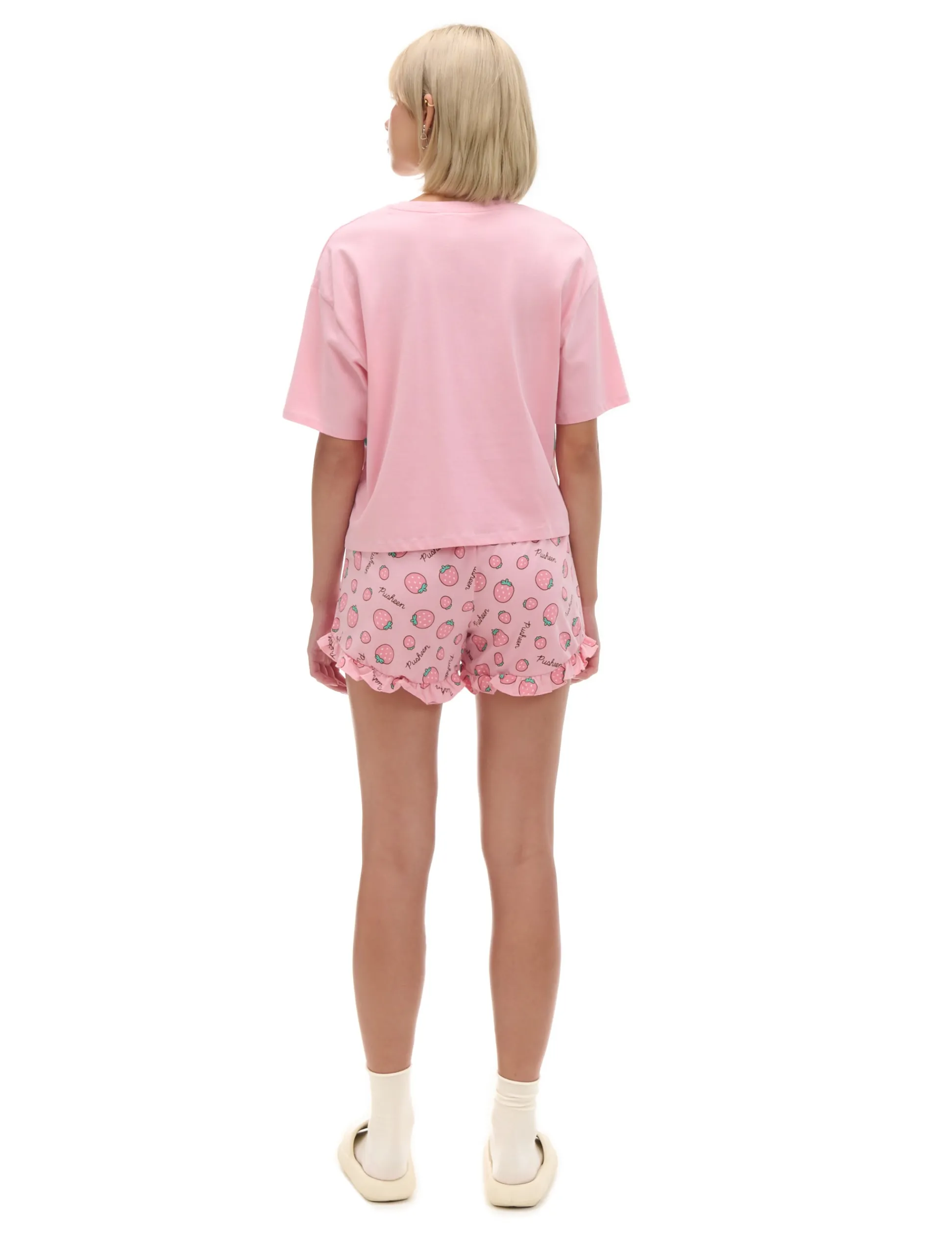 Damska dwuczęściowa piżama, uszyta z bawełnianej dzianiny. Zestaw składa się z wygodnej koszulki i szortów. Góra z krótkim rękawem i nadrukiem Pusheen. Dół z motywem truskawek i ozdobną falbaną. Wrzuć Pusheena do koszyka! 100% bawełny krótkie rękawy koszulka z nadrukiem Pusheen krótkie, swobodne nogawki spodenki z nadrukiem all over w truskawki dół wykończony falbaną © 2024 Pusheen Corp.