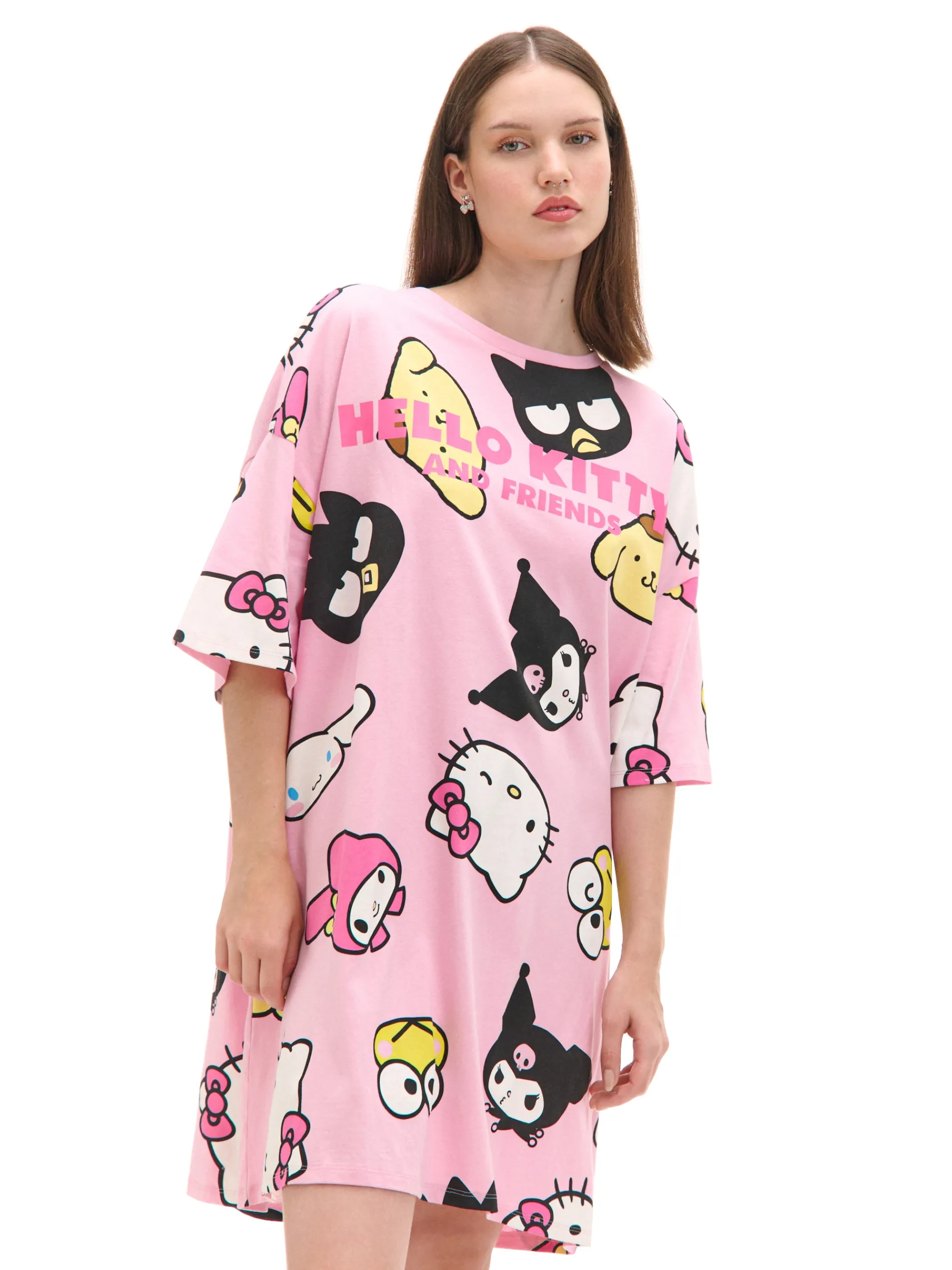 Damska koszula nocna uszyta z bawełnianej dzianiny w różowym kolorze. Model uzupełnia nadruk na całej powierzchni z postaciami z serii Sanrio. 100% bawełny swobodny, luźny krój krótkie, szerokie rękawy nadruk z motywem Hello Kitty & Friends © 2024 SANRIO CO., LTD.