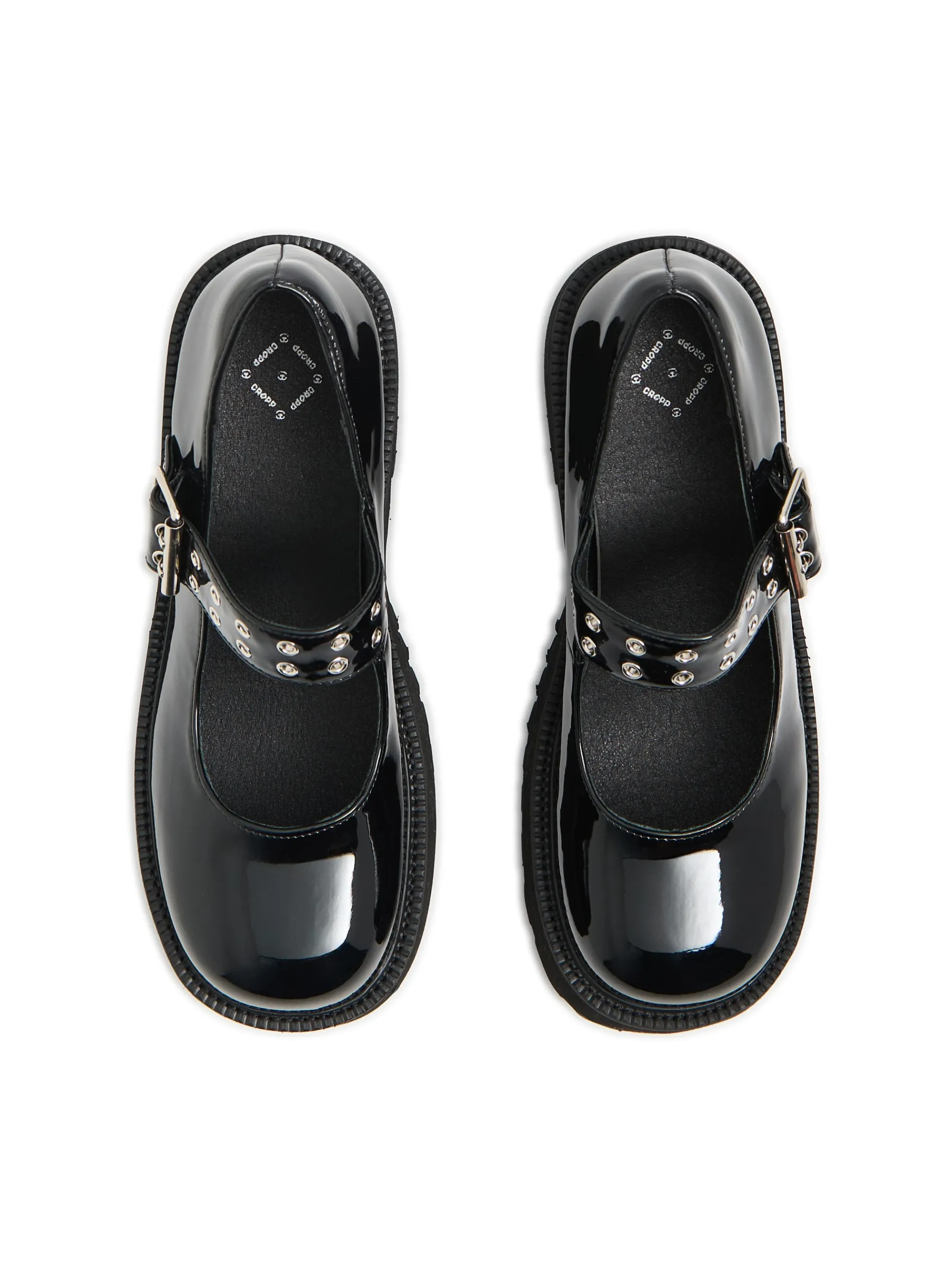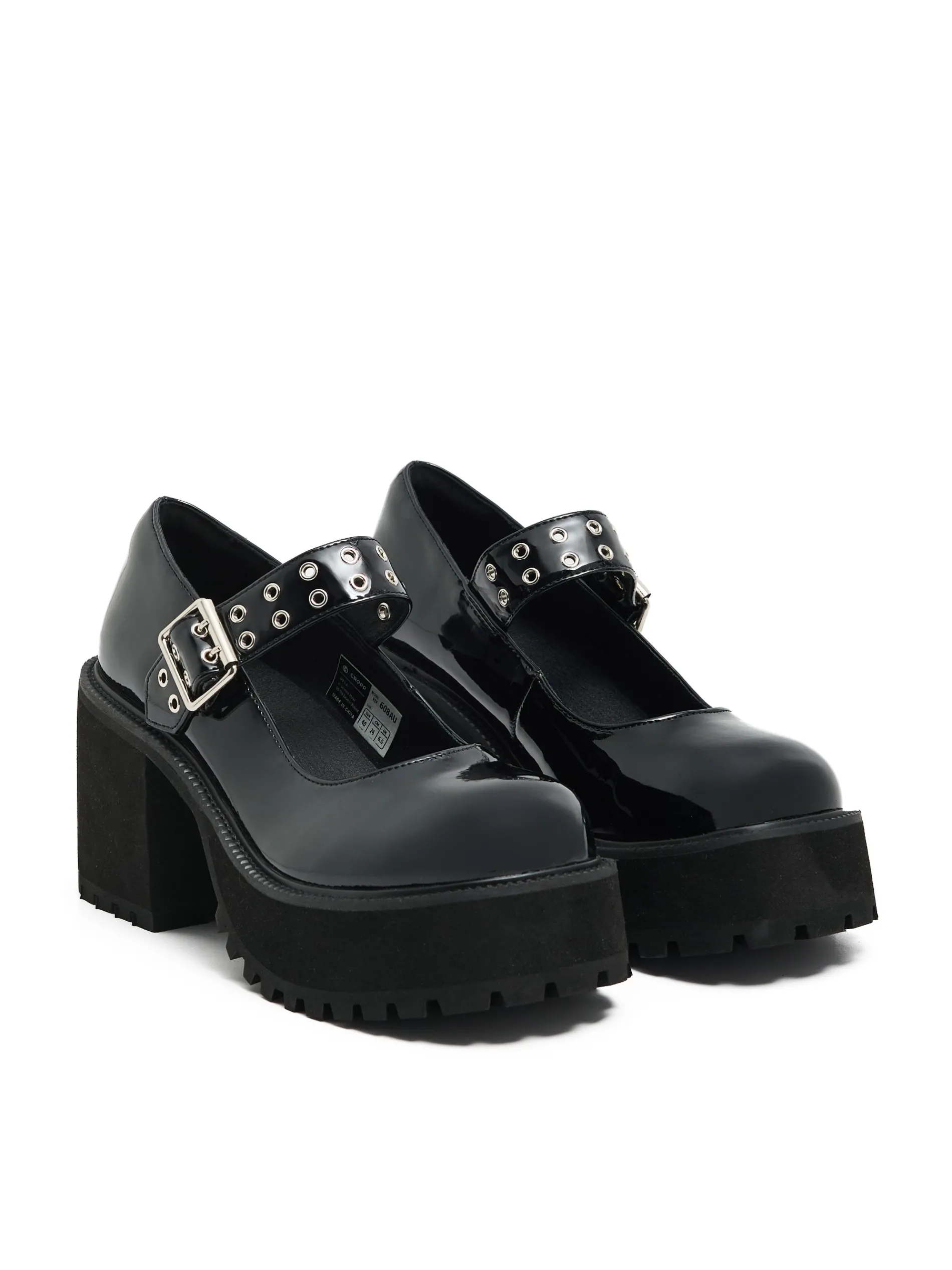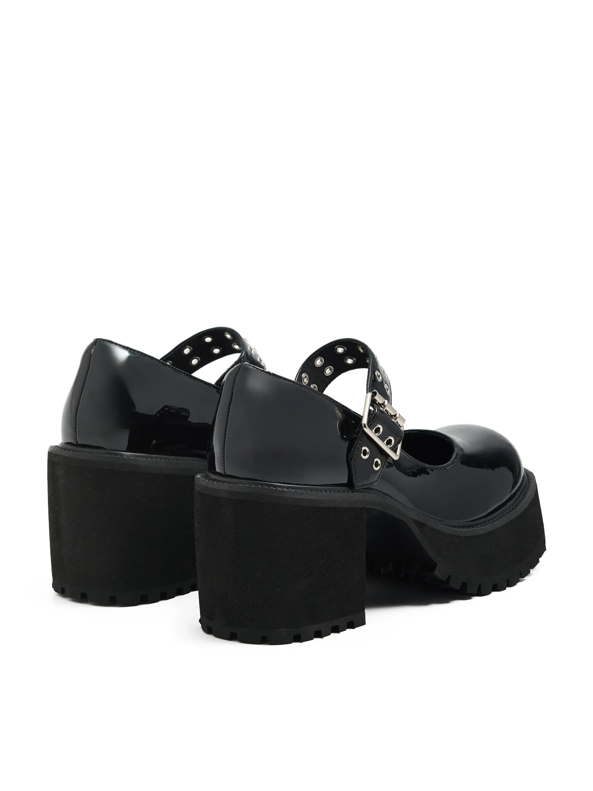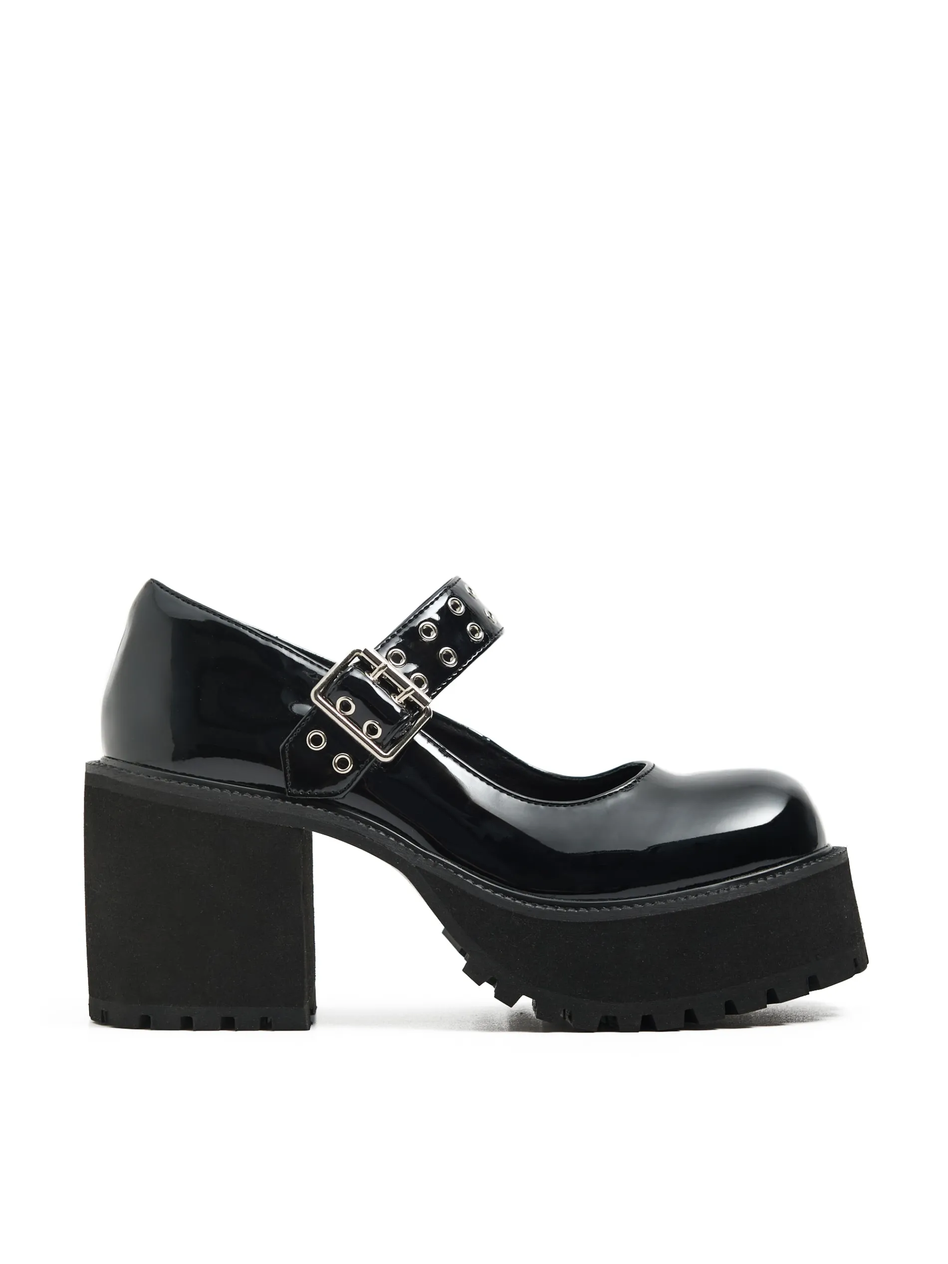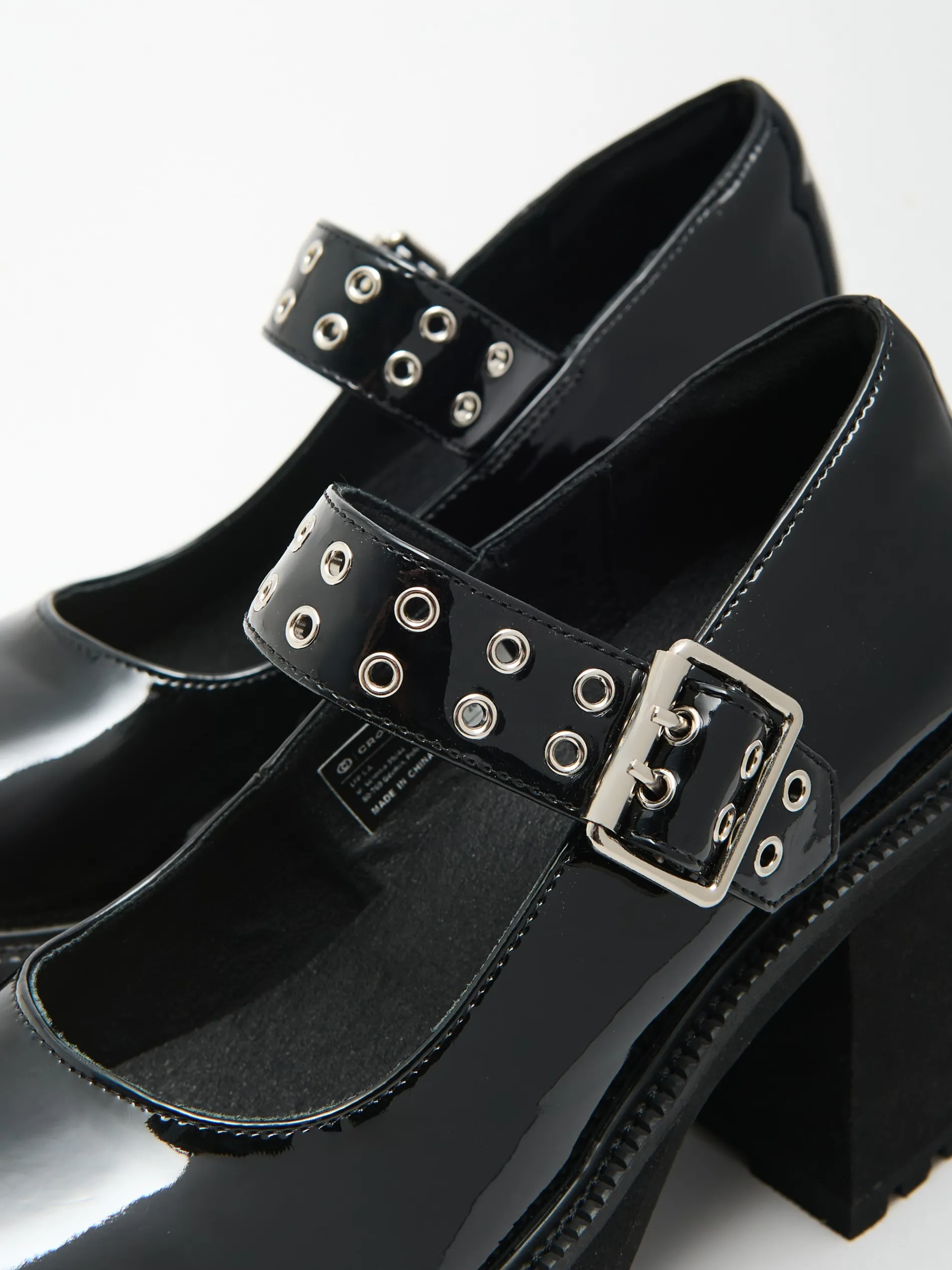 Przejściowe półbuty damskie typu Mary Jane w kolorze czarnym, wykonane z lakierowanej imitacji skóry. Ten model jako dodatek do stylizacji zwróci na siebie uwagę! lakierowana imitacja skóry traktorowa podeszwa z wysokim obcasem obcas w formie słupka pasek z podwójnym zapięciem ozdobne, metalowe wykończenie przy zapięciu