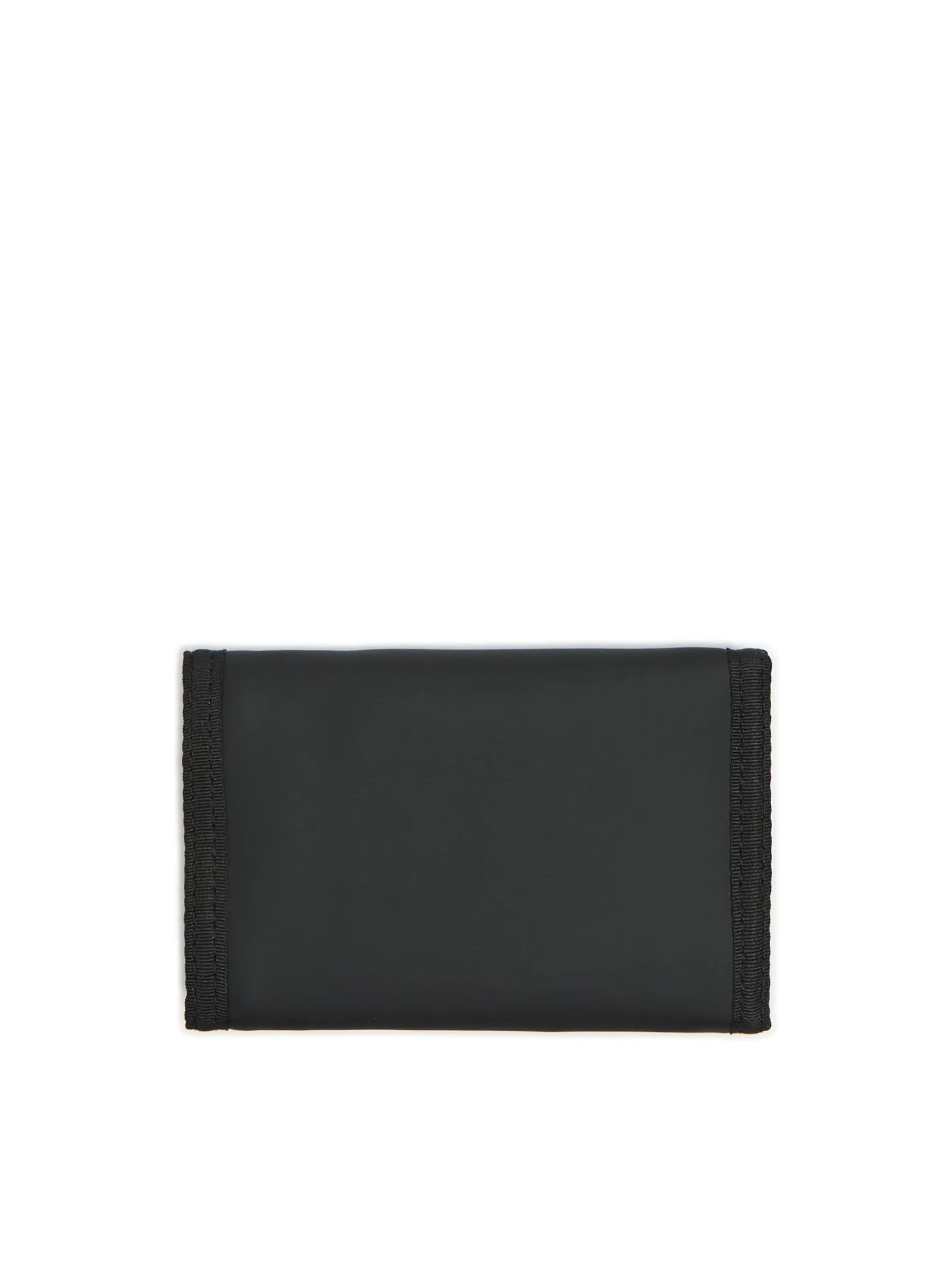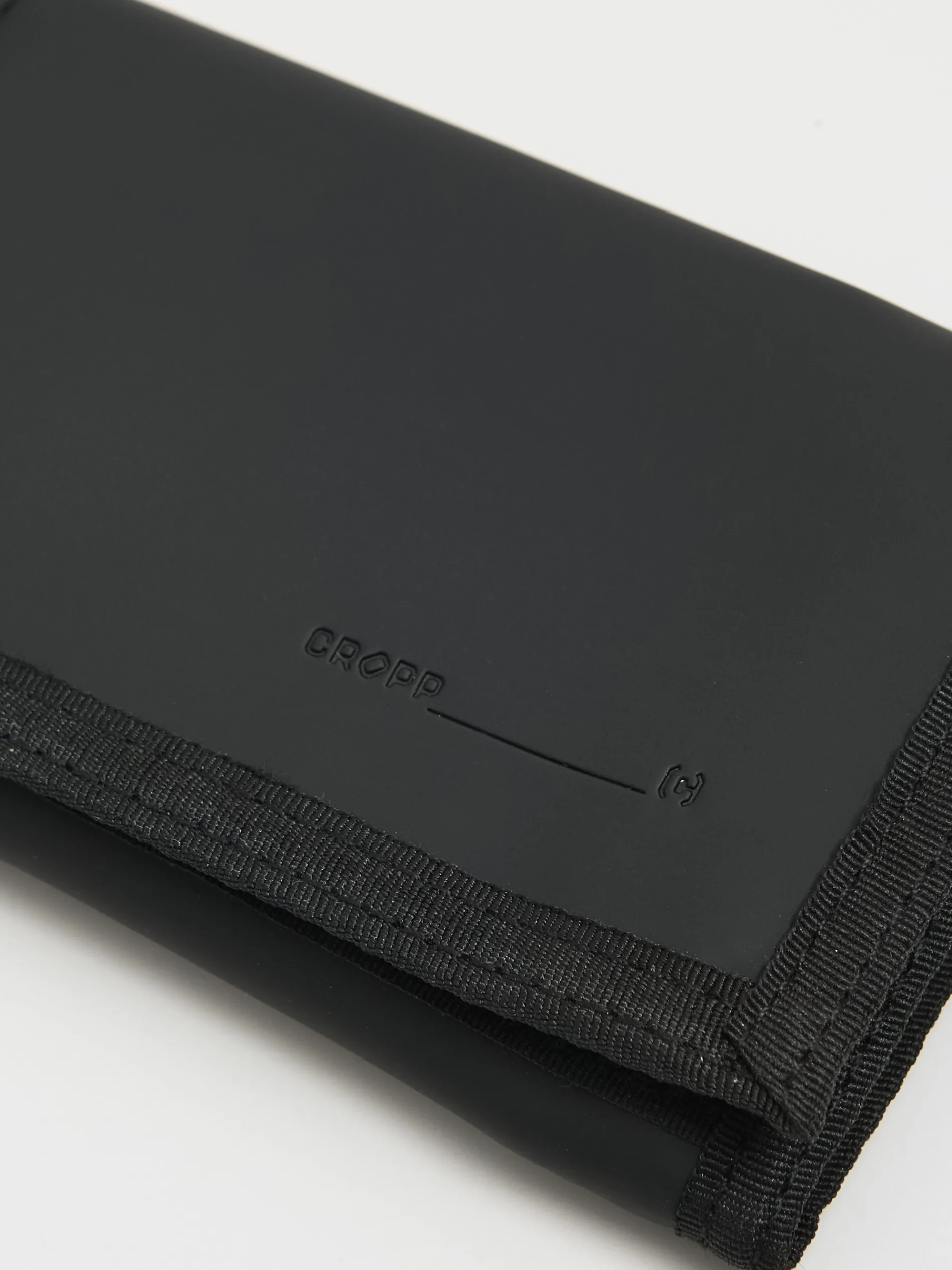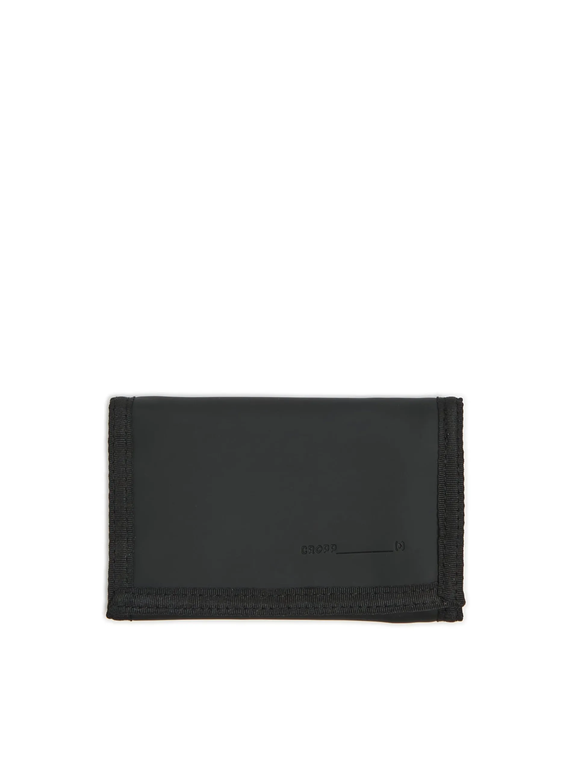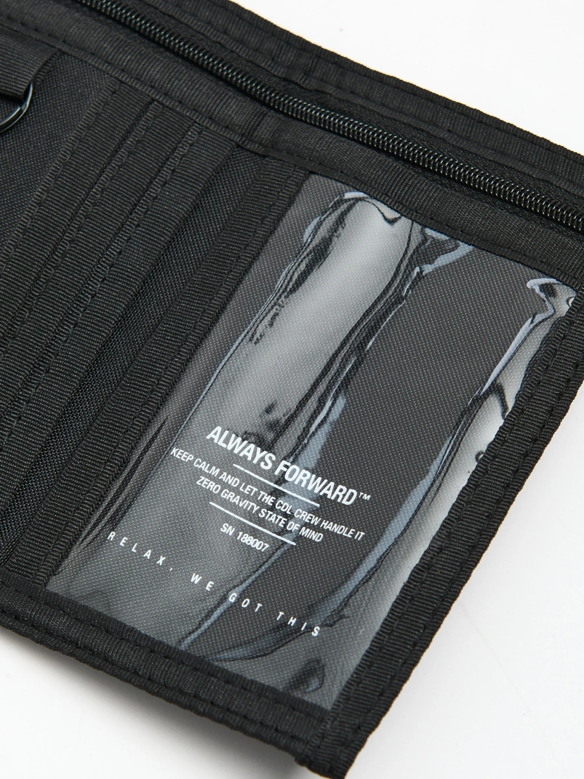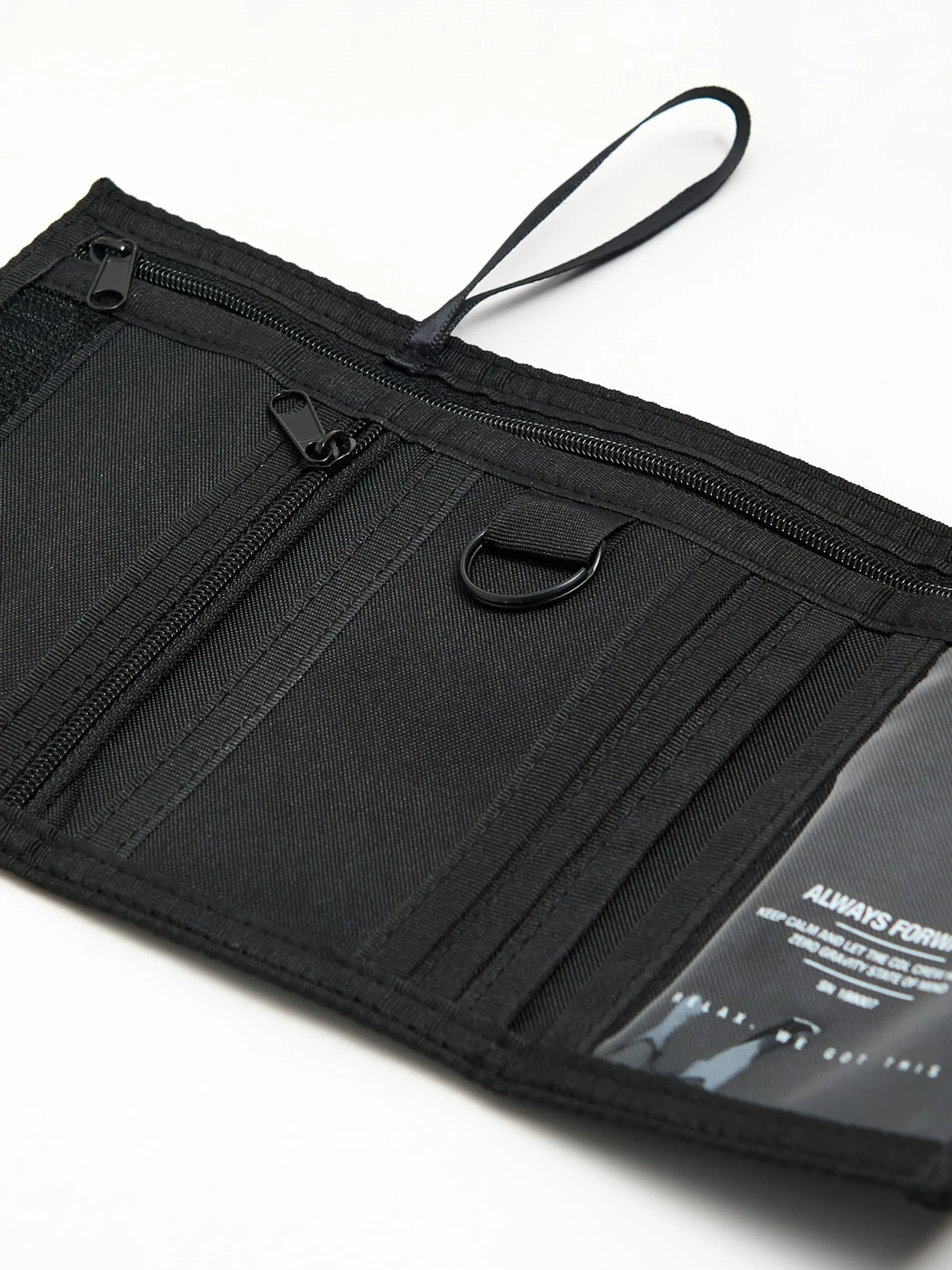 Duży męski portfel, z gładkiego czarnego tworzywa z brzegami obszytymi tkaniną. zapinane na suwak komory na monety liczne przegródki na banknoty i dokumenty niewielka funkcjonalna pętla oraz kółko do kluczy ozdobne wytłoczenie Wymiary produktu: 10 x 14 cm