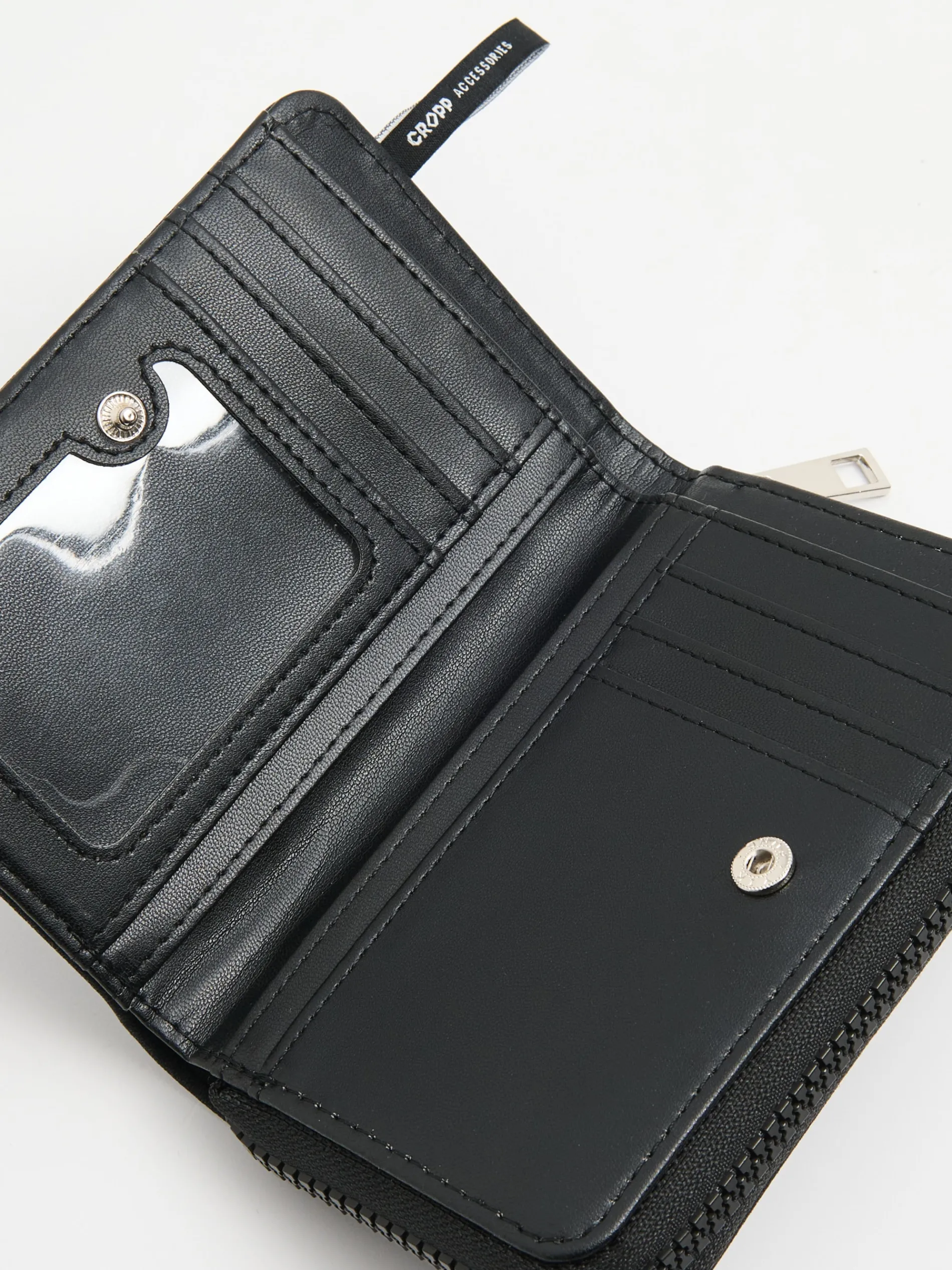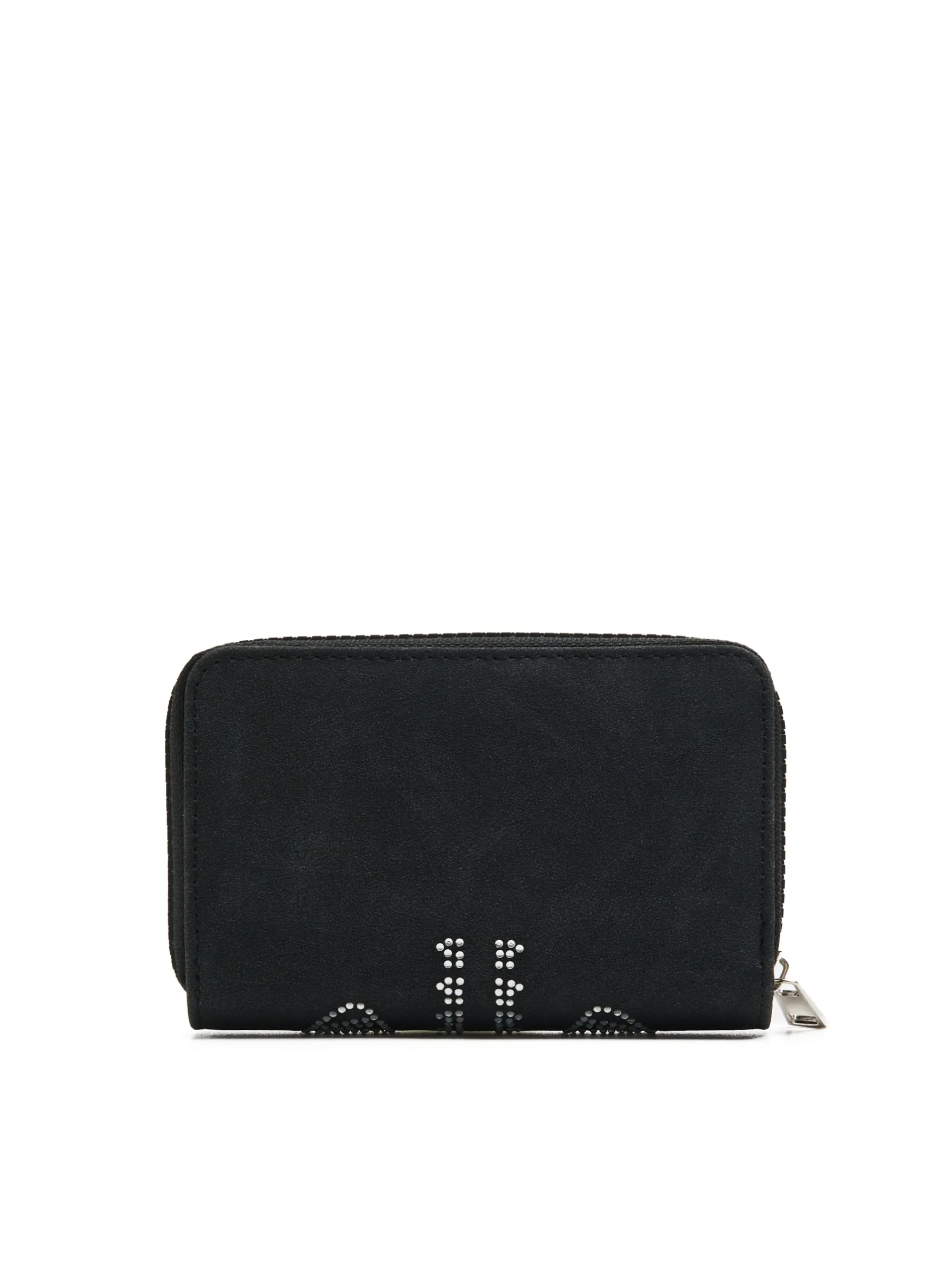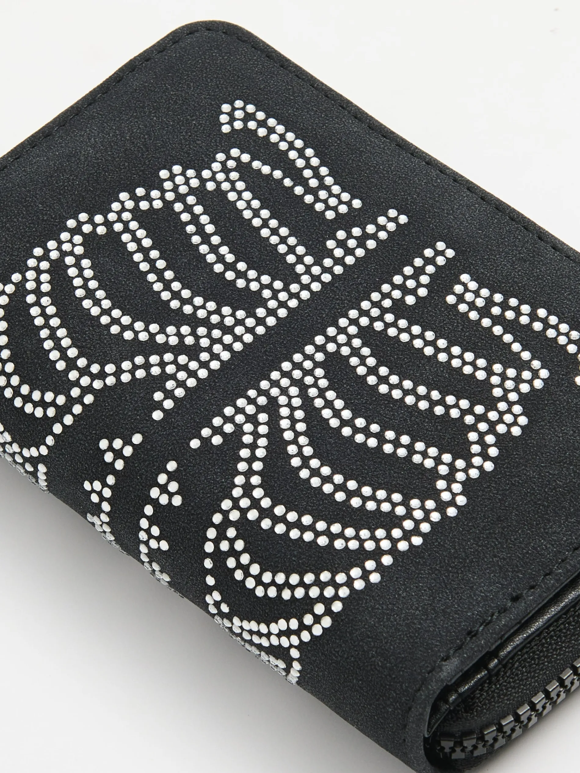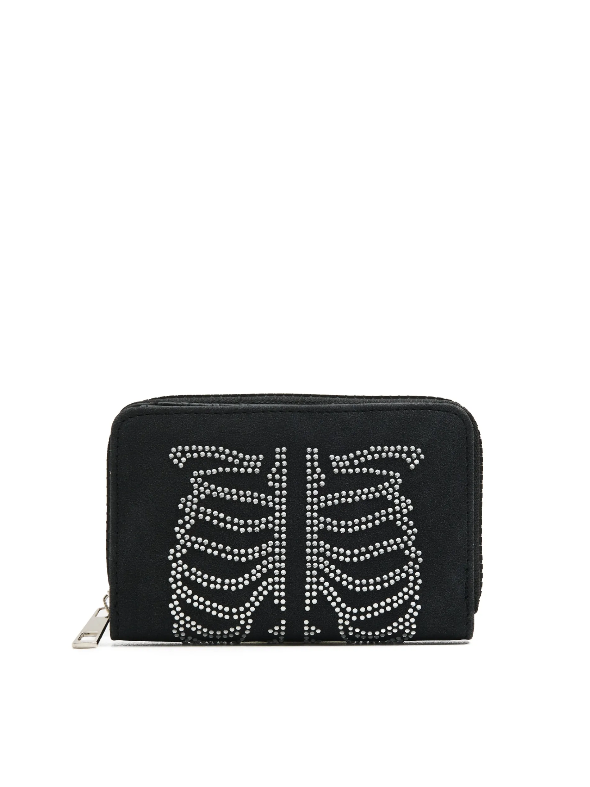 Czarny damski portfel wykonany z solidnego materiału z cekinową aplikacją w kształcie rentgena żeber. zapięcie na zatrzask główna komora z zapięciem na zamek praktyczne kieszenie wewnętrzne miejsce na karty, dokumenty i monety cekinowa aplikacja na przodzie naszywka Cropp