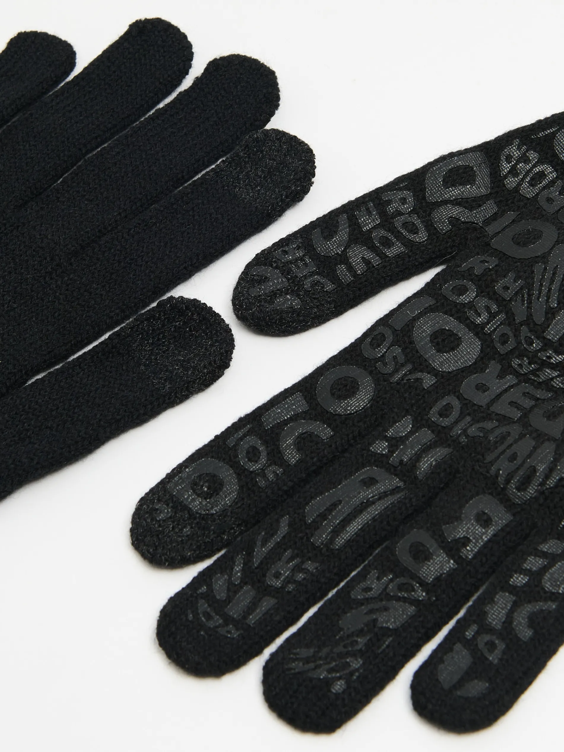 Pięciopalczaste męskie rękawiczki uszyte z trwałej, chroniącej przed wiatrem dzianiny w kolorze czarnym i tekstowymi nadrukami na całości. uszyte z trwałej, lekkiej tkaniny prosty krój z przodu nadruki tekstowe naszywka Cropp