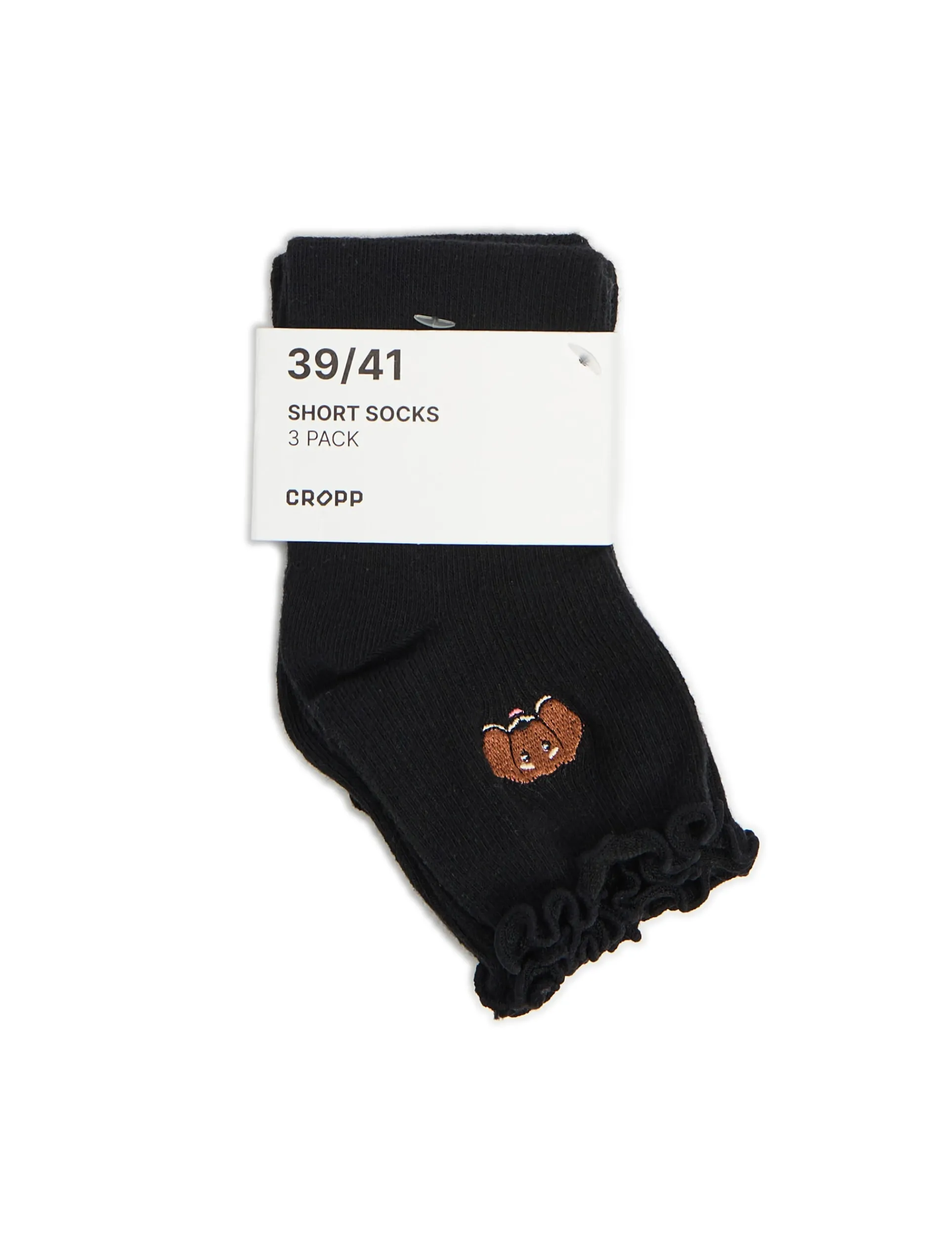 Trójpak damskich skarpetek o średniej długości, uszytych z dzianiny o wysokiej zawartości bawełny, wykończonych falbanką. Na każdej parze haft z uroczym jamnikiem!