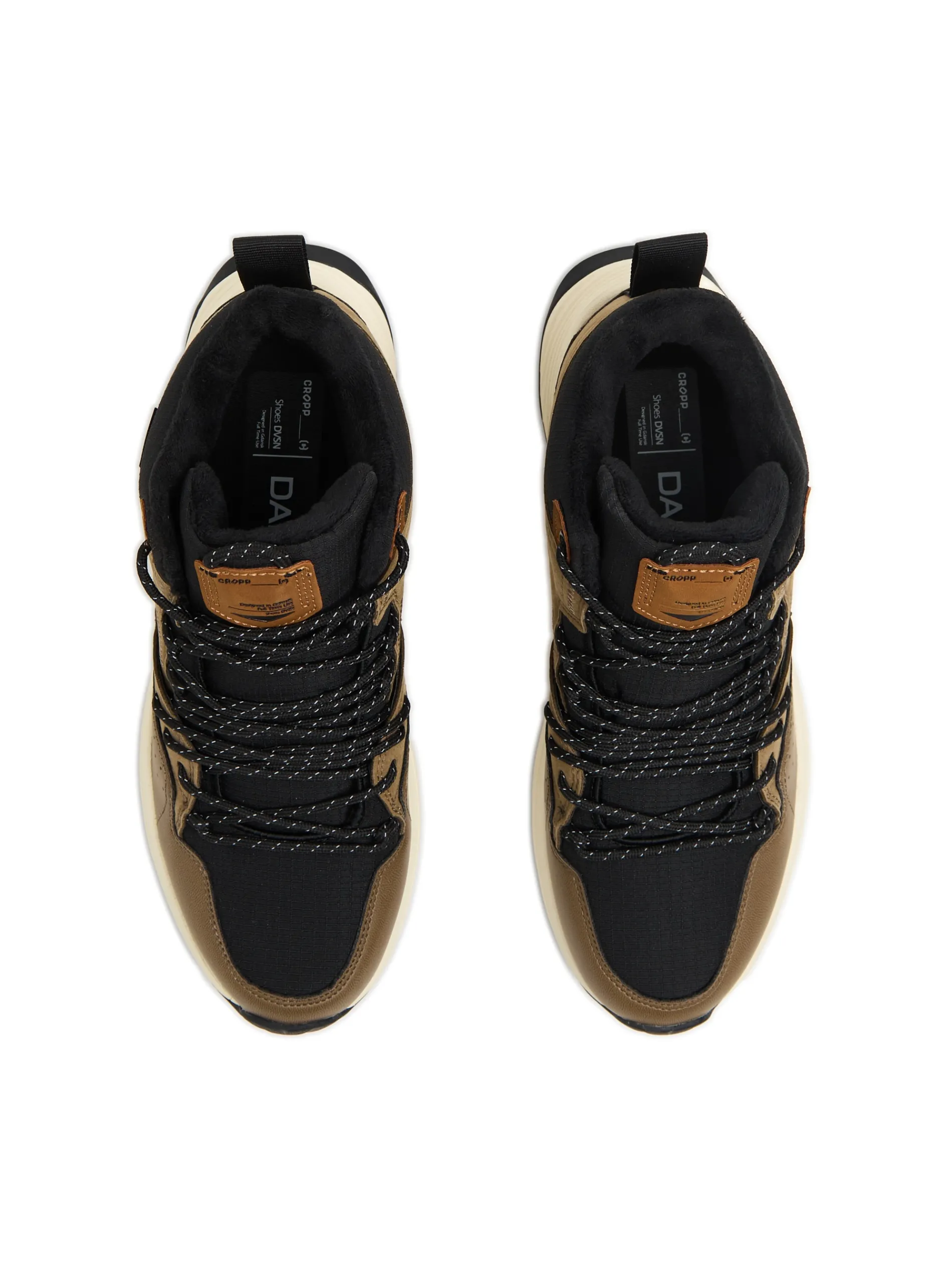 Łap wzmacniane męskie buty typu sneakersy z wysoką cholewką. Solidna dwukolorowa podeszwa wykonana z mieszanki gumy i phylonu. Gąbkowanie wokół kostki i języka zapewnia ciepło i amortyzację. Wejdź w zimę na pełnej! sznurowane sneakersy w sportowym stylu cholewka ze wstawkami ze sztucznej skóry delikatne wypustki po bokach usprawniające przepływ powietrza lekkie gąbkowanie wokół kostki wypełniony język dla lepszej amortyzacji stopy nieszablonowe wiązanie na prążkowane, okrągłe sznurówki solidna, płaska podeszwa wykonana z phylonu z gumowymi elementami wzmacniany nosek zwiększający ochronę przed zużyciem wygodny uchwyt do wkładania i zdejmowania butów ozdobne naszywki naszywka Cropp