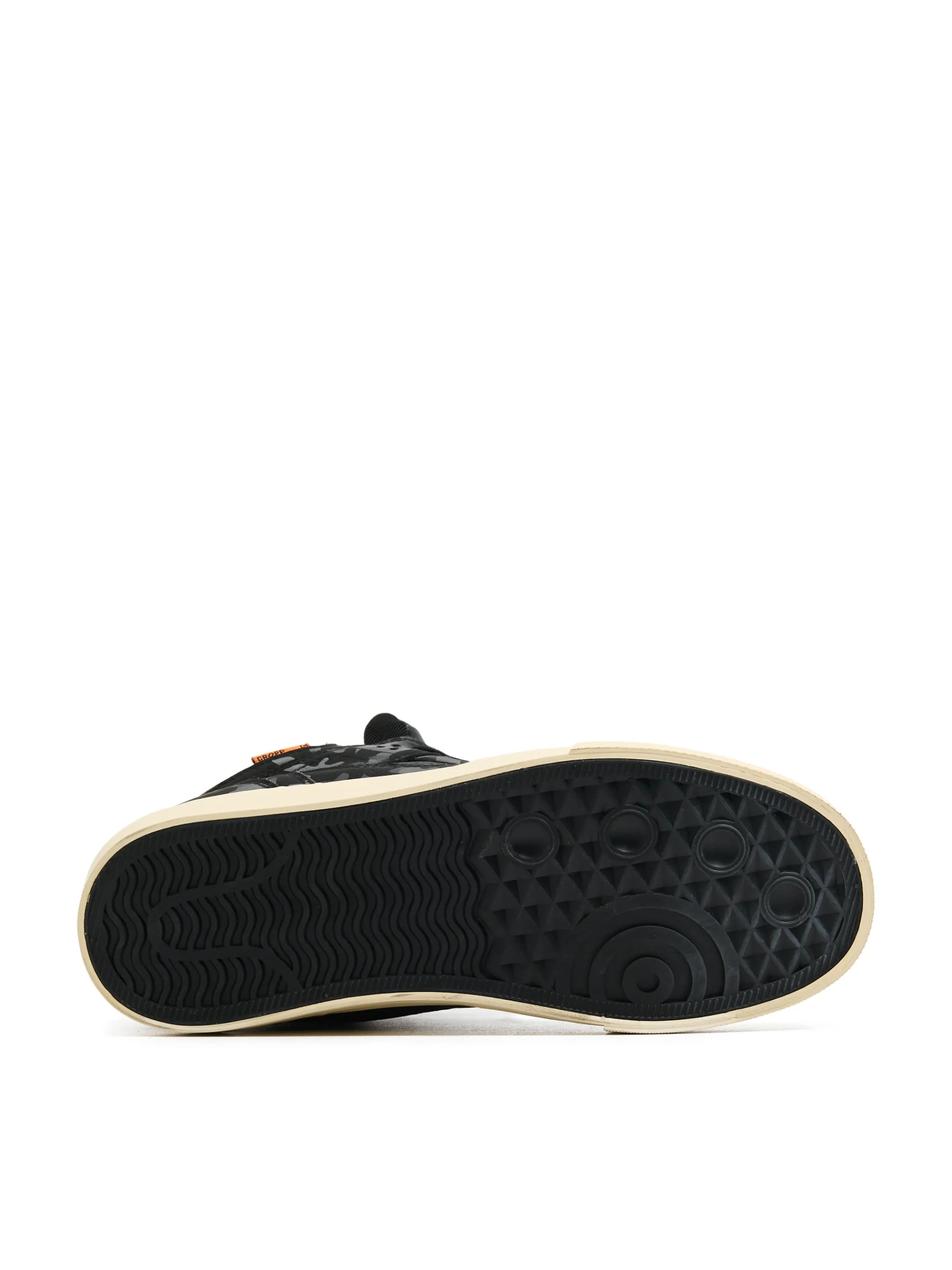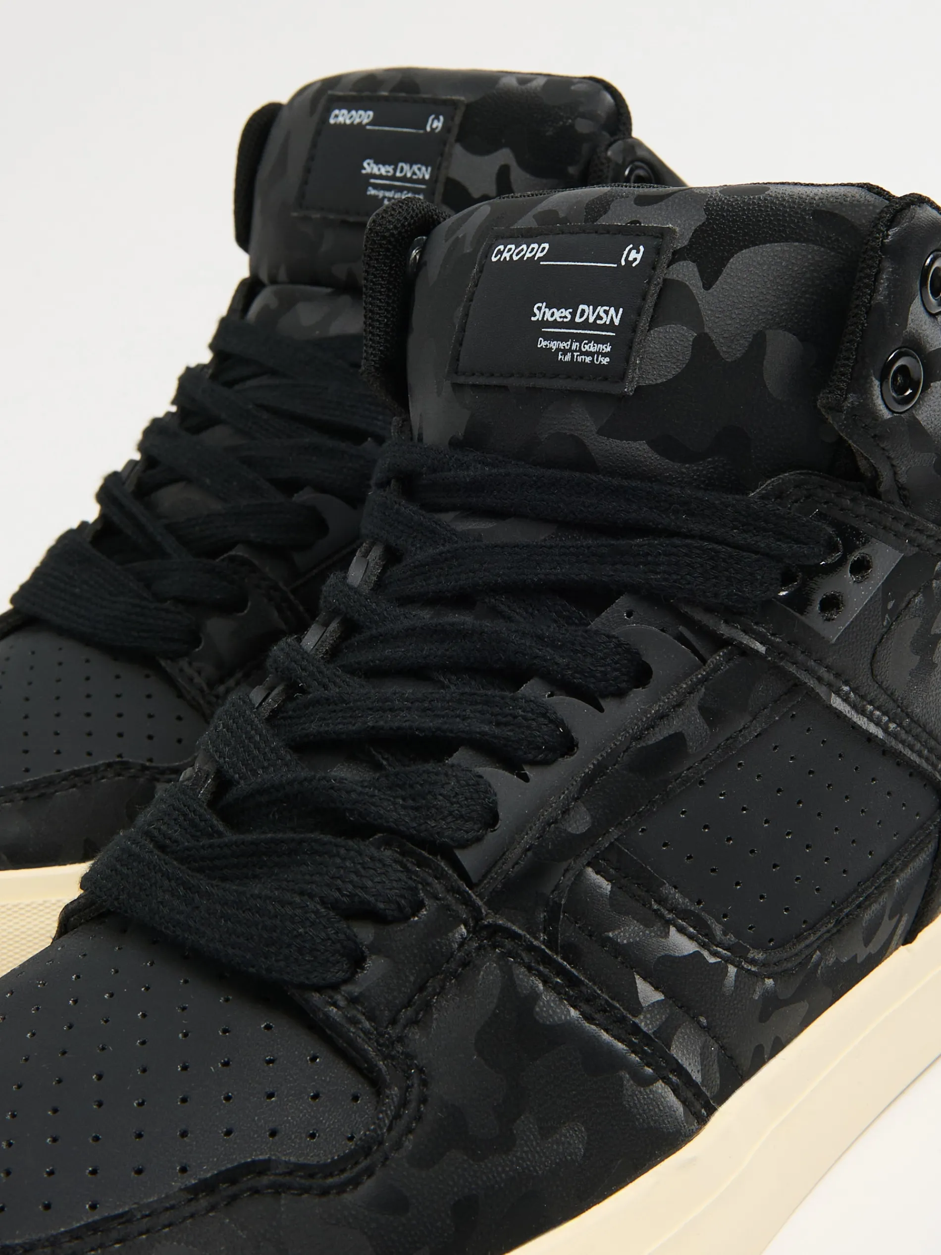 Męskie buty typu sneakersy za kostkę, wykonane z łączonych, solidnych materiałów. Cholewka z militarnym wzorem uzupełniona kontrastową gumową podeszwą. Idealne na bujanie się po dzielni w sezonie przejściowym. przejściowe sneakersy z łączonych materiałów cholewka za kostkę z dekoracyjnym nadrukiem gruba podeszwa z syntetycznej gumy wiązane na płaskie, czarne sznurowadła wzór moro all over