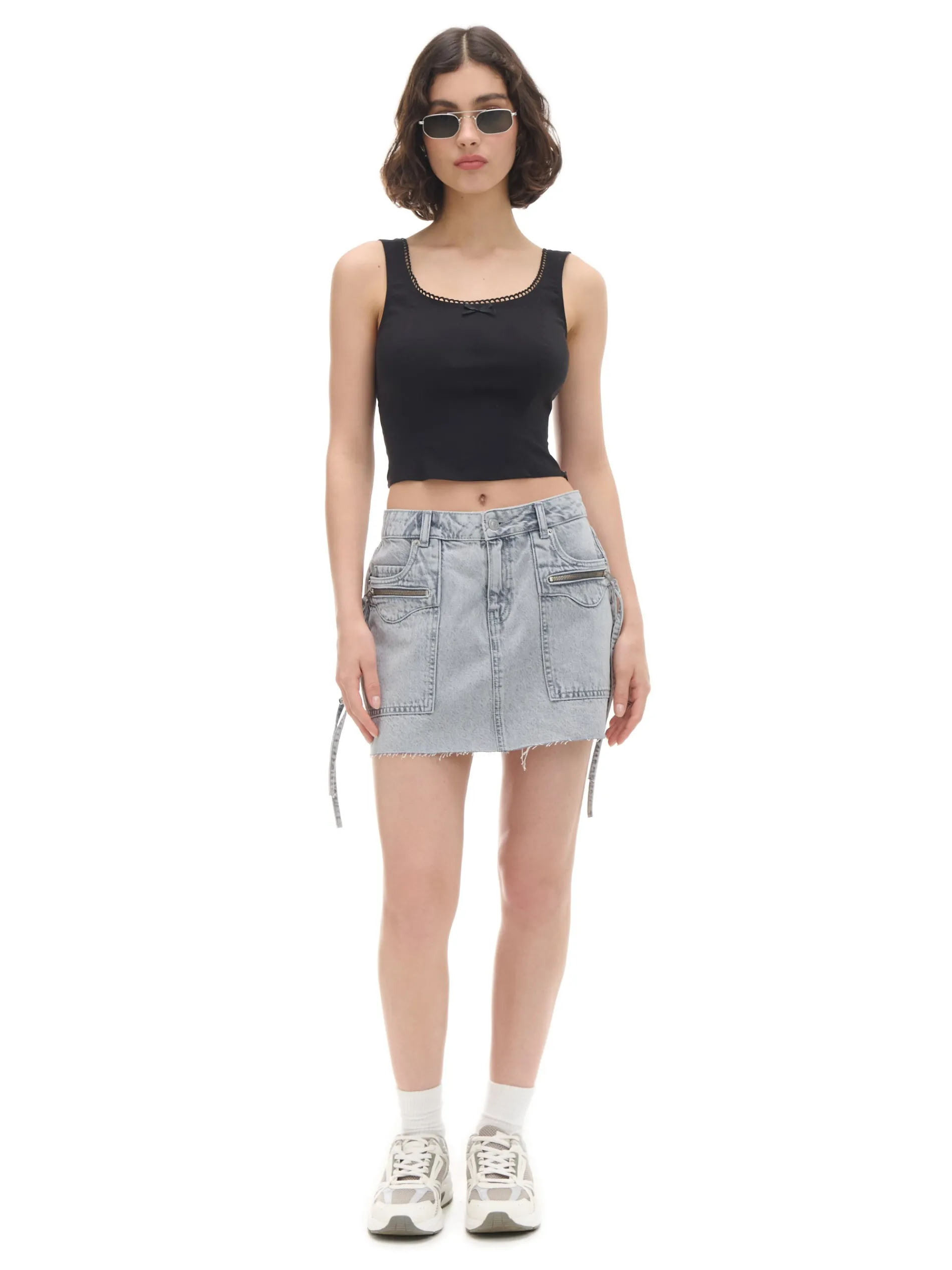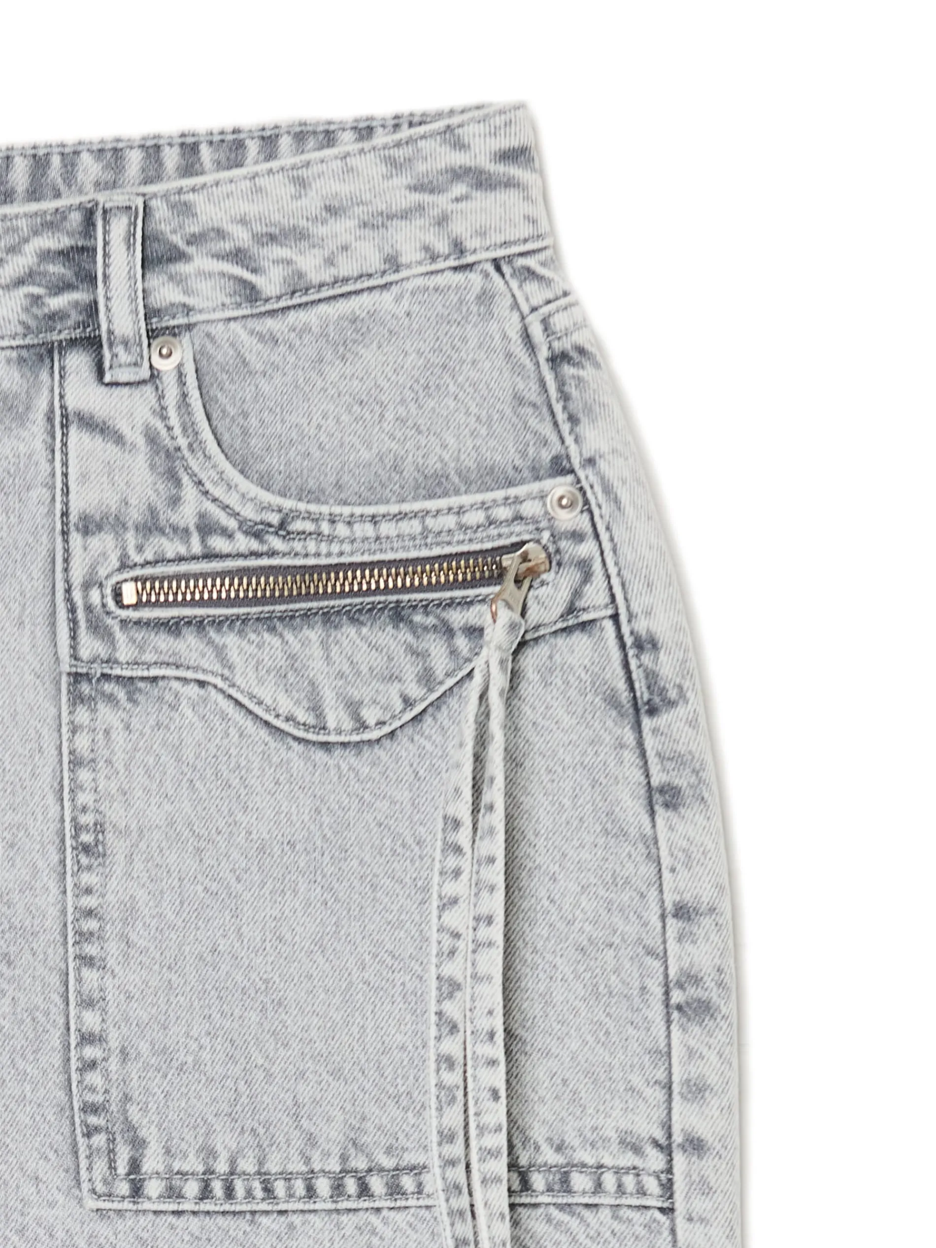 Damska spódnica o długości mini, uszyta z bawełny. Ozdobą tego modelu są frędzle z tego samego materiału przy kieszeniach. denim o szarym odcieniu z delikatnym efektem sprania długość mini zapięcie na zamek i guzik cztery funkcyjne kieszenie, w tym dwie z zapięciem na zamek dwie naszyte kieszenie tylnie surowe wykończenie brzegów ozdobne frędzle przy zamkach Wzrost modelki: 172 cm