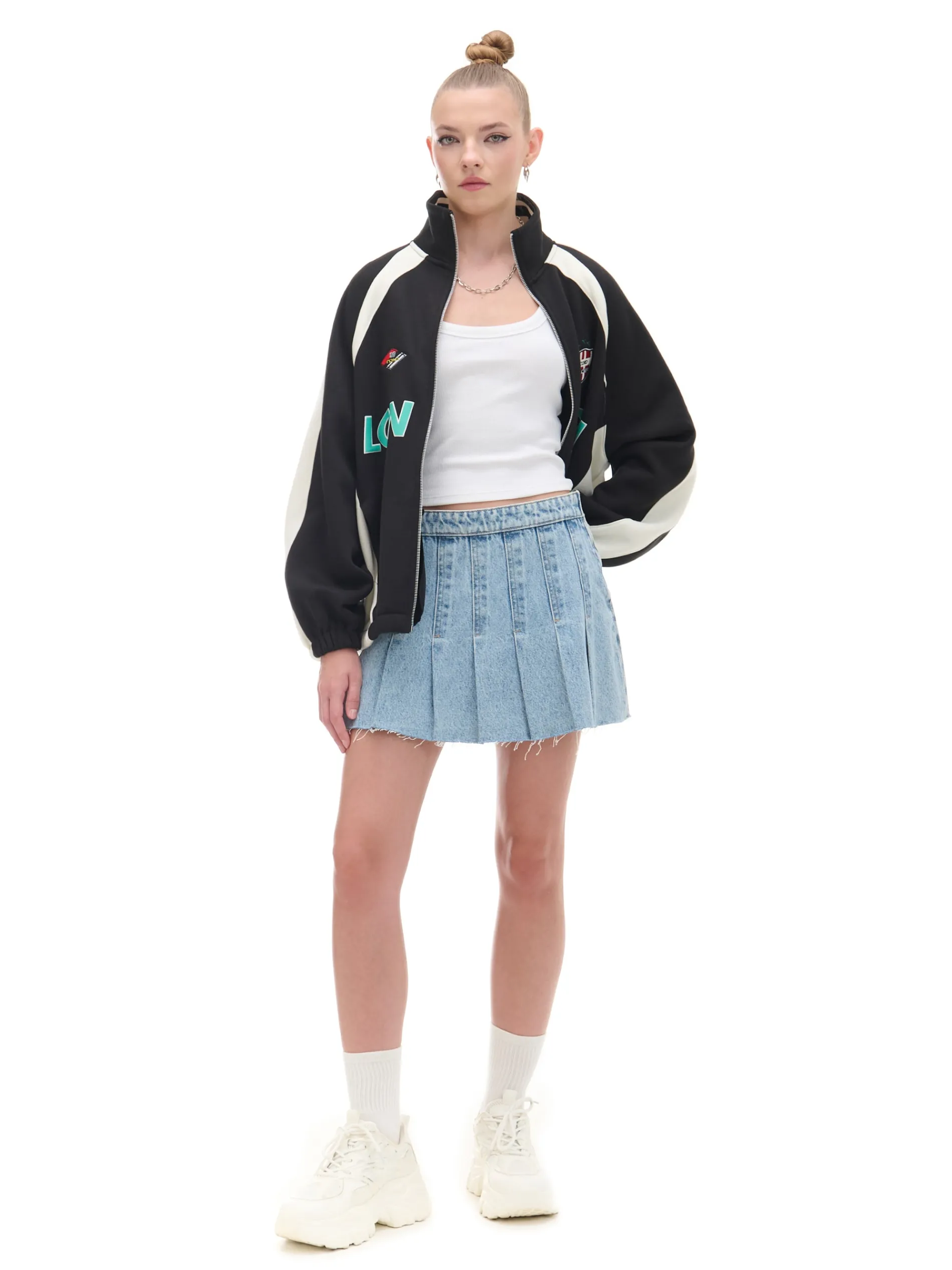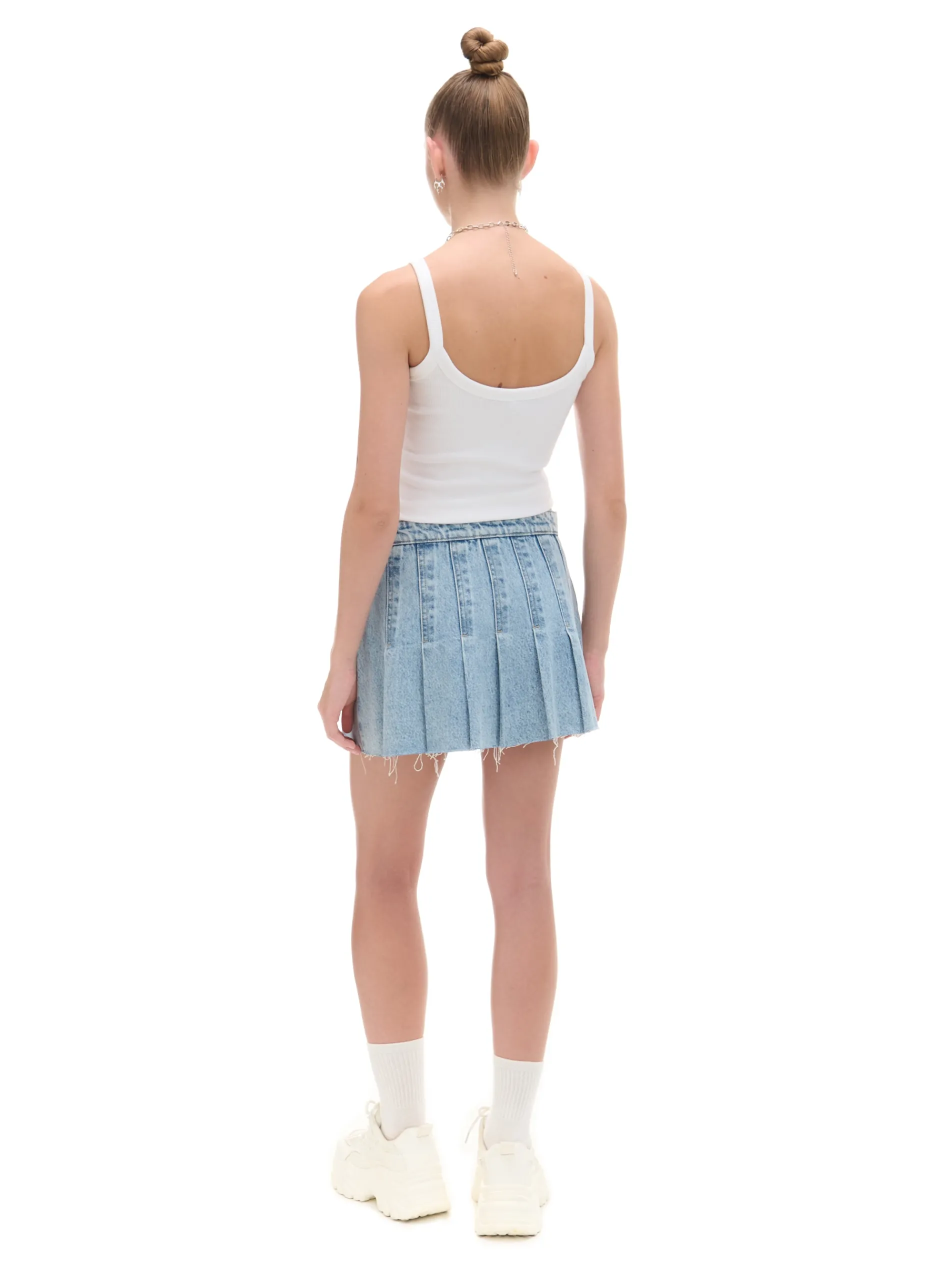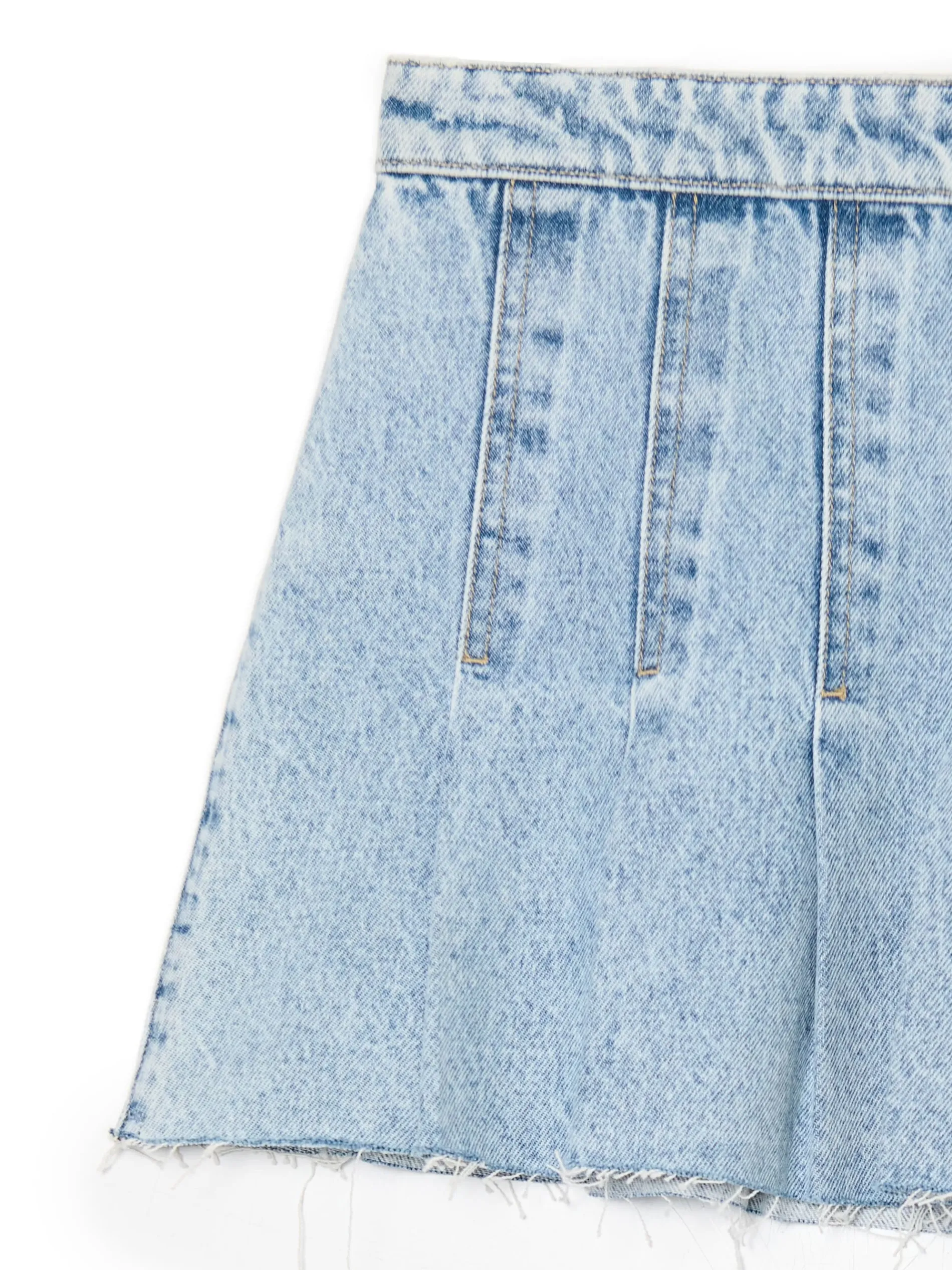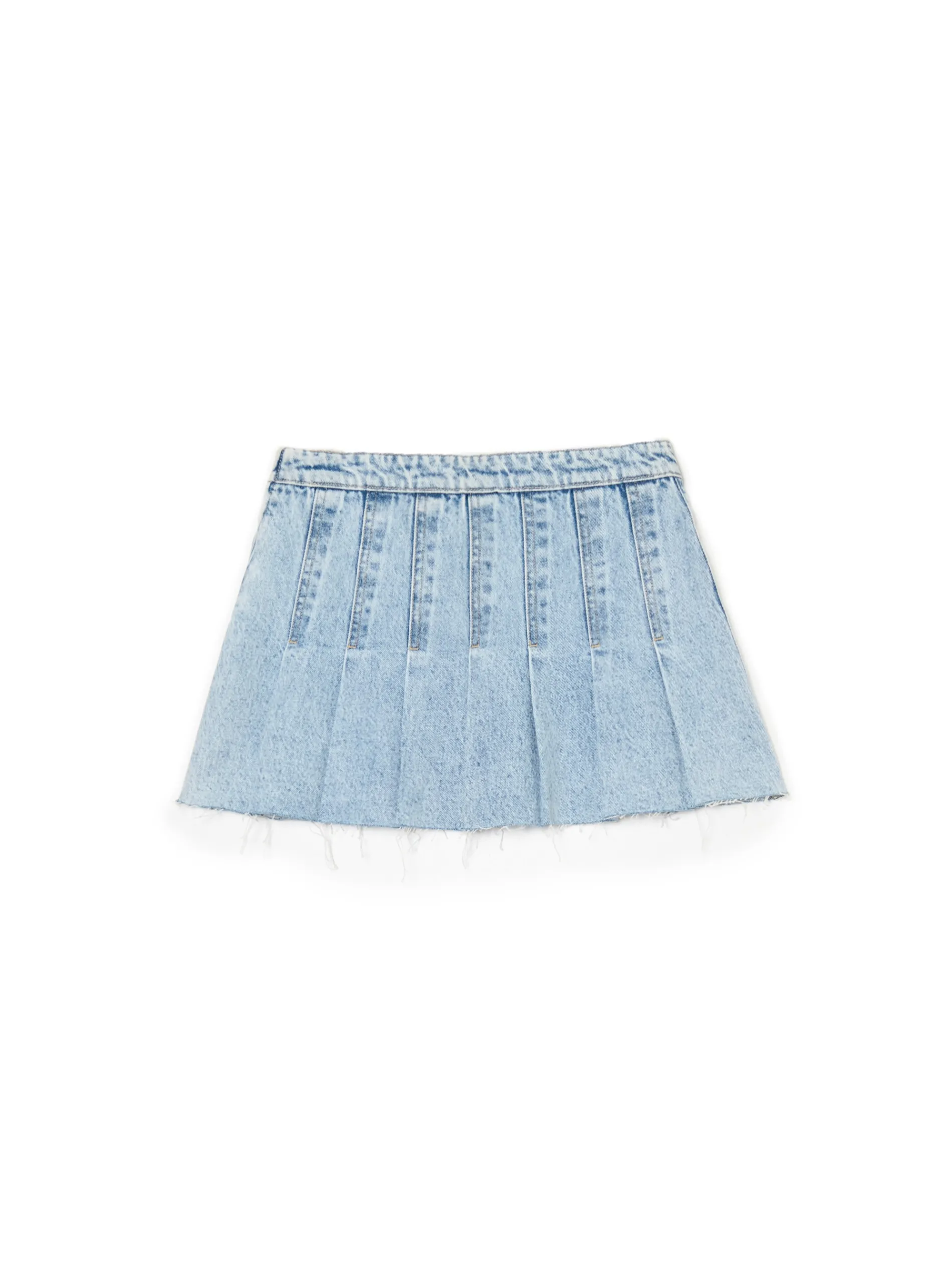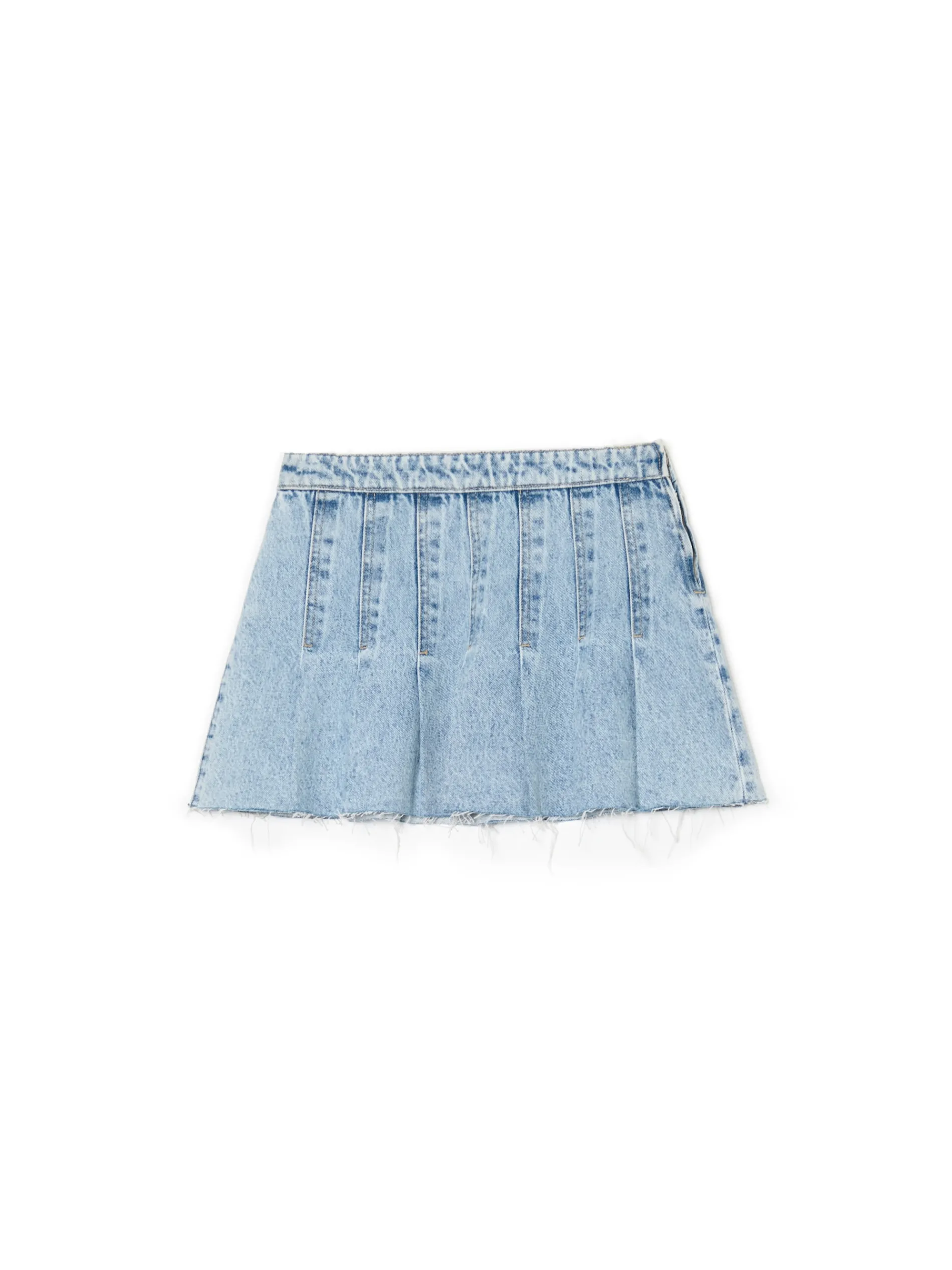 Spódnica damska o długości mini, uszyta z trwałego denimu. Ozdobne zakładki, postrzępienia i efekt sprania nadają jej streetowego vibe’u. 100% bawełny długość mini zapięcie na kryty zamek z boku plisy na całej długości ozdobne zakładki surowe wykończenie brzegów efekt sprania
