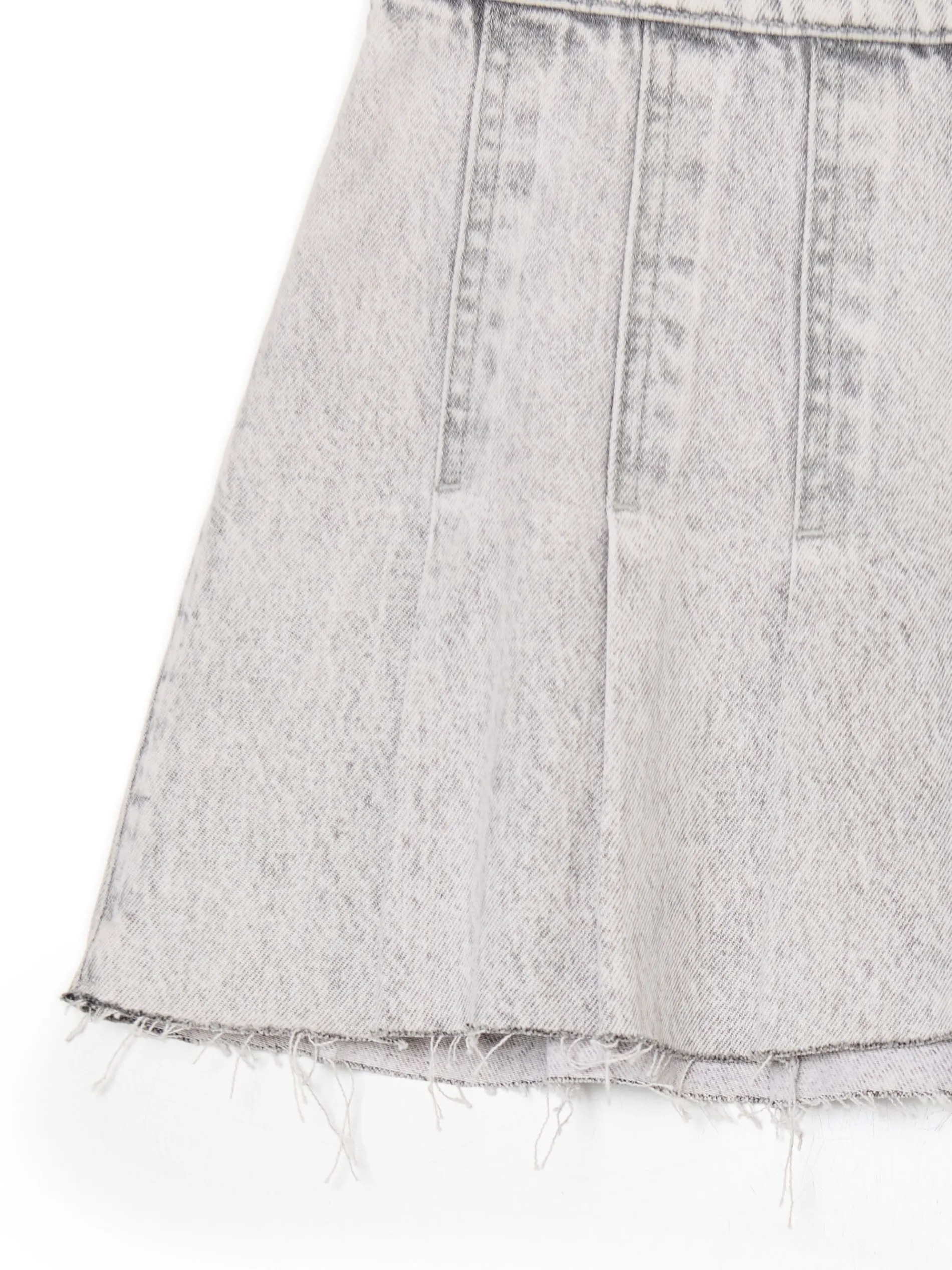 Spódnica damska o długości mini, uszyta w 100% z bawełnianej tkaniny. Ozdobne zakładki, postrzępienia i efekt sprania nadają jej streetowego vibe’u. denim o szarym odcieniu z delikatnym efektem sprania długość mini zapięcie na kryty zamek z boku plisy na całej długości ozdobne zakładki surowe wykończenie brzegów