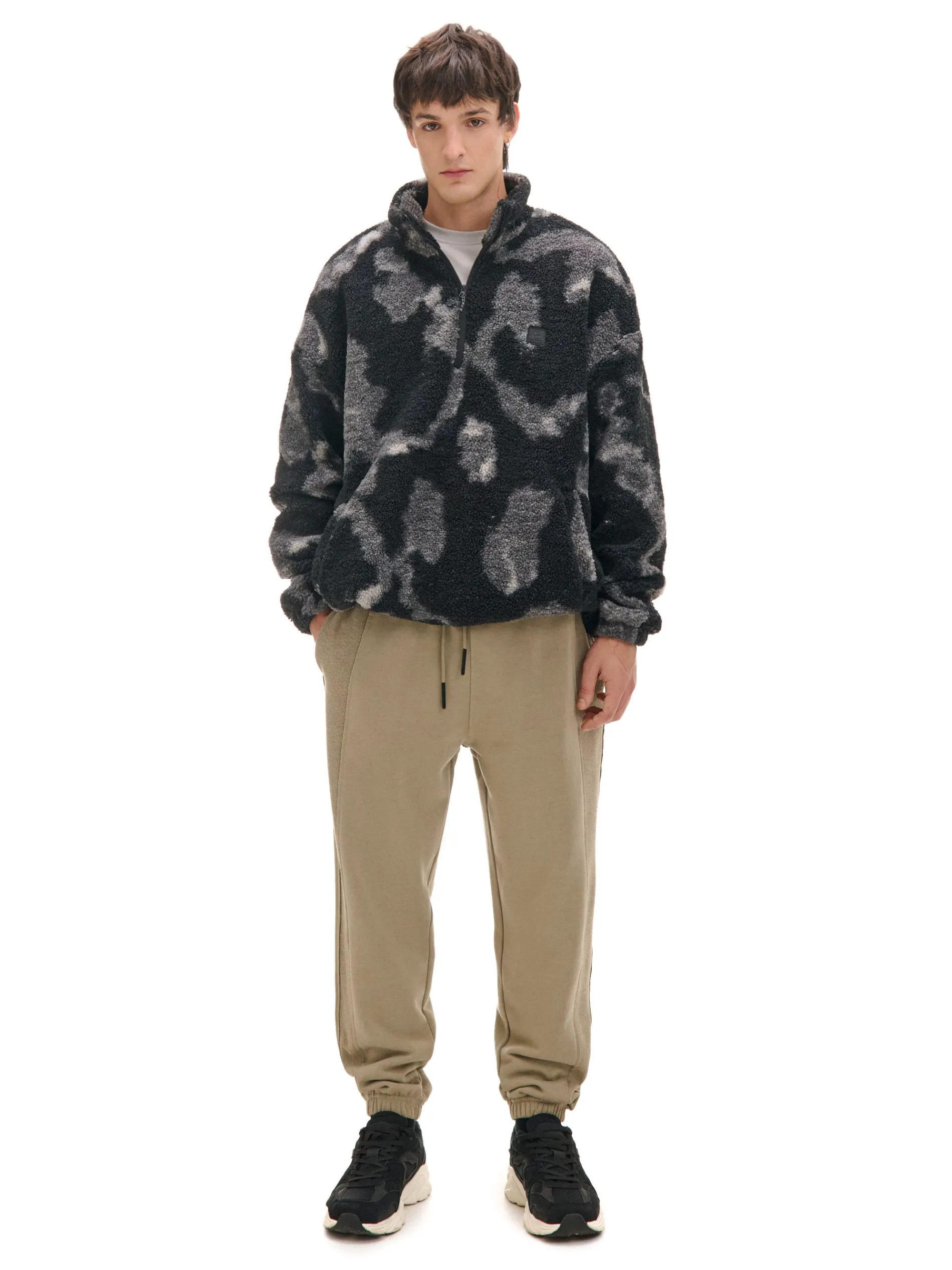 Męskie spodnie w beżowym kolorze, uszyte z mieszanki dzianin z dodatkiem bawełny french terry. W tym modelu ozdobne postrzępienia i lampasy na całej długości nogawek zwracają na siebie uwagę. dzianinowy materiał z bawełną wygodny krój comfort guma w pasie ze sznurkiem do regulacji dekoracyjne troczki z gładkiej tkaniny nogawka ze ściągaczem i lampasem dwie kieszenie z przodu naszywana kieszeń z tyłu ozdobne postrzępienia przy kieszeni