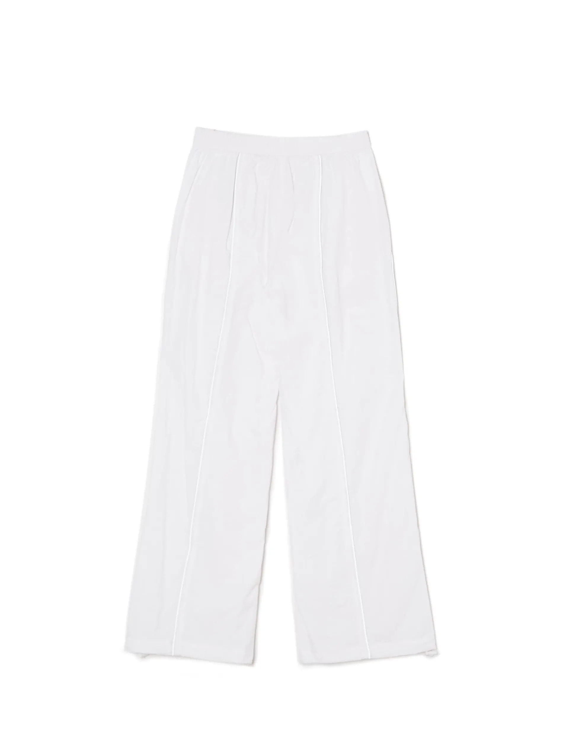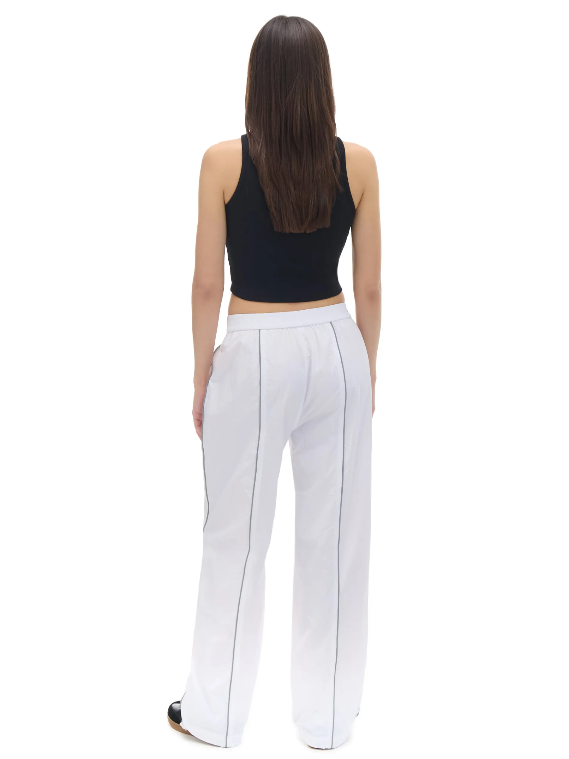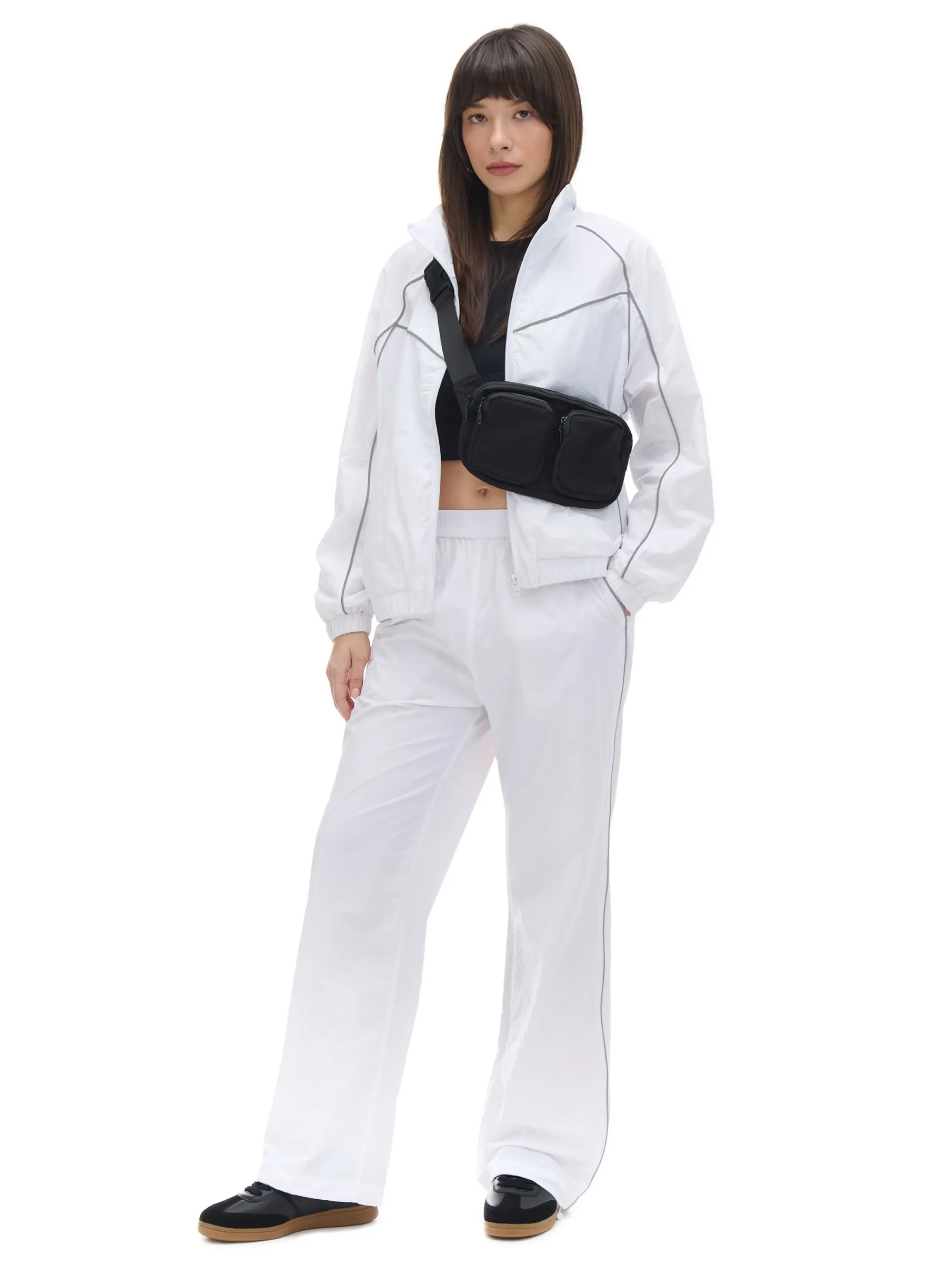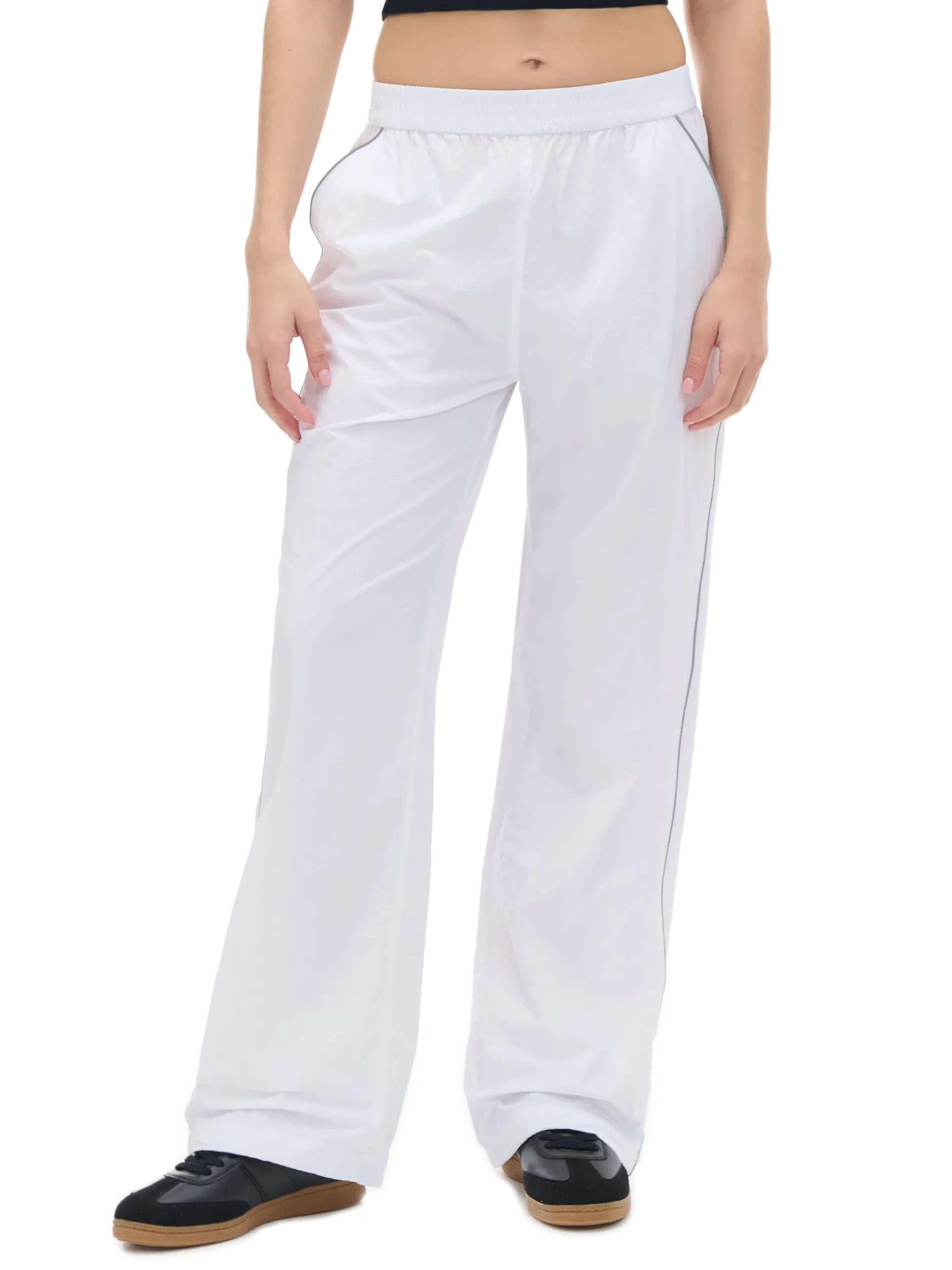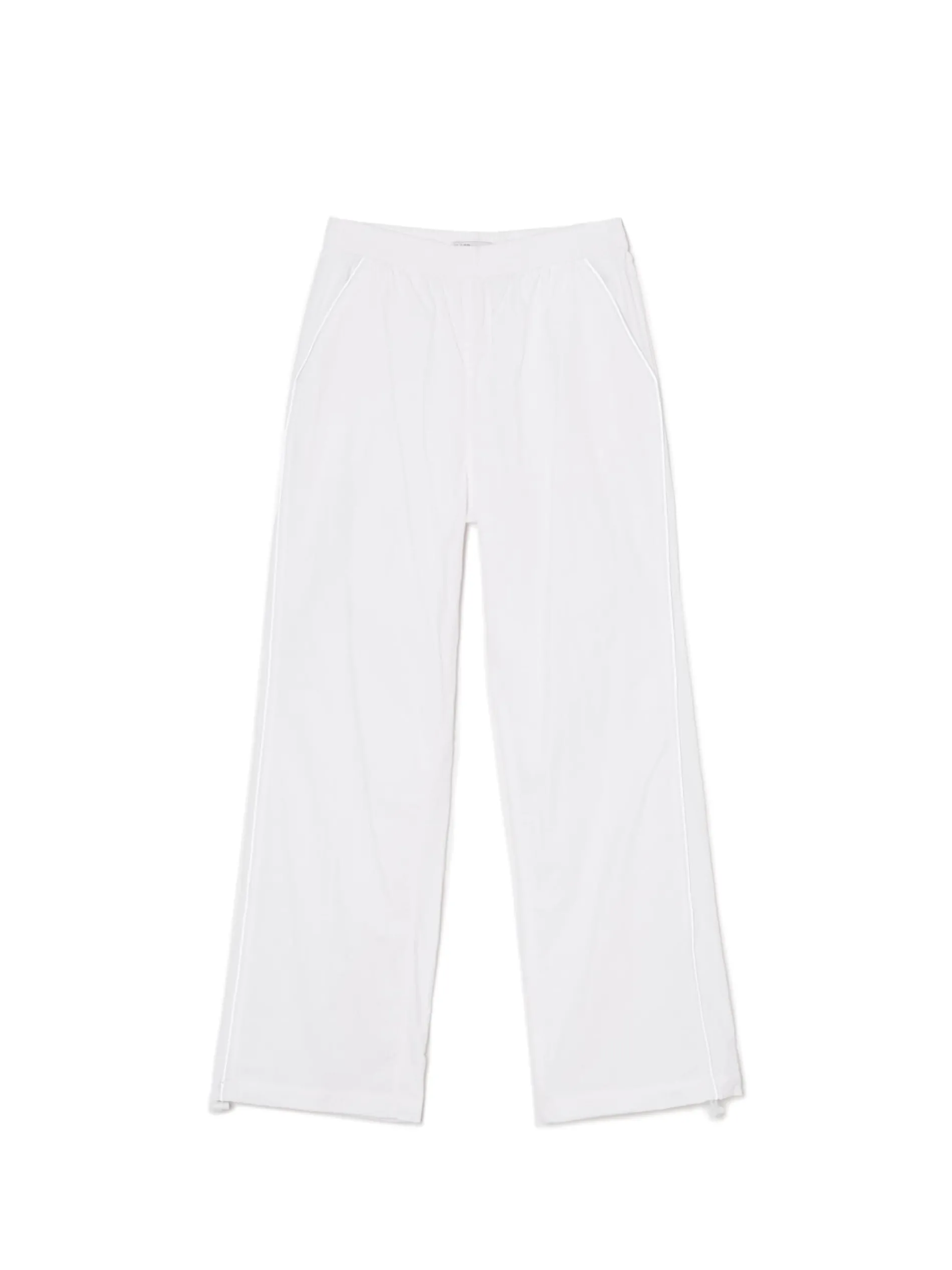 Damskie spodnie typu jogger z białej, trwałej tkaniny. Dodatkowo 2 kieszenie, ściągacze przy nogawkach ze stoperami i lampasy z efektem reflective.