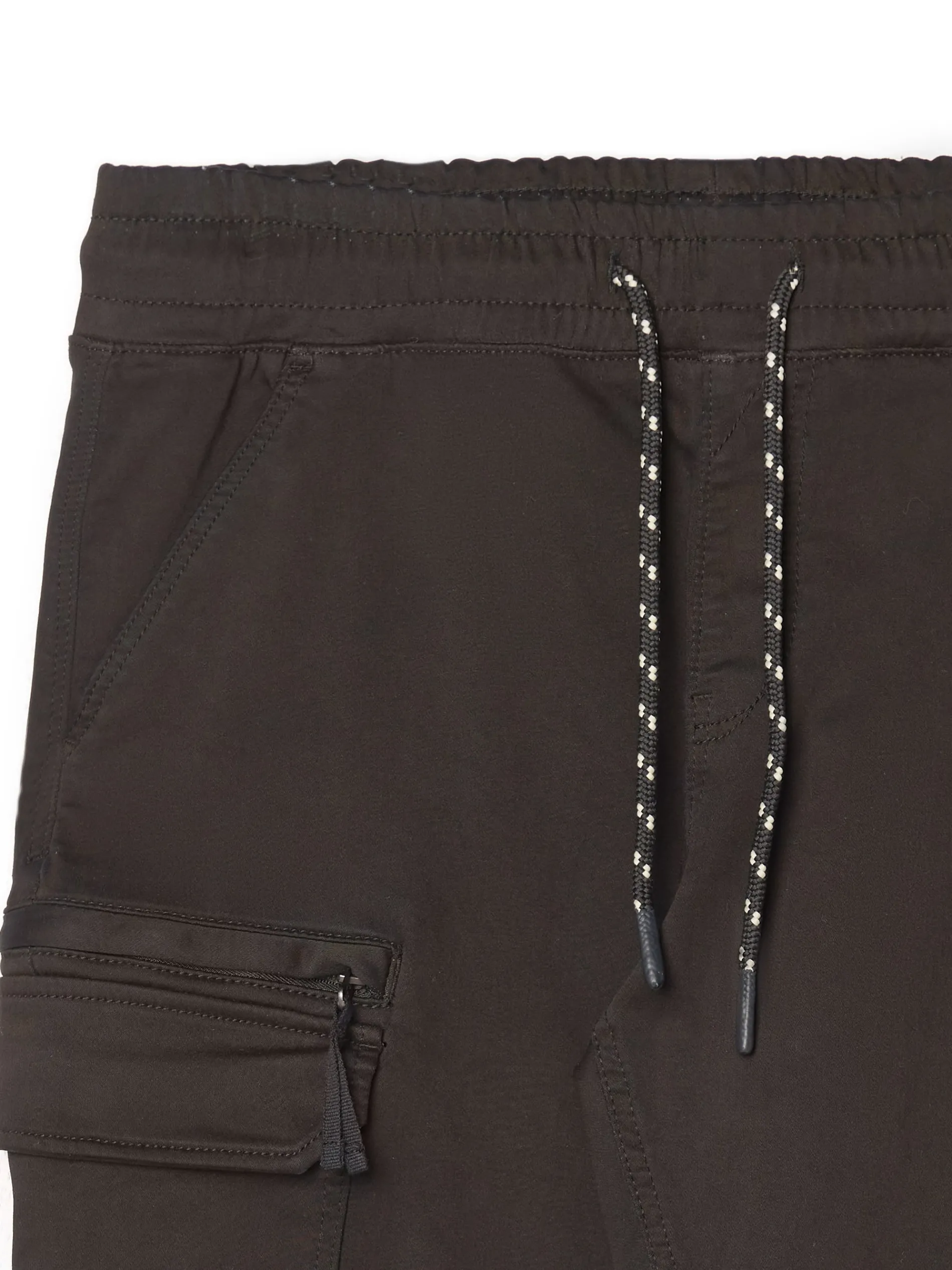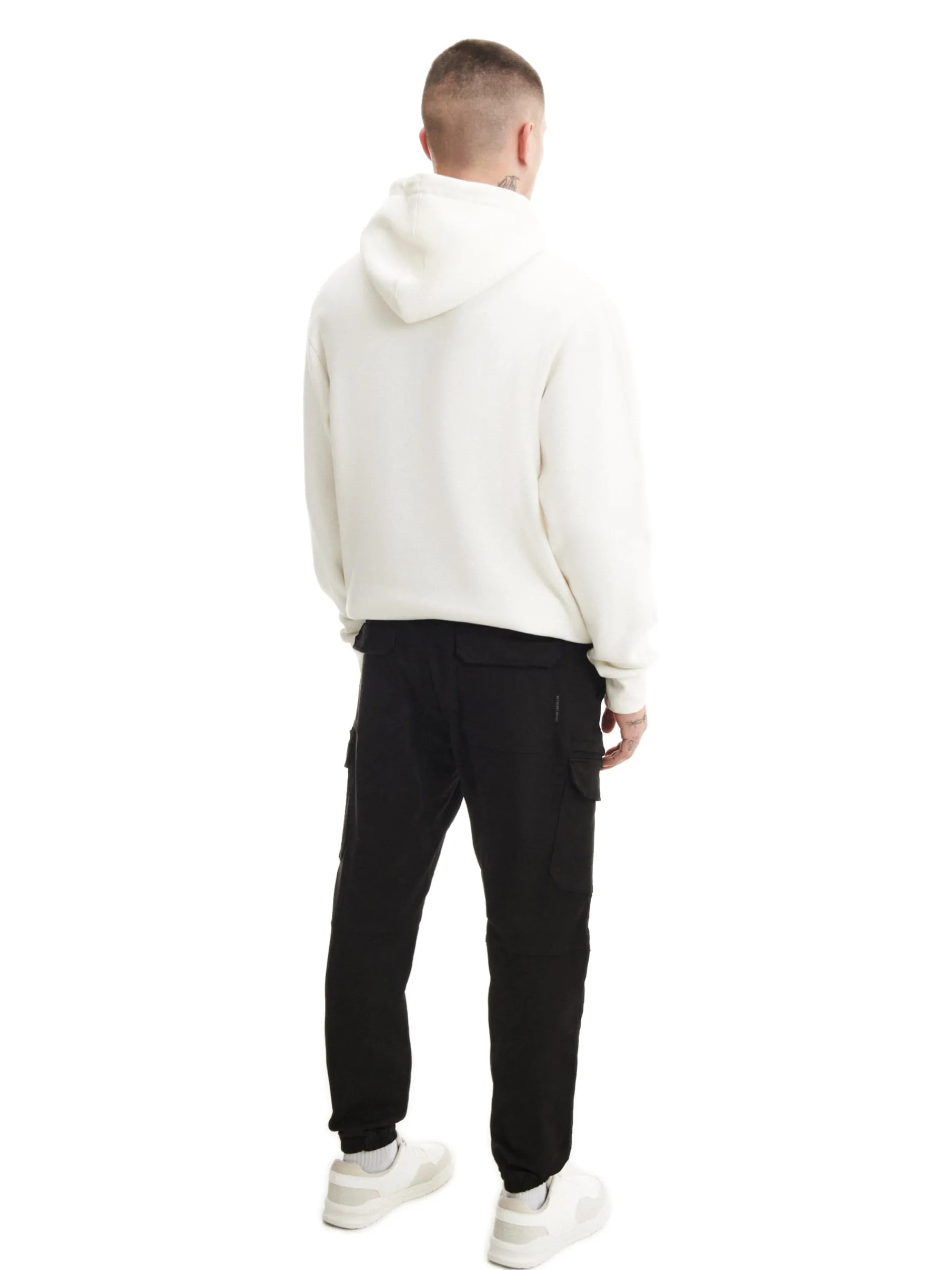 Czarne spodnie męskie o kroju slim jogger, uszyte z tkaniny o wysokiej zawartości bawełny. w pasie gumka i sznurek do regulacji liczne kieszenie, w tym kieszenie typu cargo nogawka ze ściągaczem dostępne inne warianty kolorystyczne Model prezentuje produkt w rozmiarze M/L. Wzrost modela: 185 cm