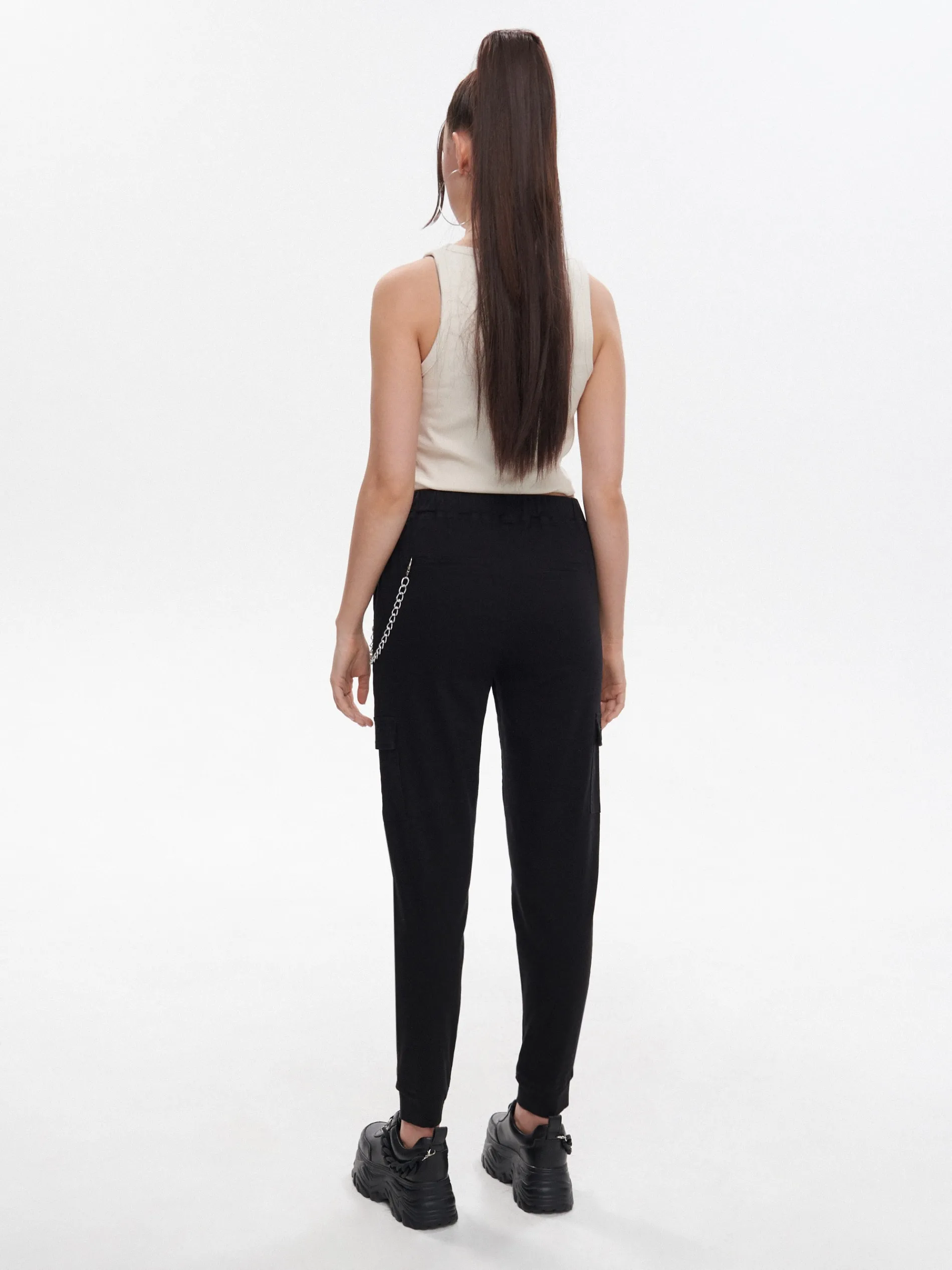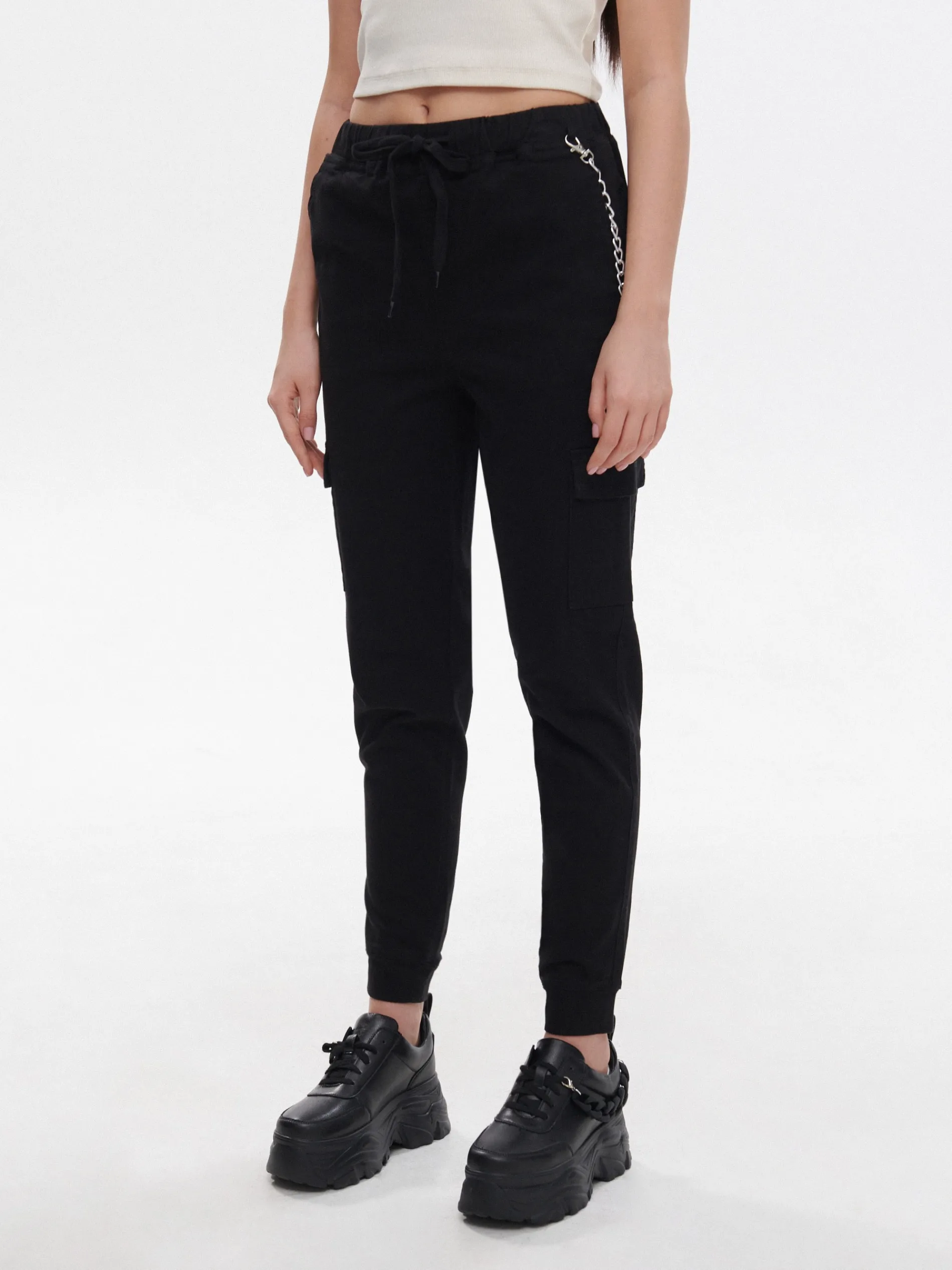 Damskie spodnie o kroju jogger, uszyte z tkaniny o bardzo wysokiej zawartości bawełny. regularny stan w pasie gumka oraz sznurek do regulacji długa, wąska nogawka zakończona szerokim ściągaczem cztery kieszenie, w tym dwie cargo imitacje kieszeni z tyłu imitacja rozporka ozdobny łańcuch w kolorze srebrnym z możliwością odczepienia dostępne inne warianty kolorystyczne Modelka prezentuje produkt w rozmiarze S. Wzrost modelki: 175 cm