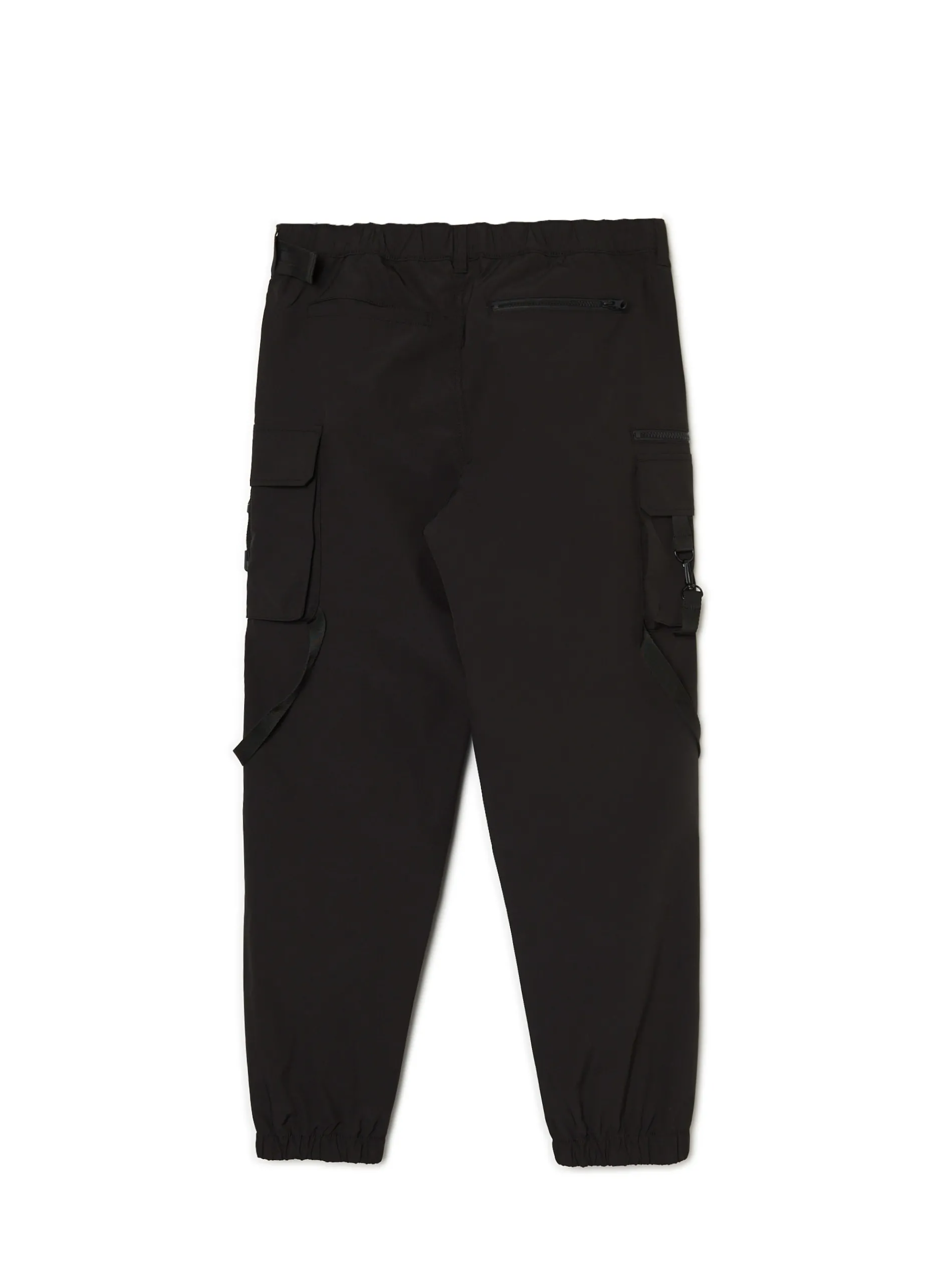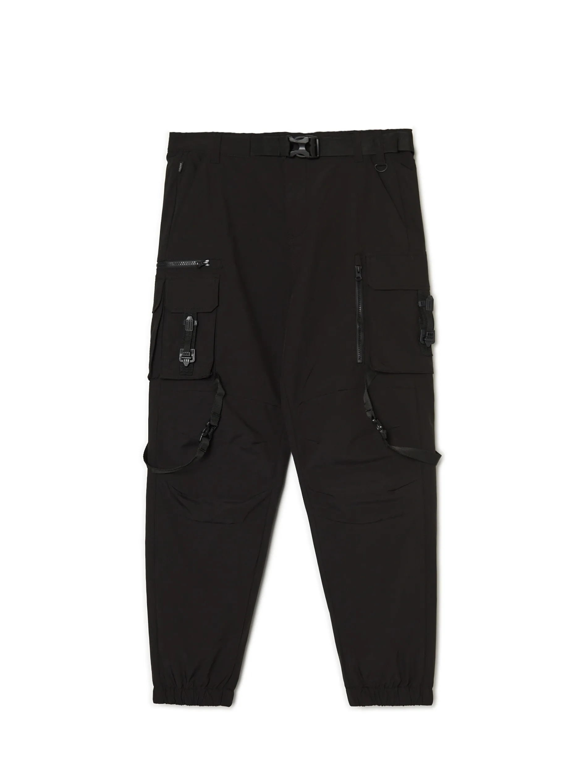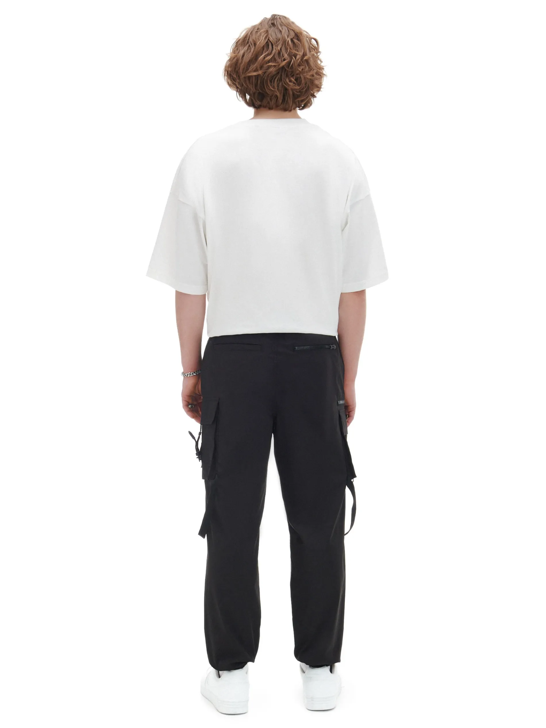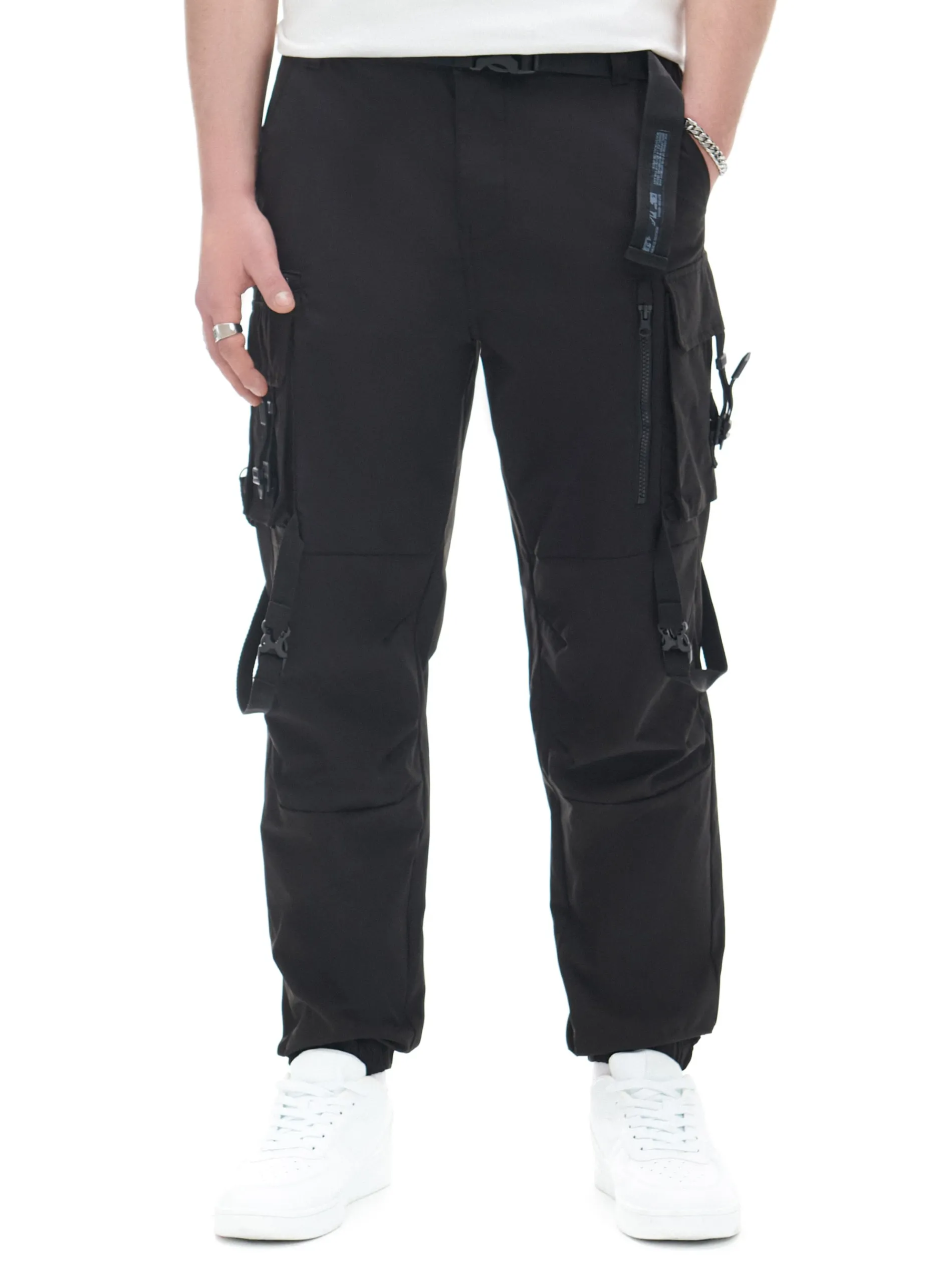 Czarne spodnie męskie o kroju loose, uszyte z wytrzymałej tkaniny. swobodny fason zapięcie na zamek i guzik oraz dodatkowy pasek z klamrą liczne kieszenie, w tym kieszenie typu cargo z klamrami nogawki z elastyczną gumką Wzrost modela: 184 cm