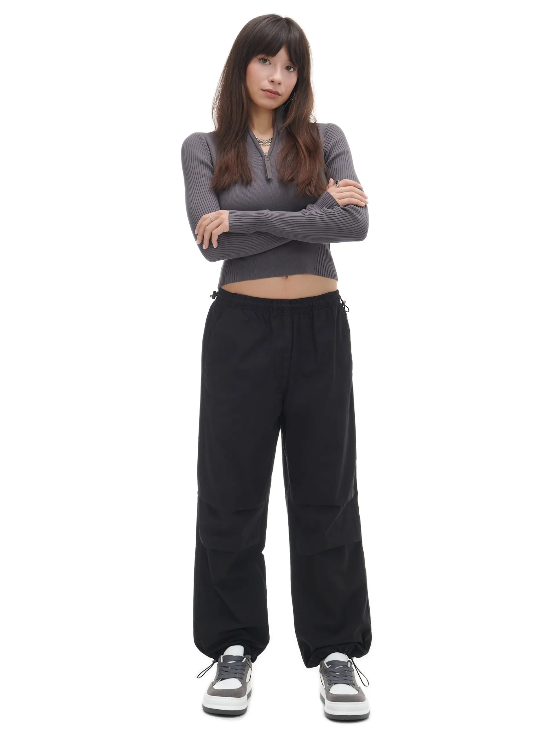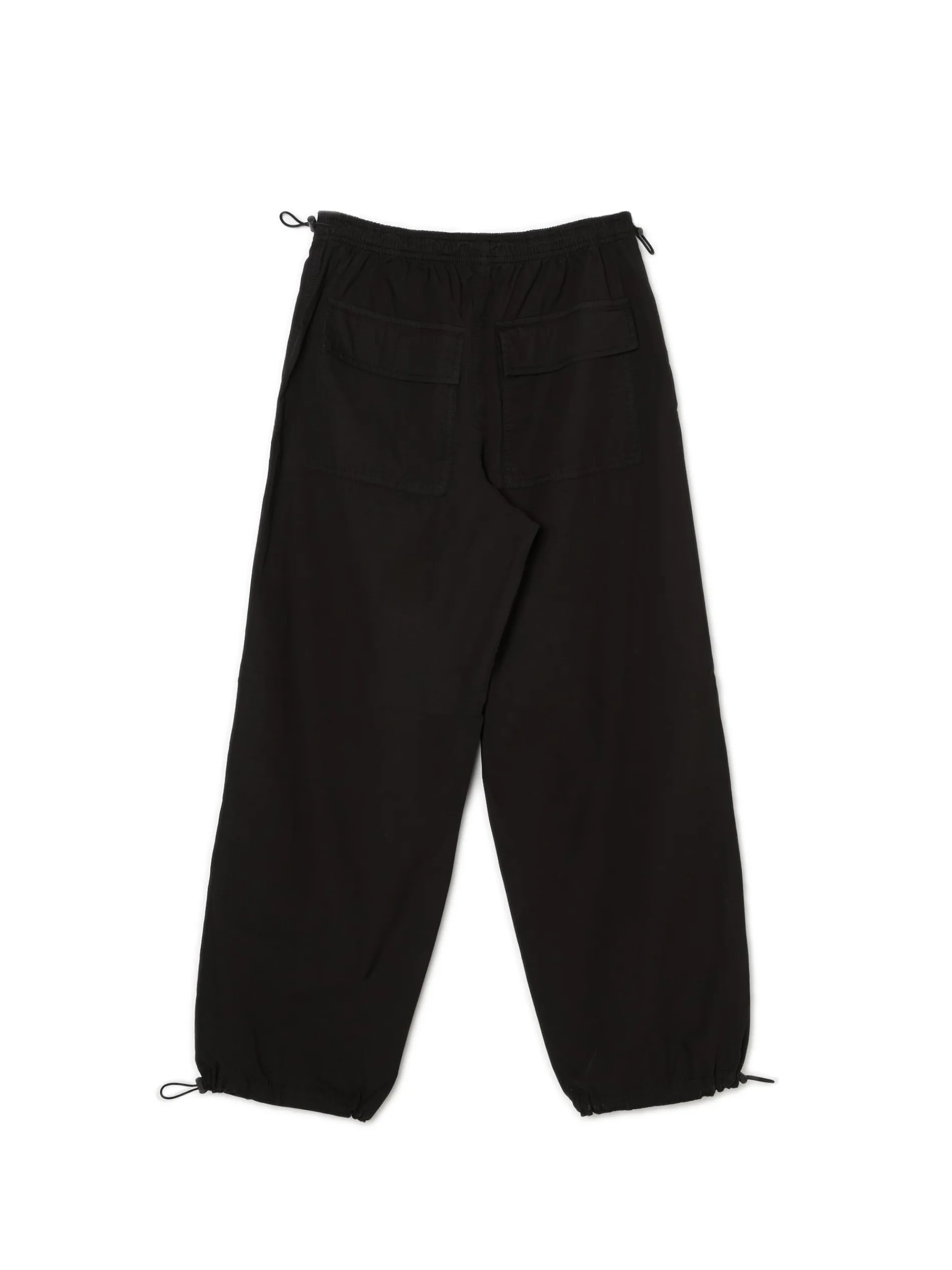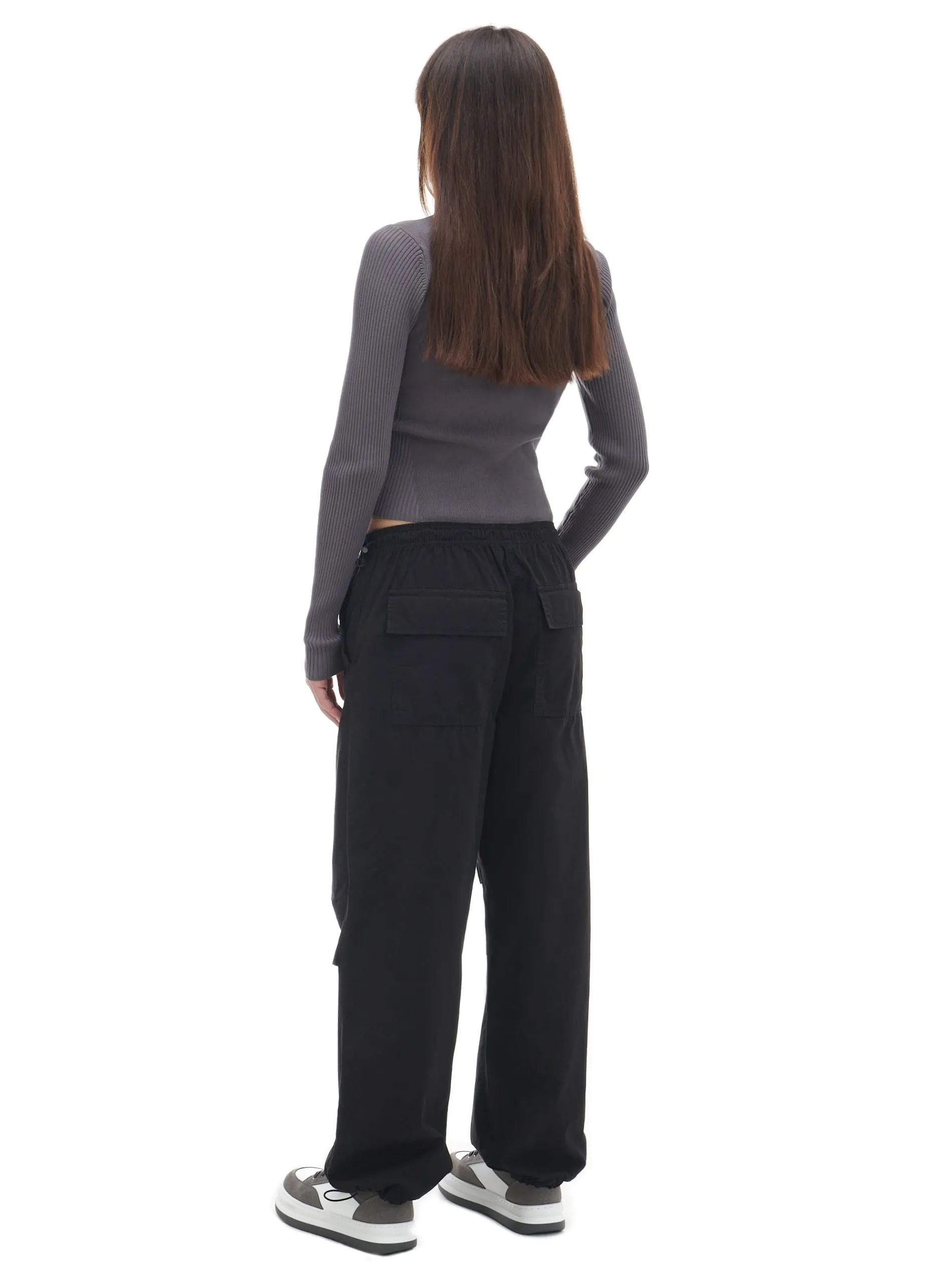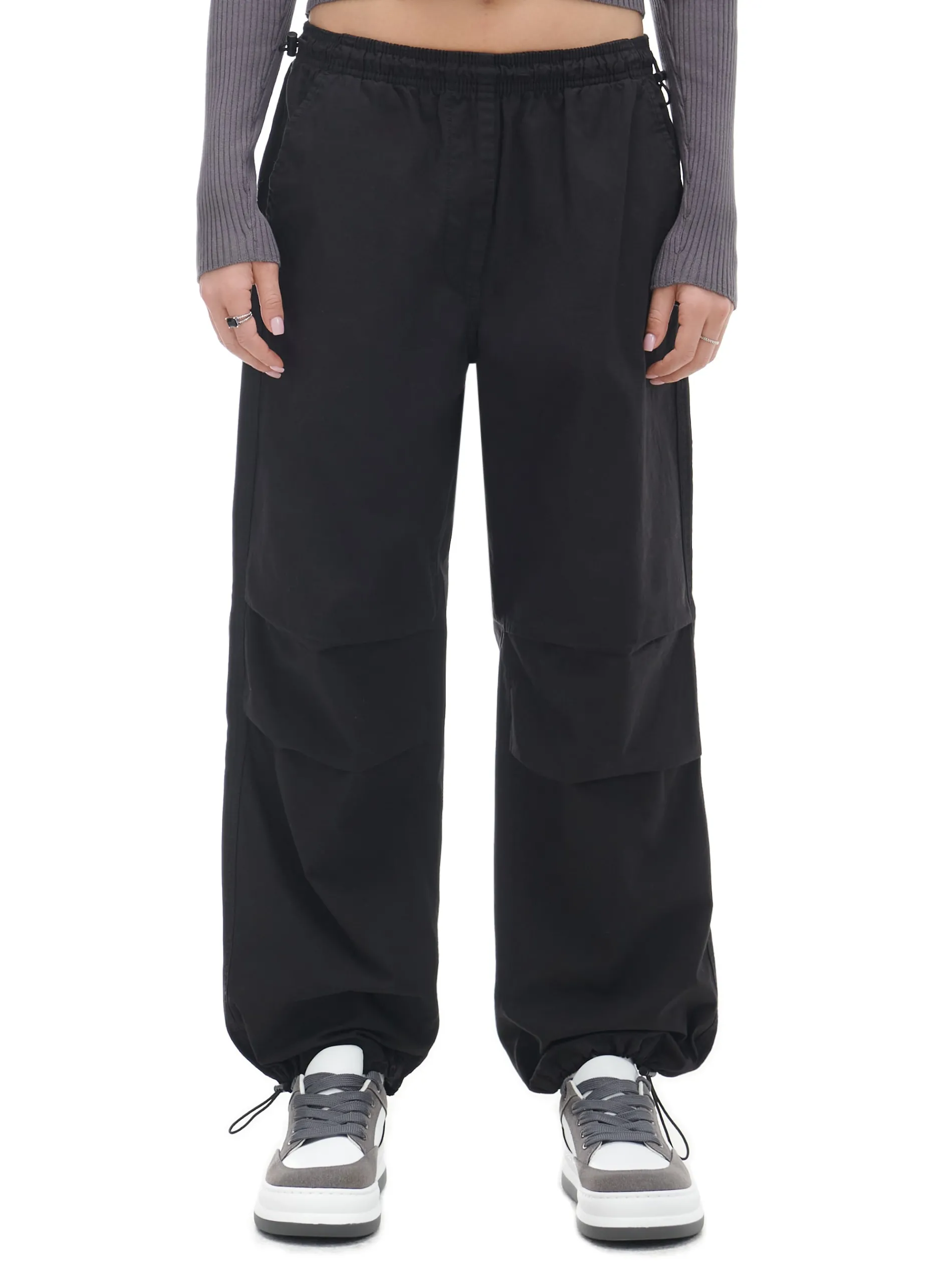 Spodnie damskie w stylu parachute, nazywane też spadochronowymi. Uszyte z bawełnianej tkaniny. luźny fason w pasie elastyczna gumka ze stoperami do regulacji 4 kieszenie swobodne nogawki z regulacją u dołu dostępne inne warianty kolorystyczne
