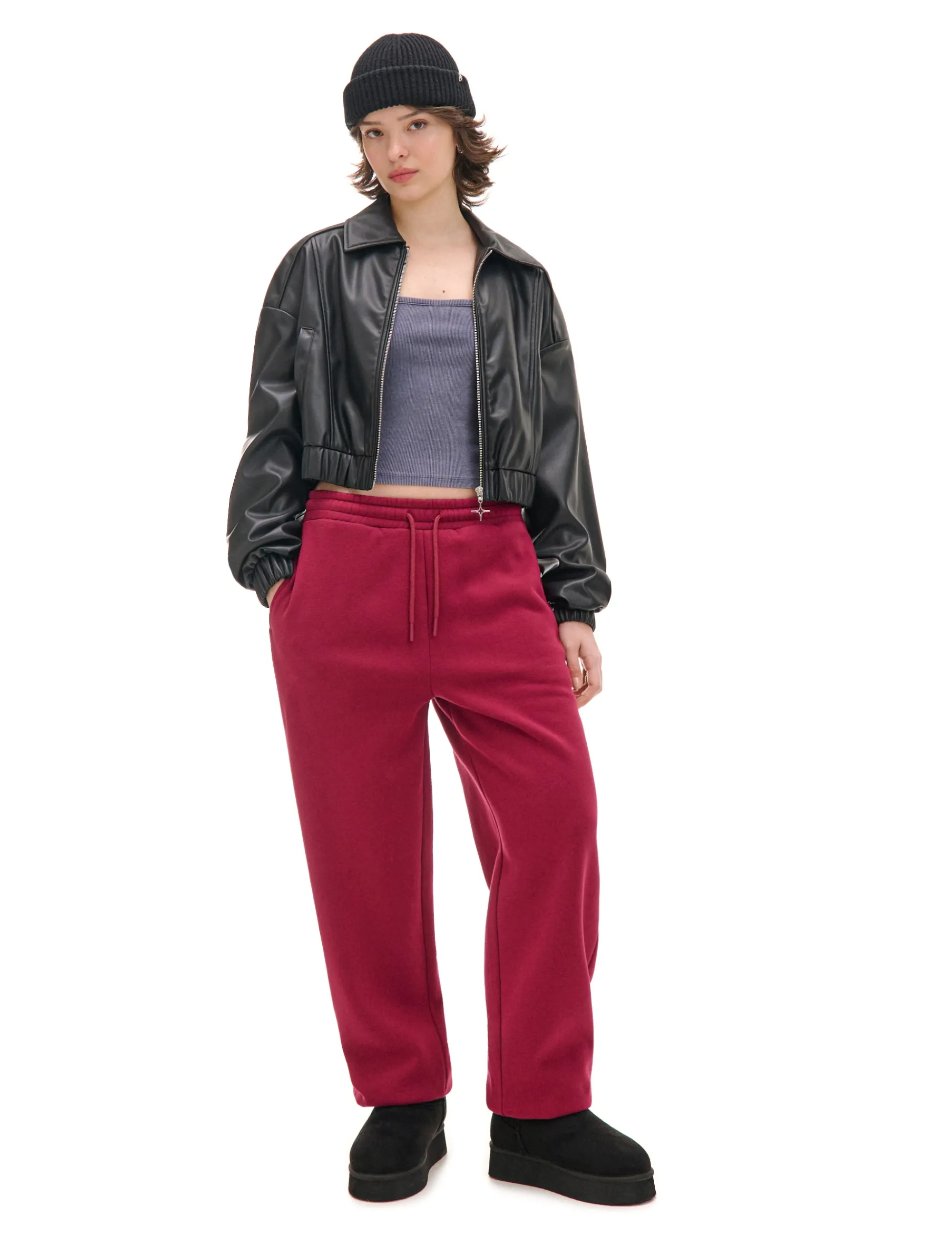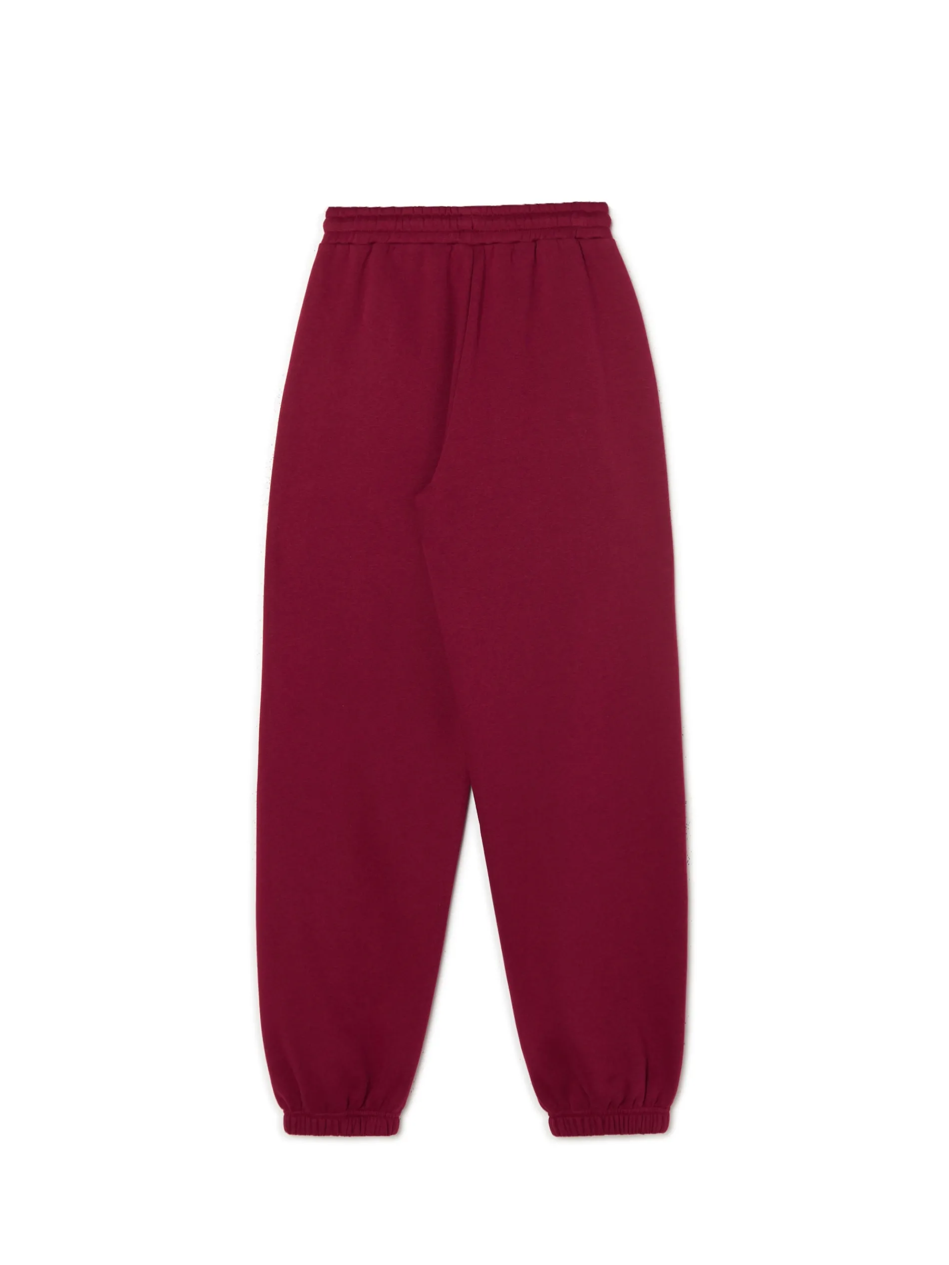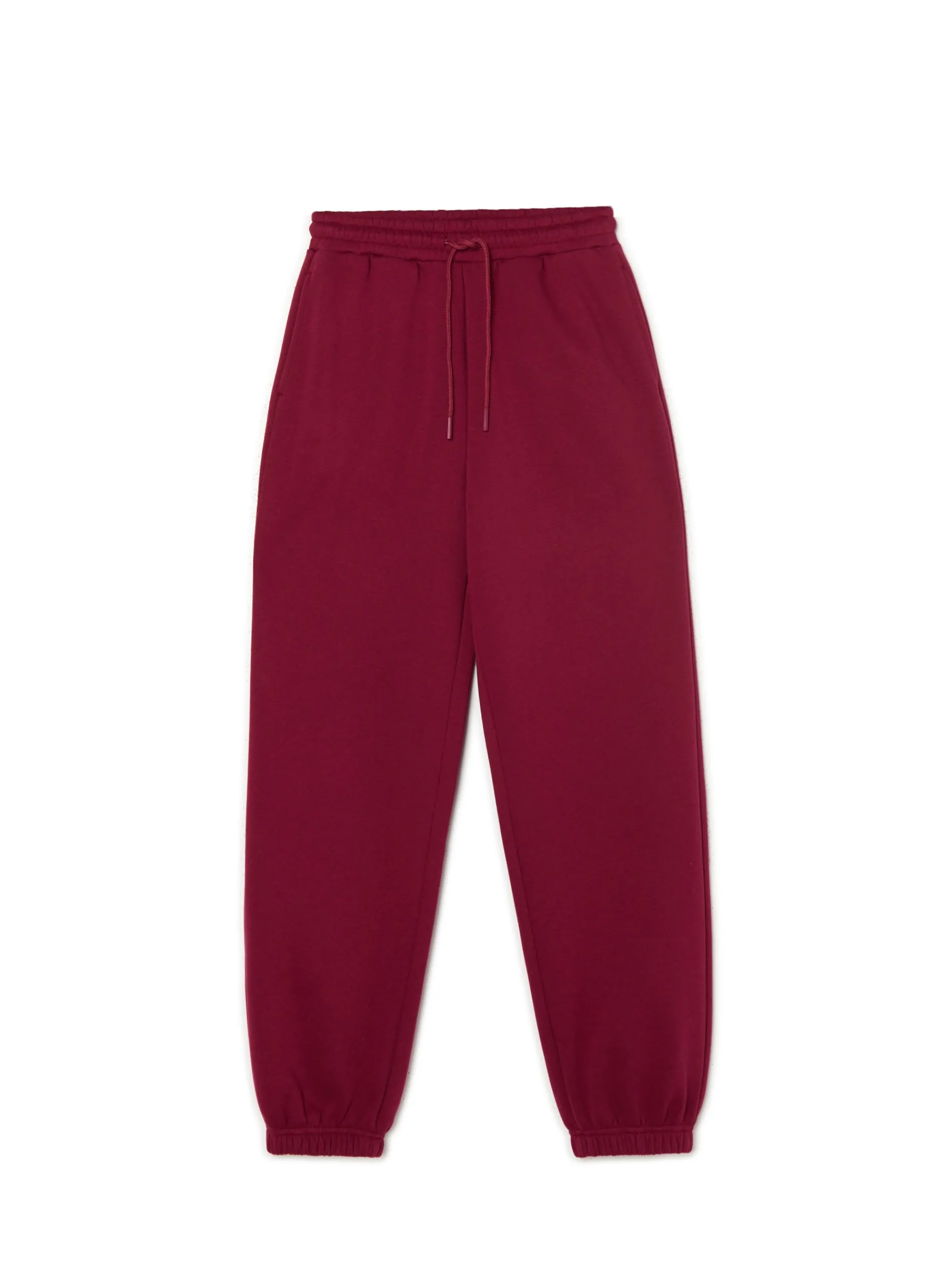 Bordowe spodnie damskie typu jogger, uszyte z mieszanki dzianin z bawełną. Komfort zapewniają luźna nogawka ze ściągaczem oraz regulacja w pasie. Dostępne inne kolory. wygodne spodnie z regulacją w pasie dzianinowy materiał z bawełną elastyczna gumka w pasie długie, swobodne nogawki wykończone ściągaczem dwie kieszenie po bokach