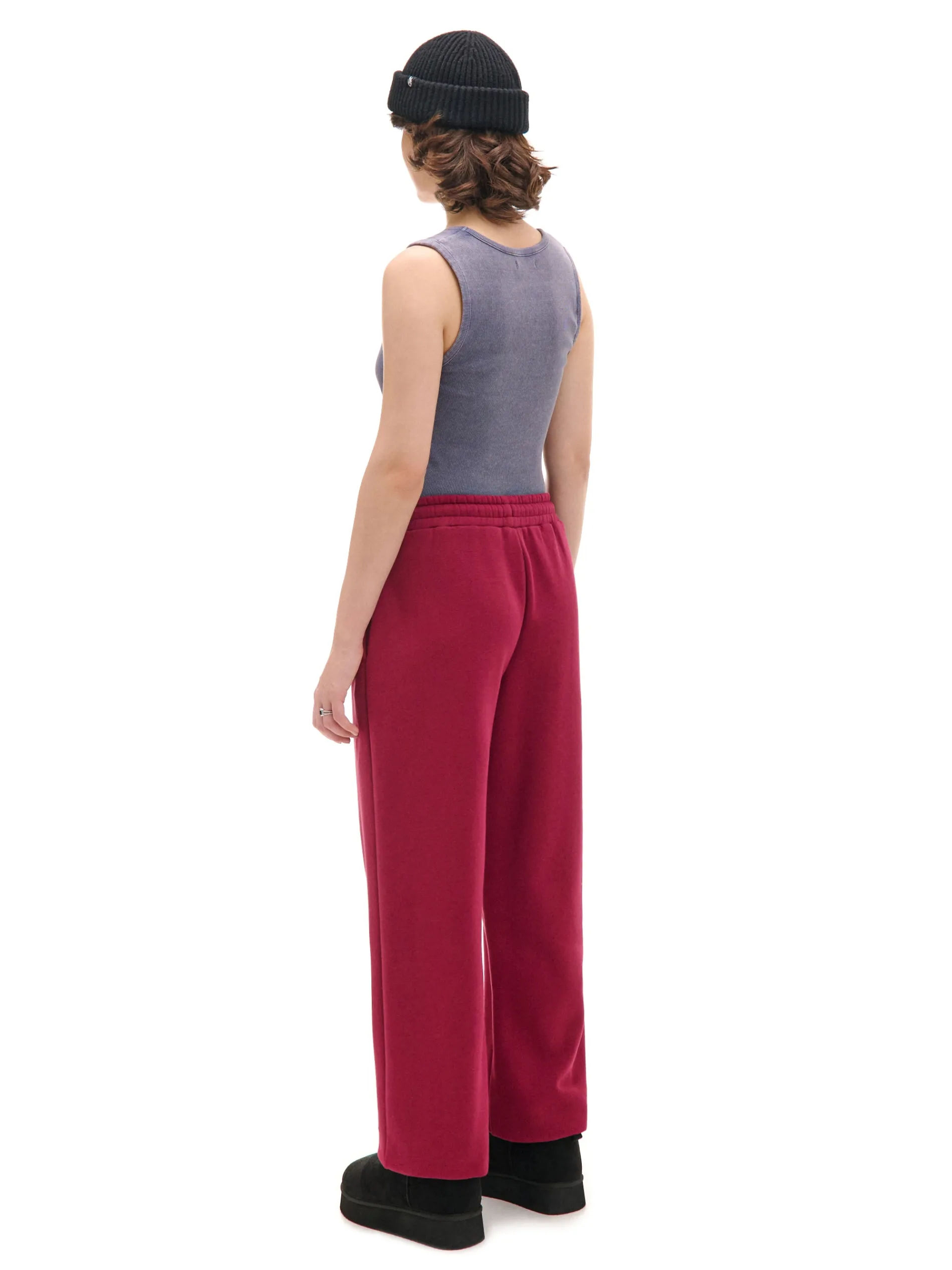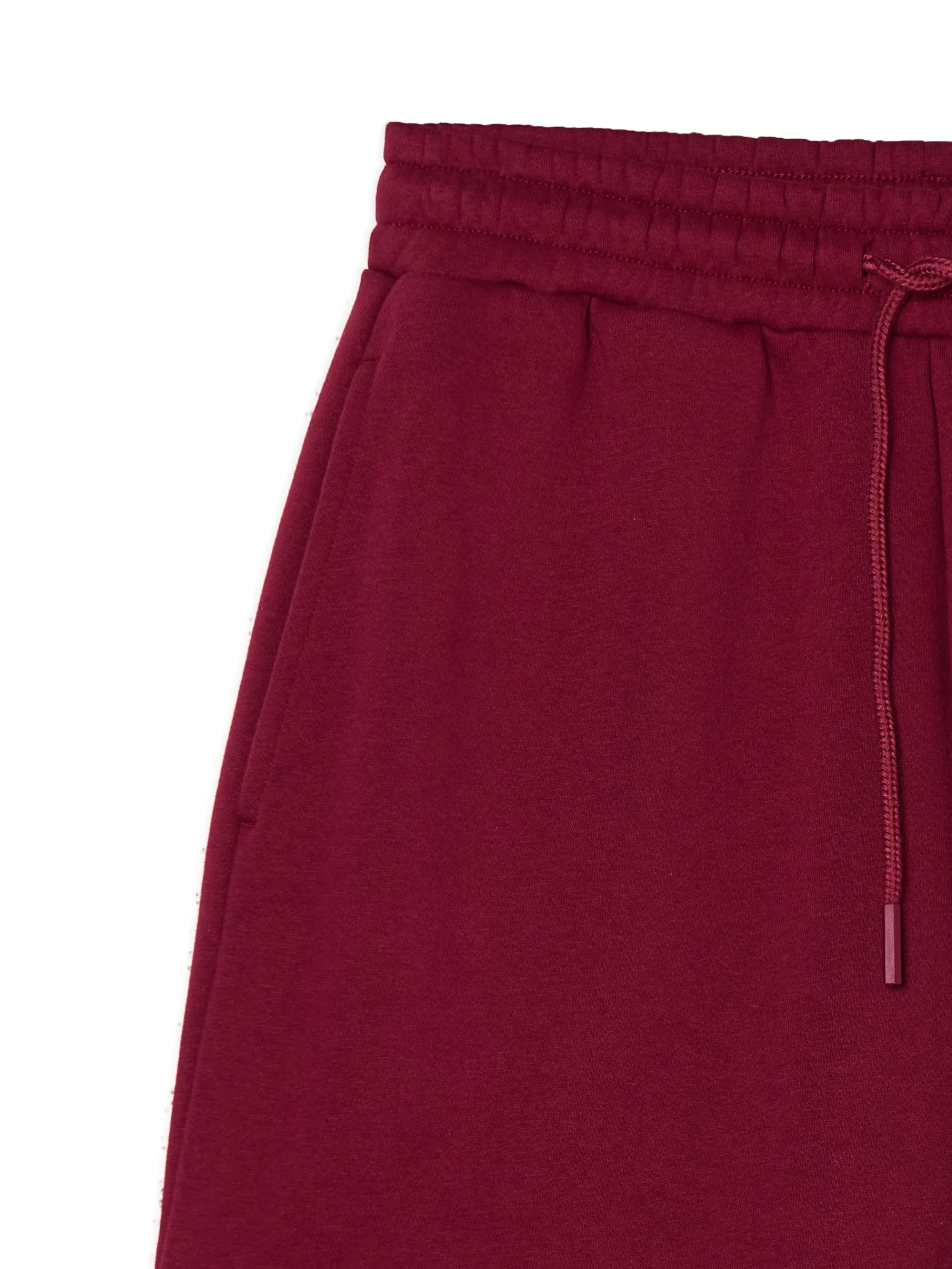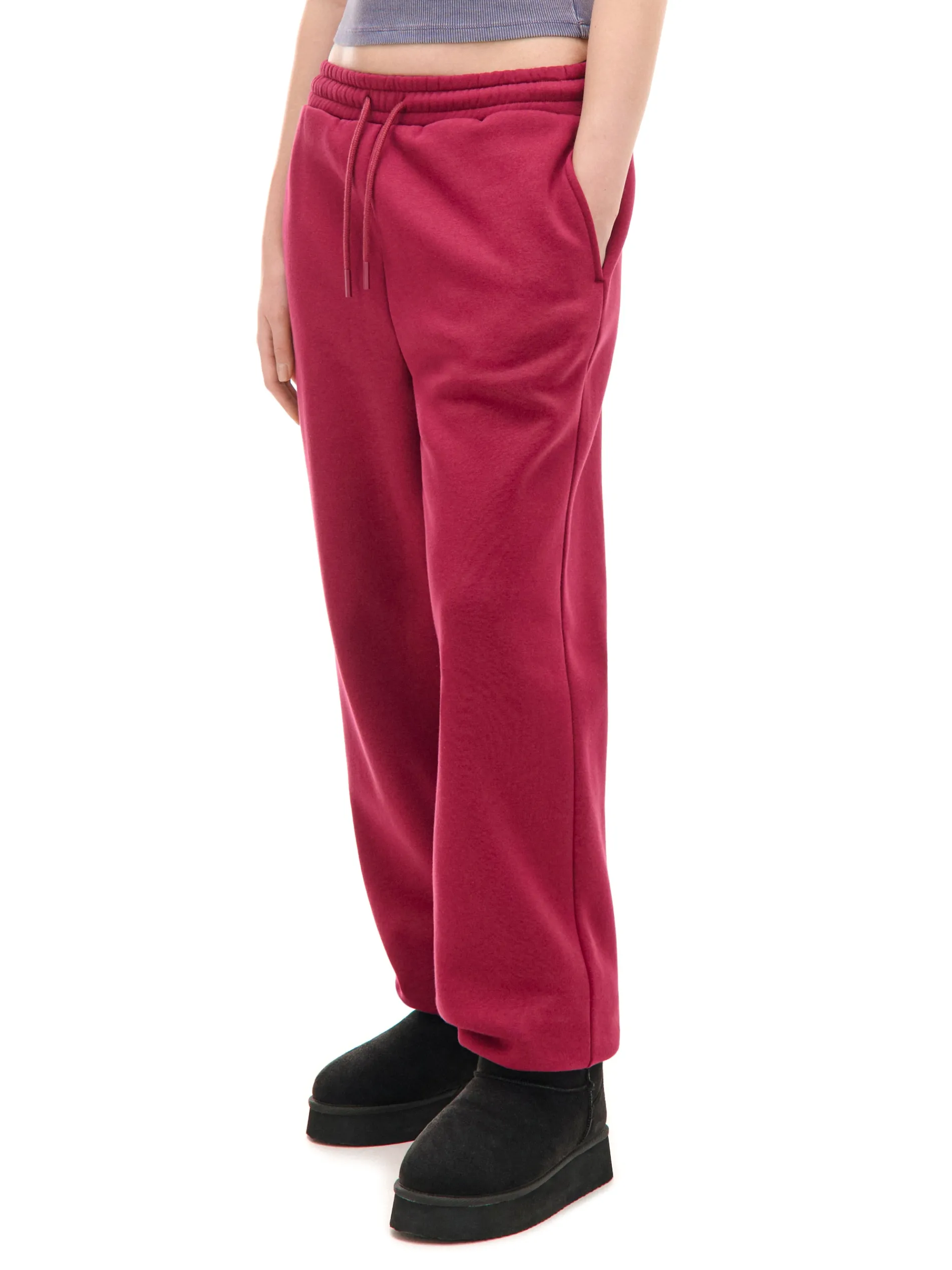 Bordowe spodnie damskie typu jogger, uszyte z mieszanki dzianin z bawełną. Komfort zapewniają luźna nogawka ze ściągaczem oraz regulacja w pasie. Dostępne inne kolory. wygodne spodnie z regulacją w pasie dzianinowy materiał z bawełną elastyczna gumka w pasie długie, swobodne nogawki wykończone ściągaczem dwie kieszenie po bokach