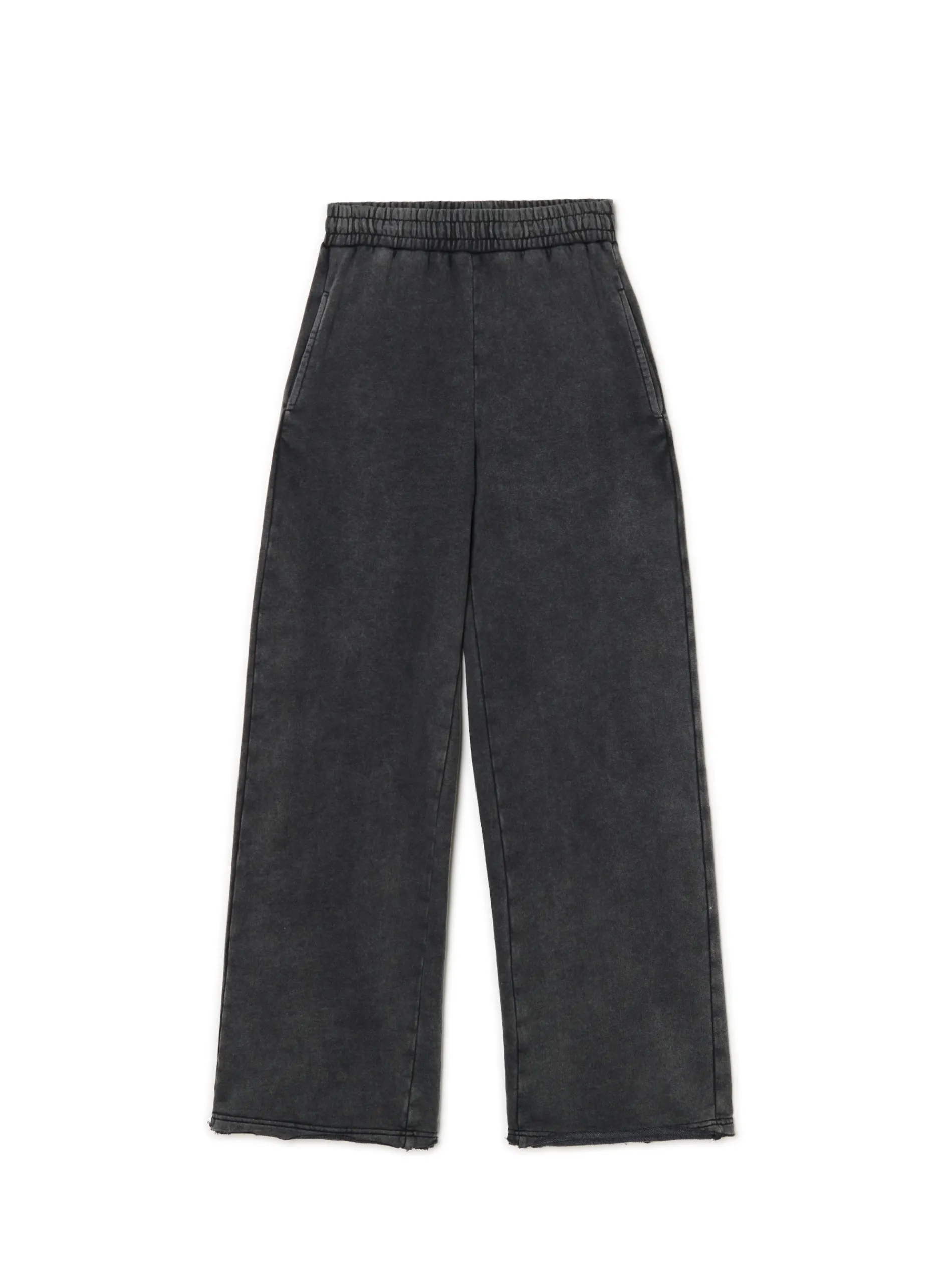 Damskie spodnie z wygodnymi, szerokimi nogawkami uszyte z dzianiny o dużej zawartości miękkiej bawełny french terry. Model dostępny w innym kolorze. dzianinowy materiał z bawełną spodnie o kroju wide leg elastyczna gumka w pasie dwie kieszenie po bokach szeroka nogawka wykończona postrzępieniem efekt sprania na całości