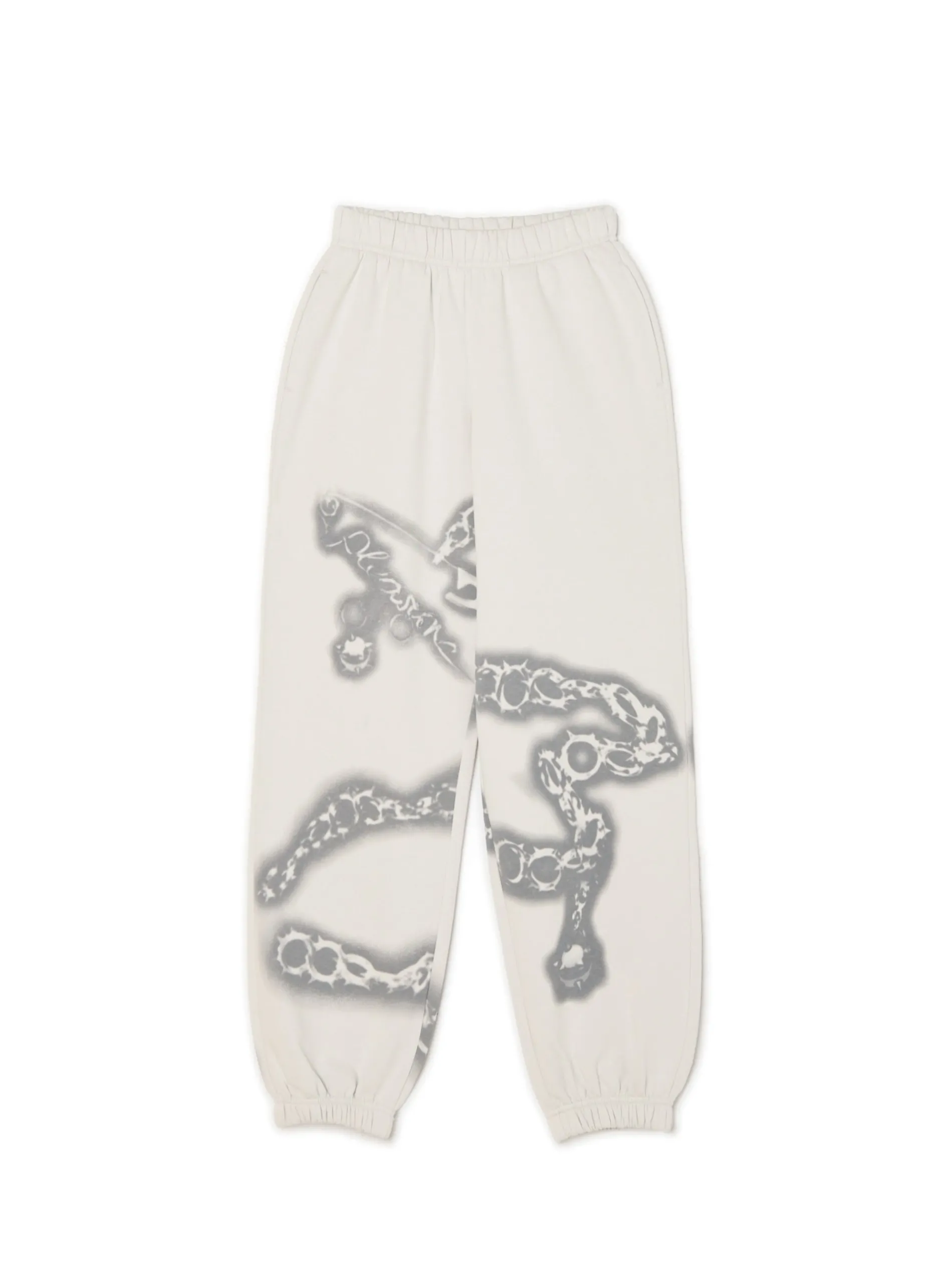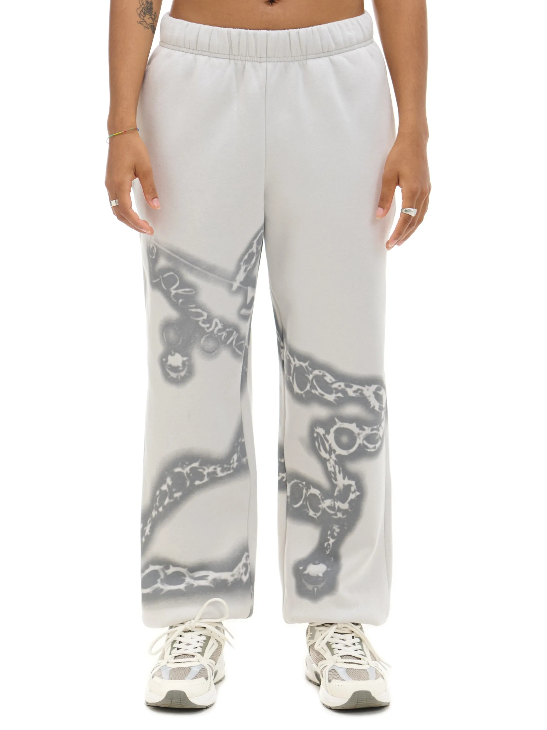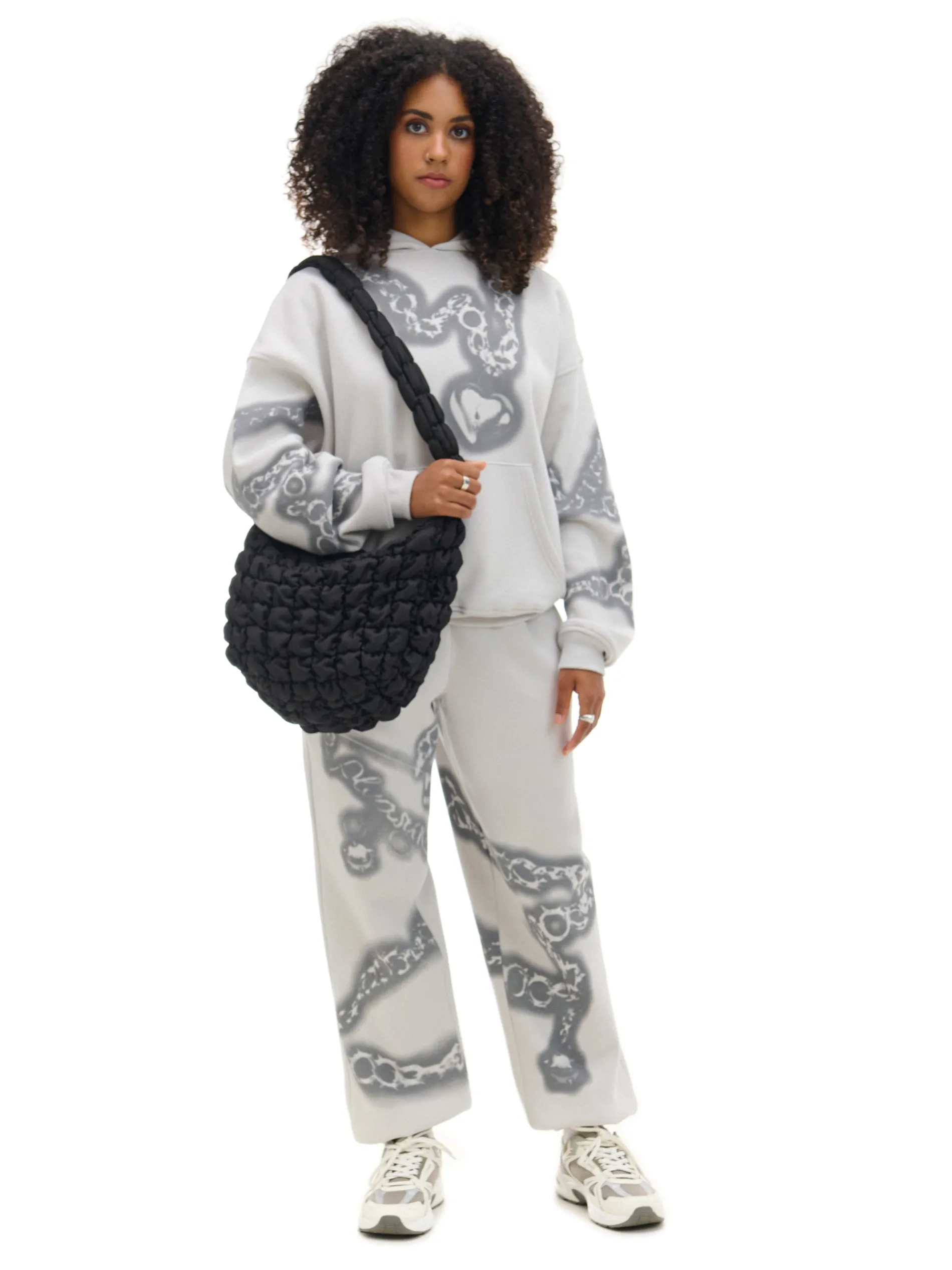 Damskie dresy z wysokim staniem, uszyte z mieszanki dzianin z przyjemną w dotyku bawełną fleecy w składzie. Na całej powierzchni nadruk z motywem łańcucha. dresowe joggery uszyte z dzianiny z bawełną wysoki stan z elastyczną gumką lekkie ocieplenie długie nogawki wykończone ściągaczem dwie kieszenie boczne nadruk all over Produkt tworzy zestaw z modelem 952AQ-09X .