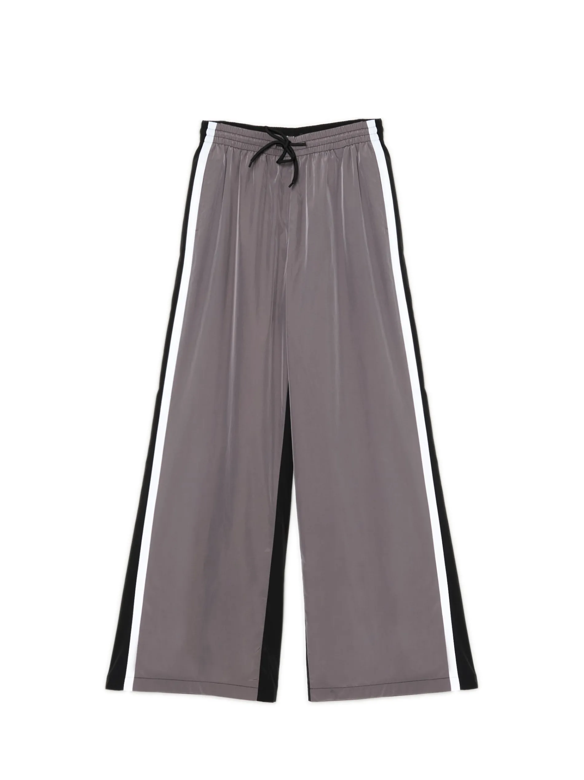 Damskie spodnie o kroju wide leg, wykonane z lekkiej i miłej w dotyku nylonowej tkaniny. Materiał odporny na gniecenia, wytrzymały i szybkoschnący. Idealny item do szkoły, na studia, czy pracy. regularny stan guma w pasie ze sznurkiem do regulacji długie, szerokie nogawki ozdobne biało-czarne lampasy Tworzy zestaw z modelem 177AR-99X .