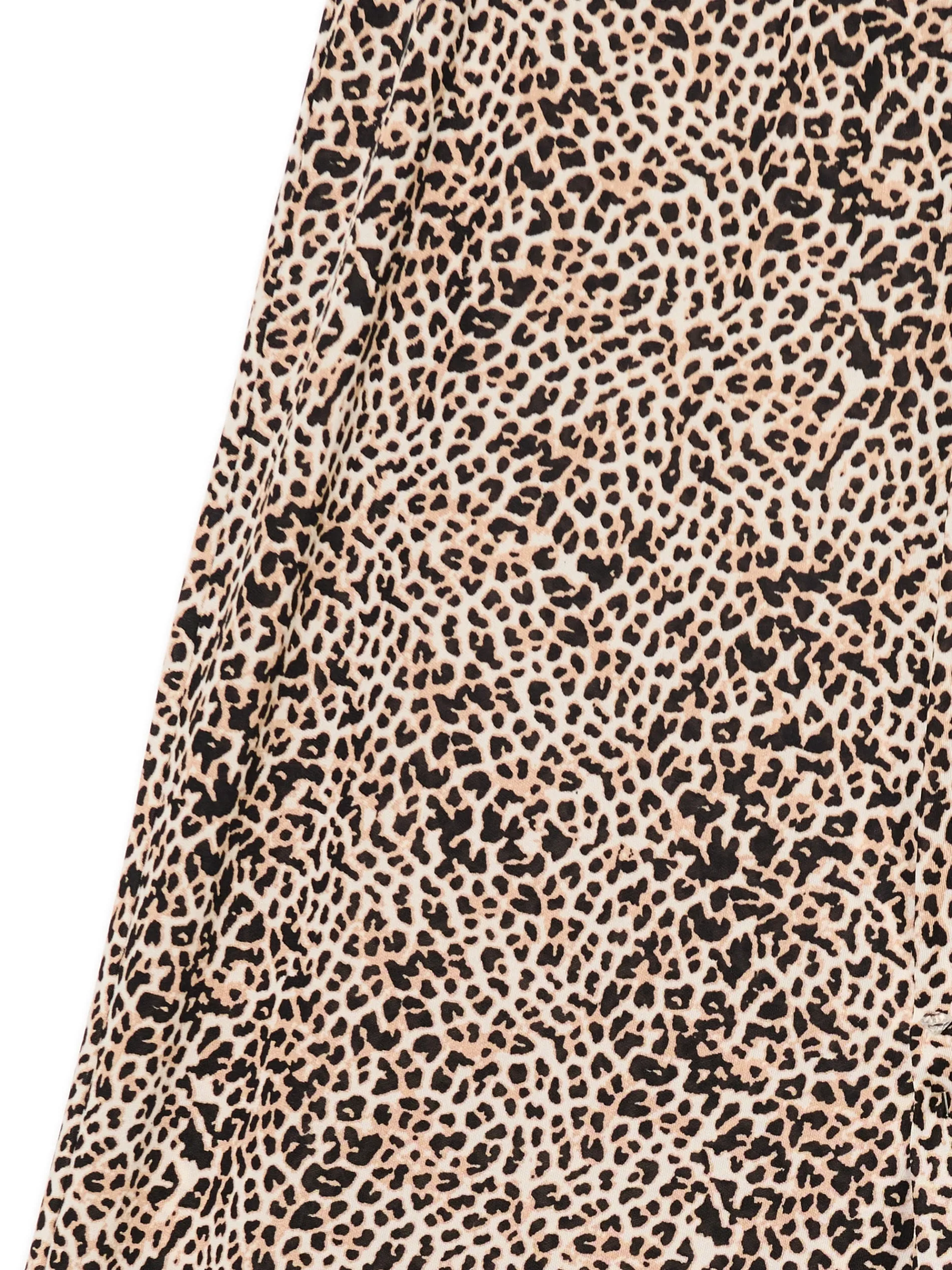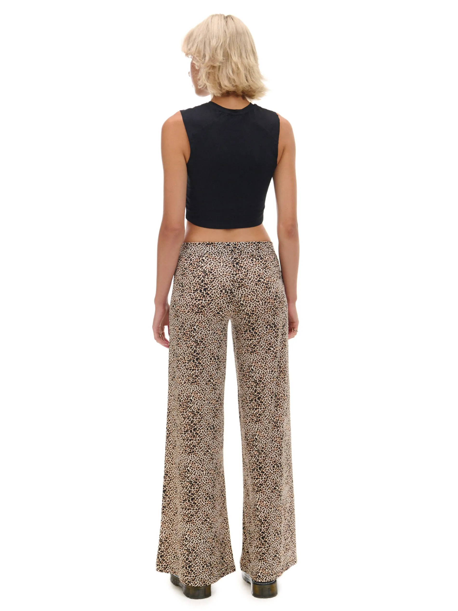 Spodnie damskie typu flare z wygodnymi, szerokimi nogawkami w stylu lat 80-tych. Ozdobą tego modelu jest ponadczasowy wzór w panterkę na całej powierzchni materiału. dzianinowe spodnie o kroju flare rozszerzane nogawki elastyczna gumka w pasie zwierzęcy print all over Wzrost modelki: 177 cm