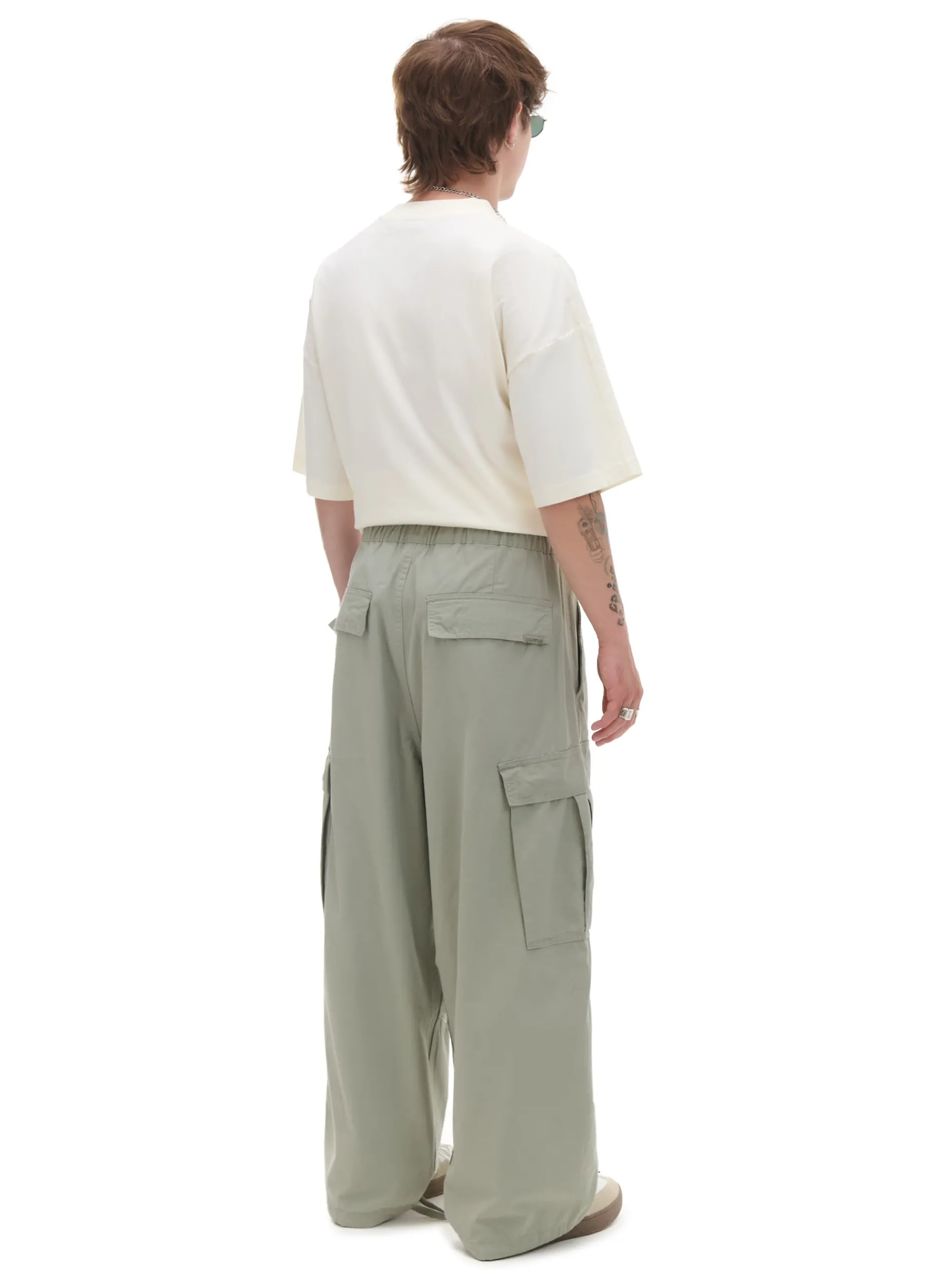 Męskie spodnie typu parachute w oliwkowym kolorze z wieloma udogodnieniami jeszcze nie raz Cię zaskoczą! 100% bawełny luźny krój parachute zapinane na guzik i zamek zip kieszenie boczne, 4 kieszenie cargo na napy ściągacze na nogawkach i w pasie ozdobne marszczenia