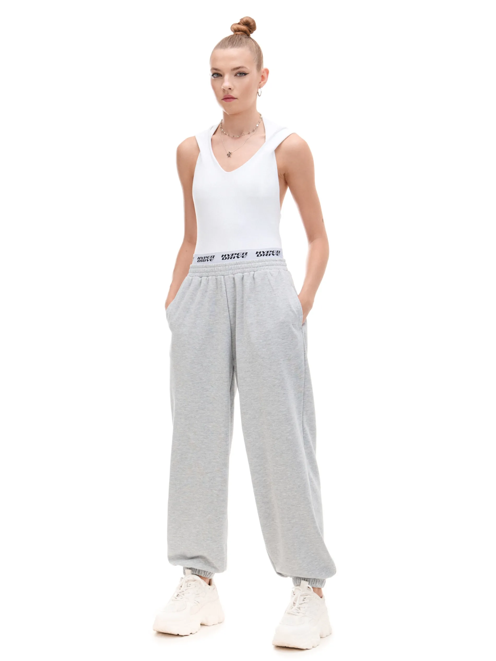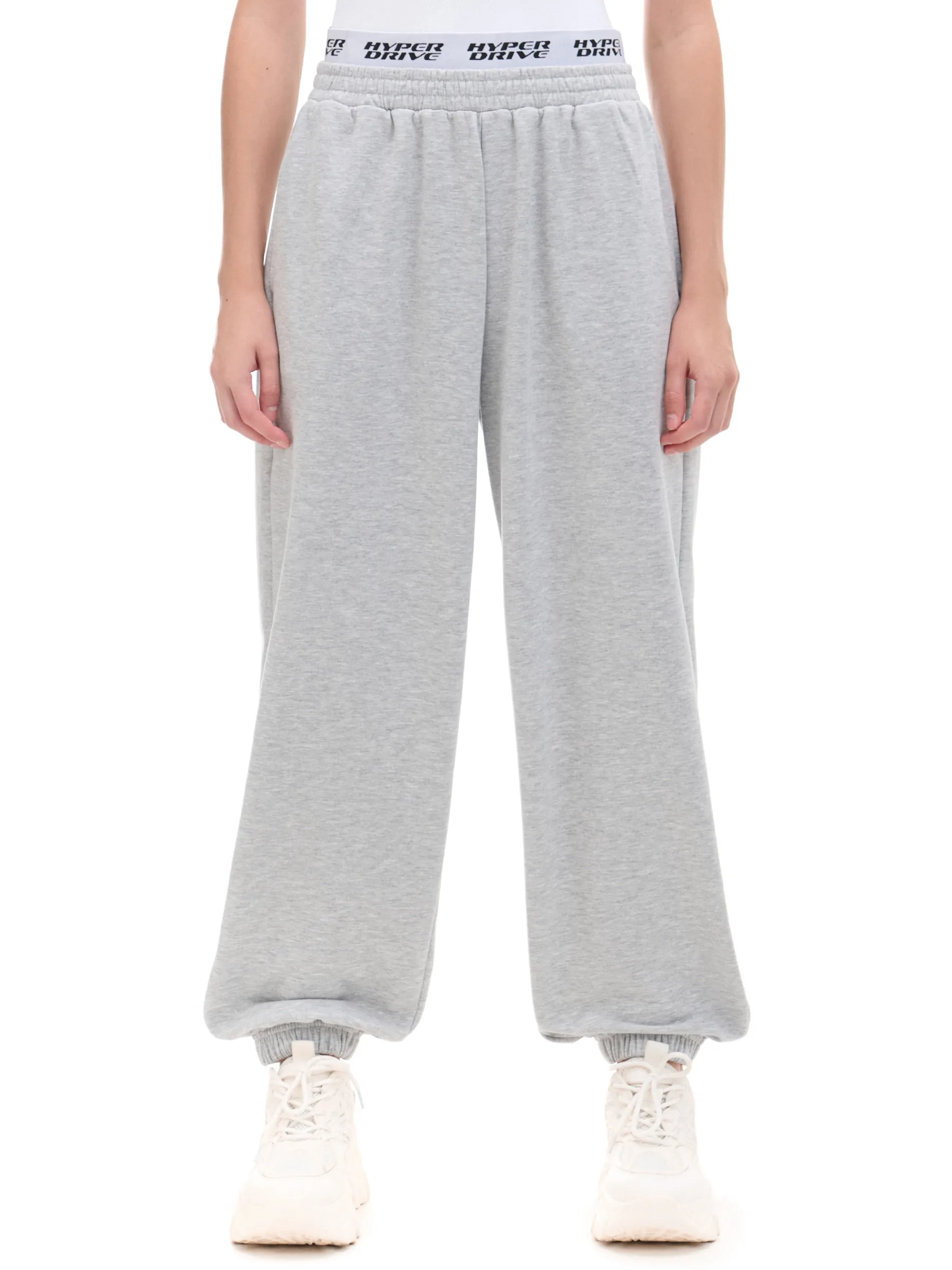 Dzianinowe damskie spodnie o sportowym kroju, uszyte z mieszanki materiałów z dodatkiem bawełny french terry. Te miękkie, wygodne i wytrzymałe joggery są gotowe na każdy rodzaj aktywności. dresowe spodnie typu jogger dzianinowy materiał z bawełną długie nogawki zwężane ku dołowi, wykończone ściągaczem w pasie od wewnątrz wszyta gumka dodatkowa guma z nadrukiem