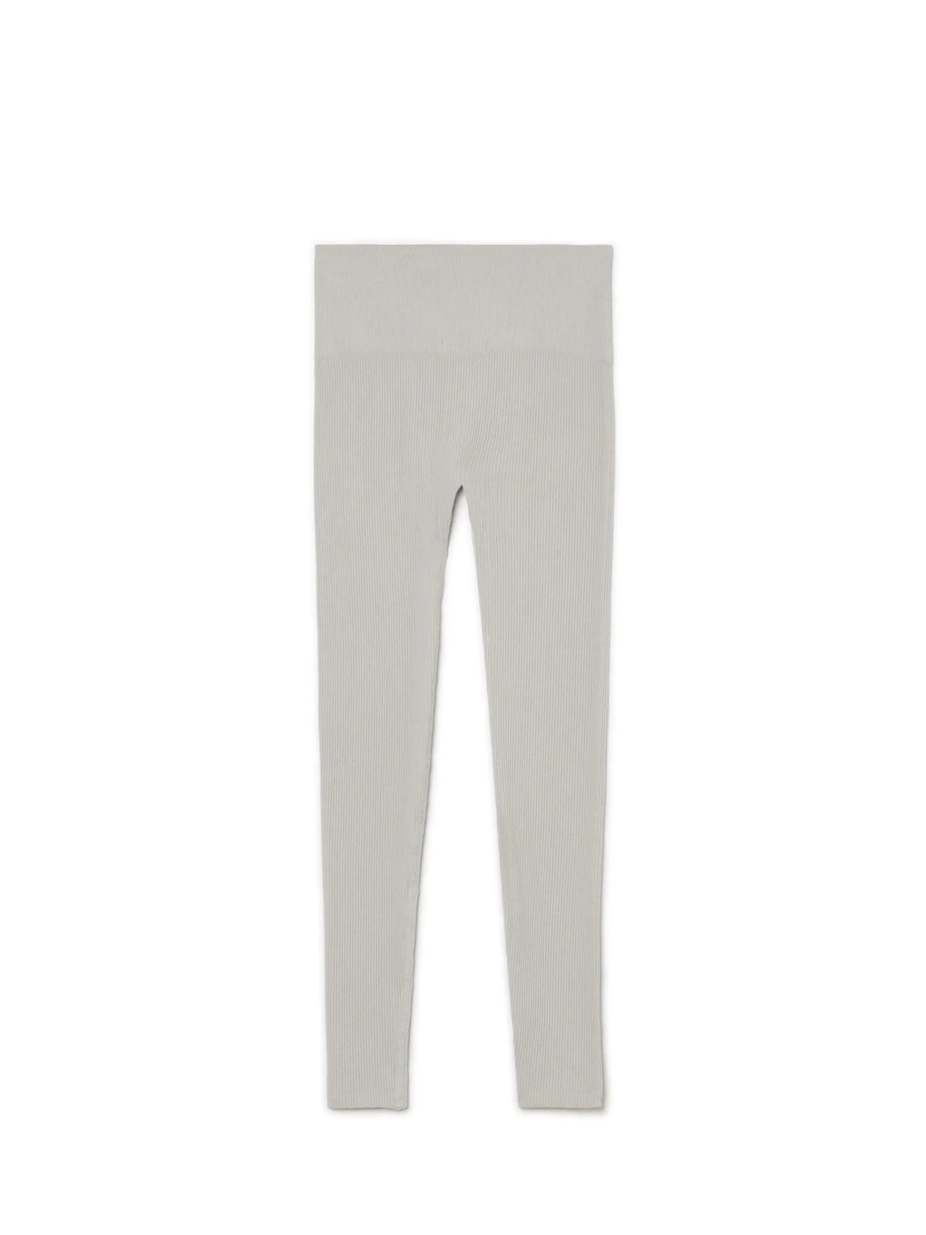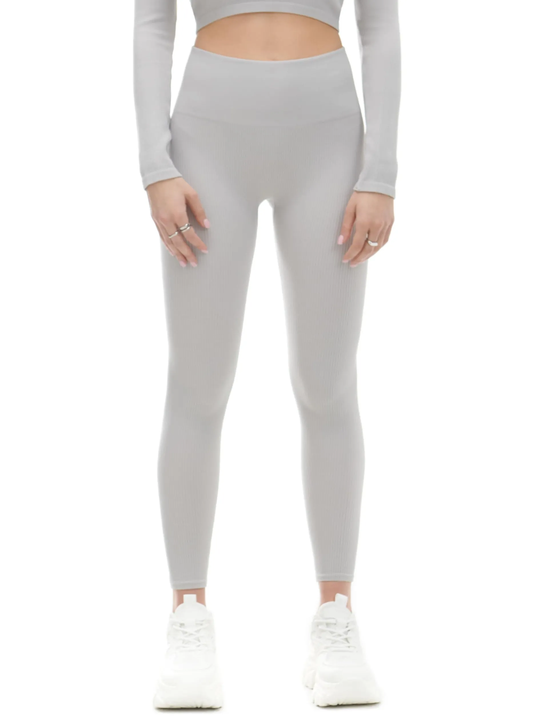 Damskie legginsy, uszyte z prążkowanej dzianiny, mieszanki poliamidu i elastanu. W pasie gumka.