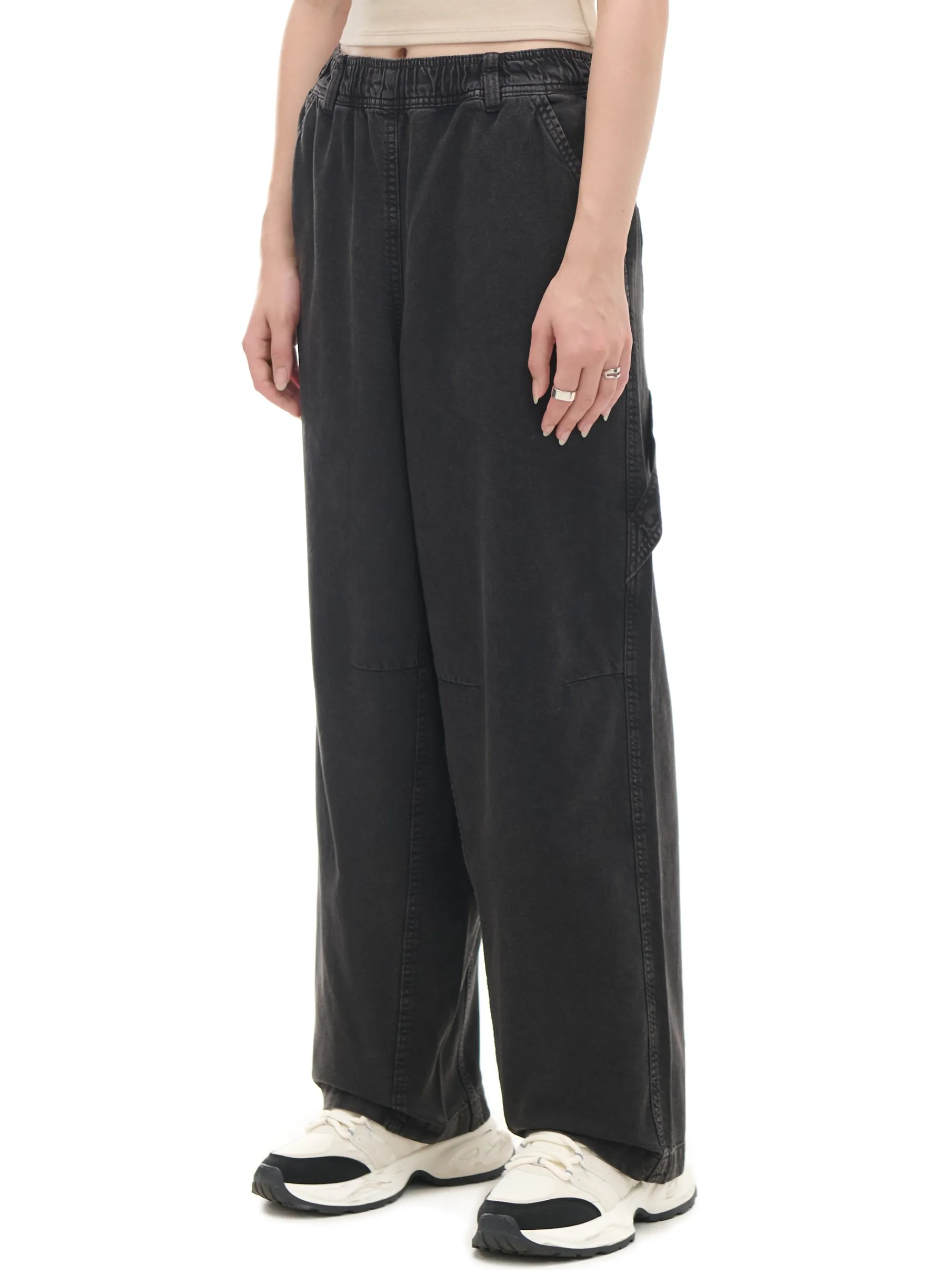 Damskie szare spodnie, uszyte z bawełnianego, wytrzymałego diagonalu. luźny krój baggy bardzo szeroka nogawka wysoki stan, w pasie elastyczna gumka cztery kieszenie ukośne przeszycia na wysokości kolan dodatkowy pasek typu carpenter szerokie szlufki na pasek delikatny efekt sprania materiału Wzrost modelki: 172 cm