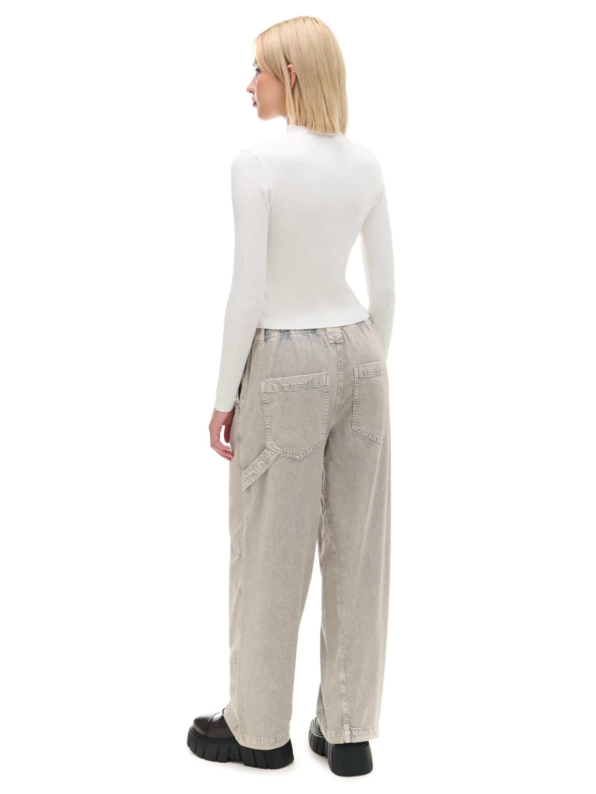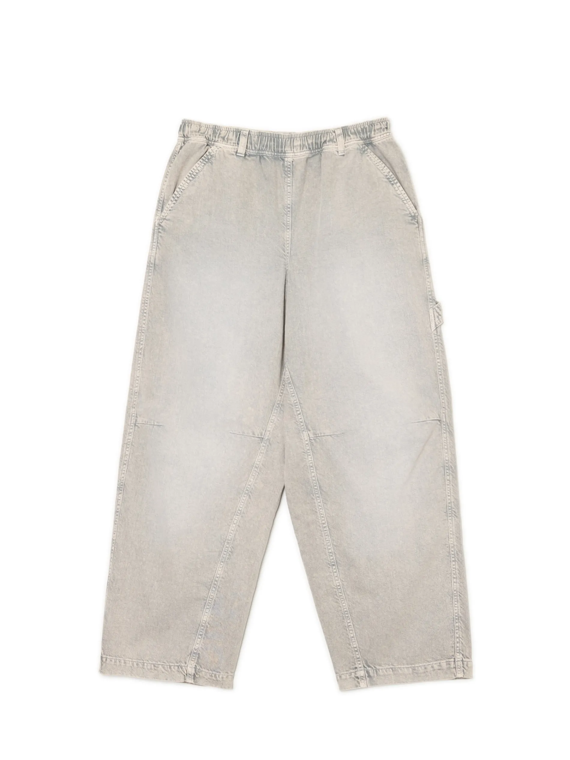 Damskie szare spodnie, uszyte z bawełnianego, wytrzymałego diagonalu. luźny krój baggy bardzo szeroka nogawka wysoki stan, w pasie elastyczna gumka cztery kieszenie ukośne przeszycia na wysokości kolan pasek typu carpenter delikatny efekt sprania materiału Wzrost modelki: 177 cm