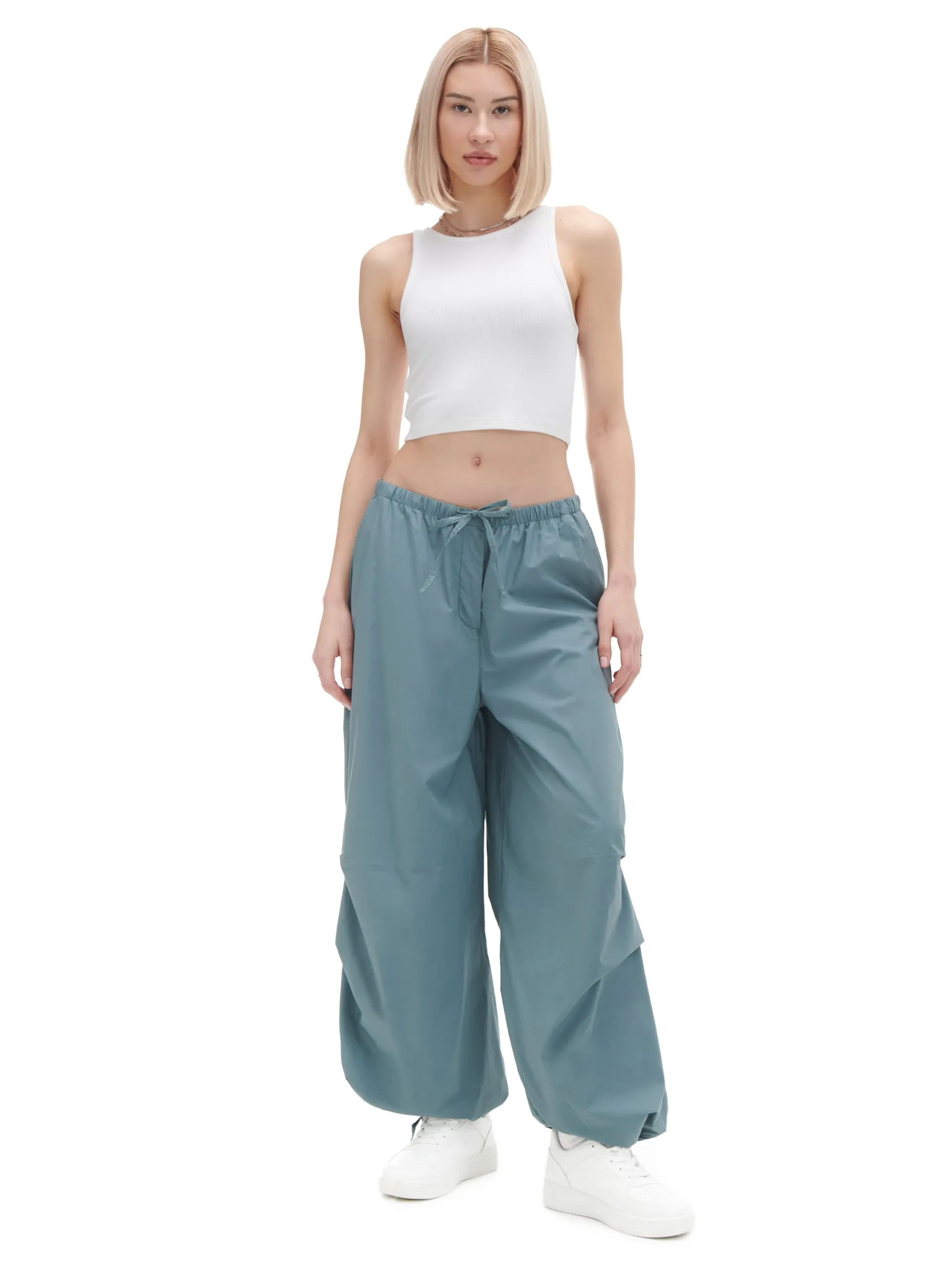 Szerokie damskie spodnie, uszyte w 100% z bawełny. w pasie sznurek do regulacji rozporek i zapięcie szeroka nogawka, zakończona wiązaniem z troczkami cztery kieszenie Wzrost modelki: 177 cm