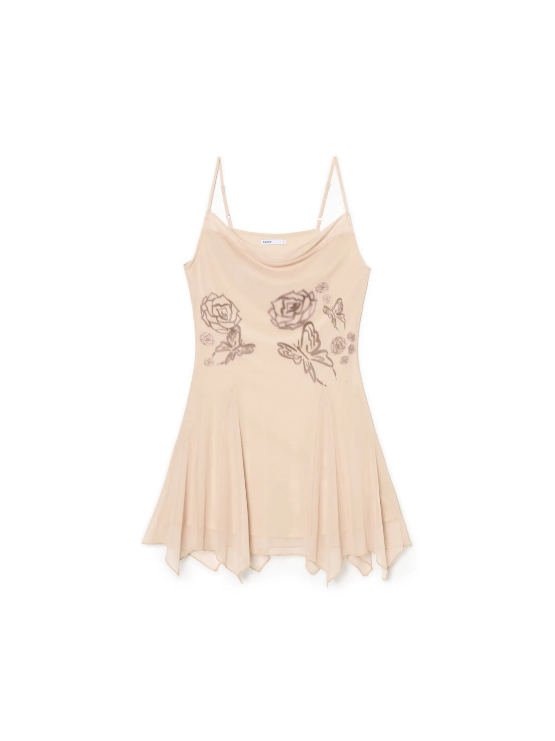 Lekka, krótka sukienka, uszyta z beżowej dzianiny z dodatkiem elastycznych włókien. krój litery A długość mini bardzo cienkie, regulowane ramiączka dekolt typu woda nadruk z motywem róż na wysokości biustu i talii gładka podszewka ozdobnie wykończony dolny brzeg