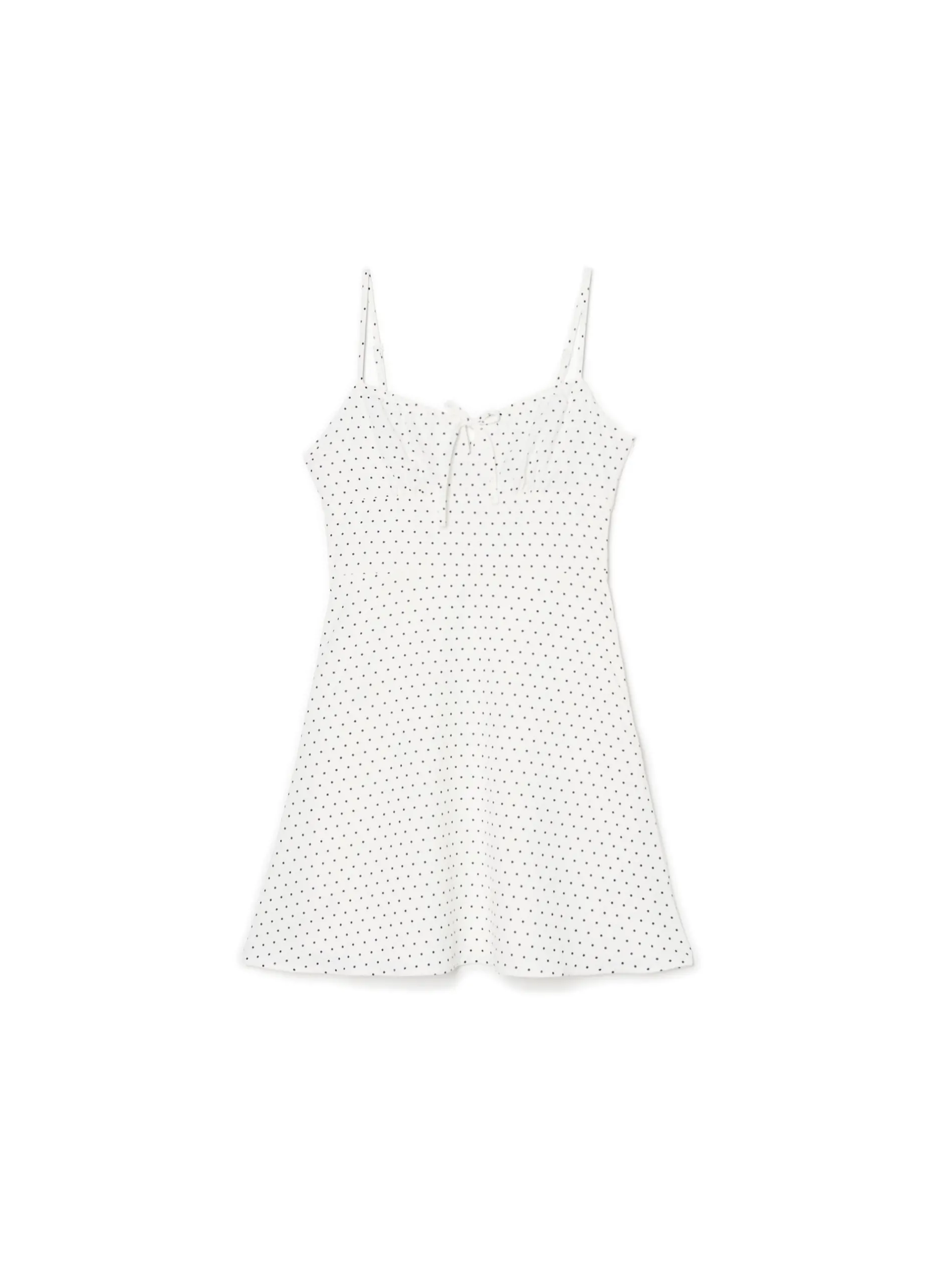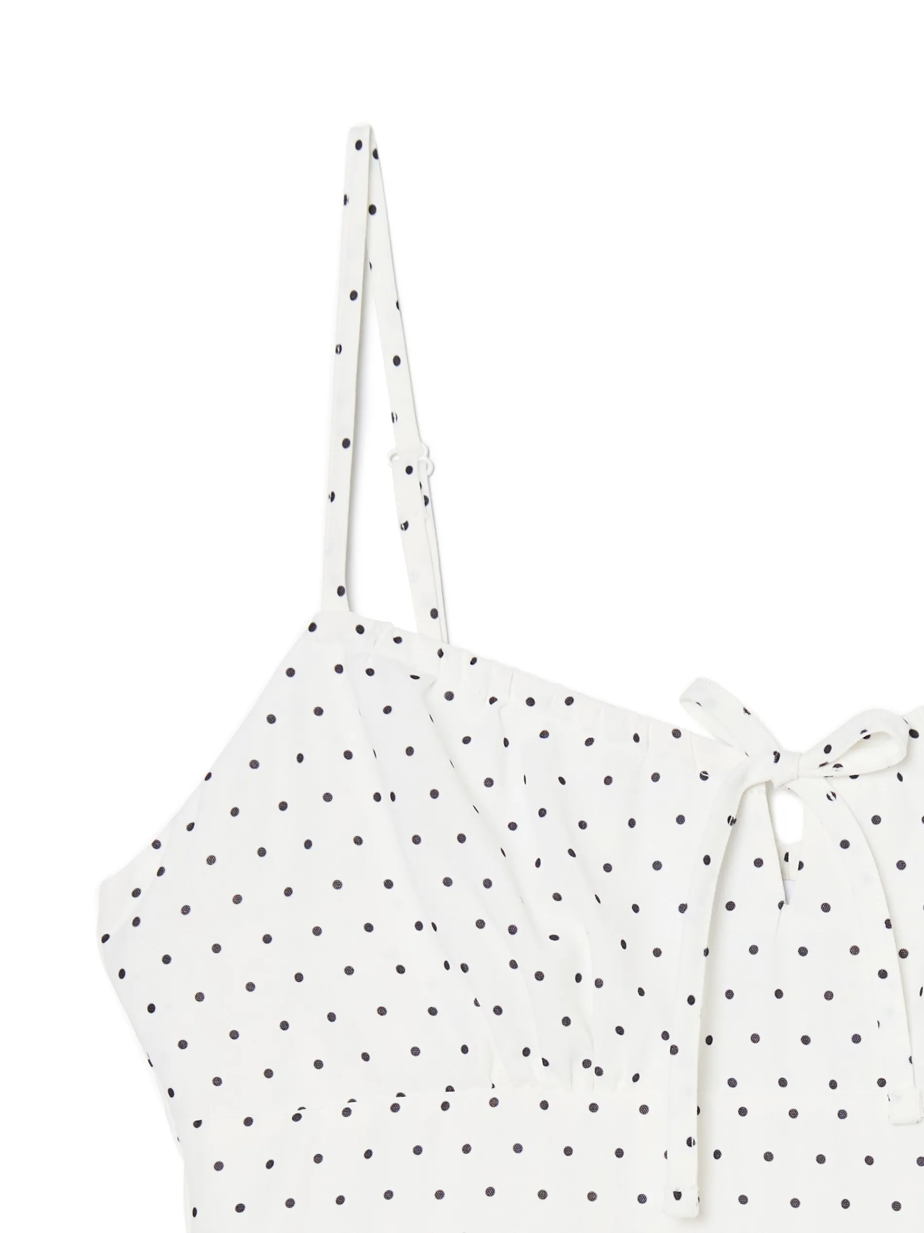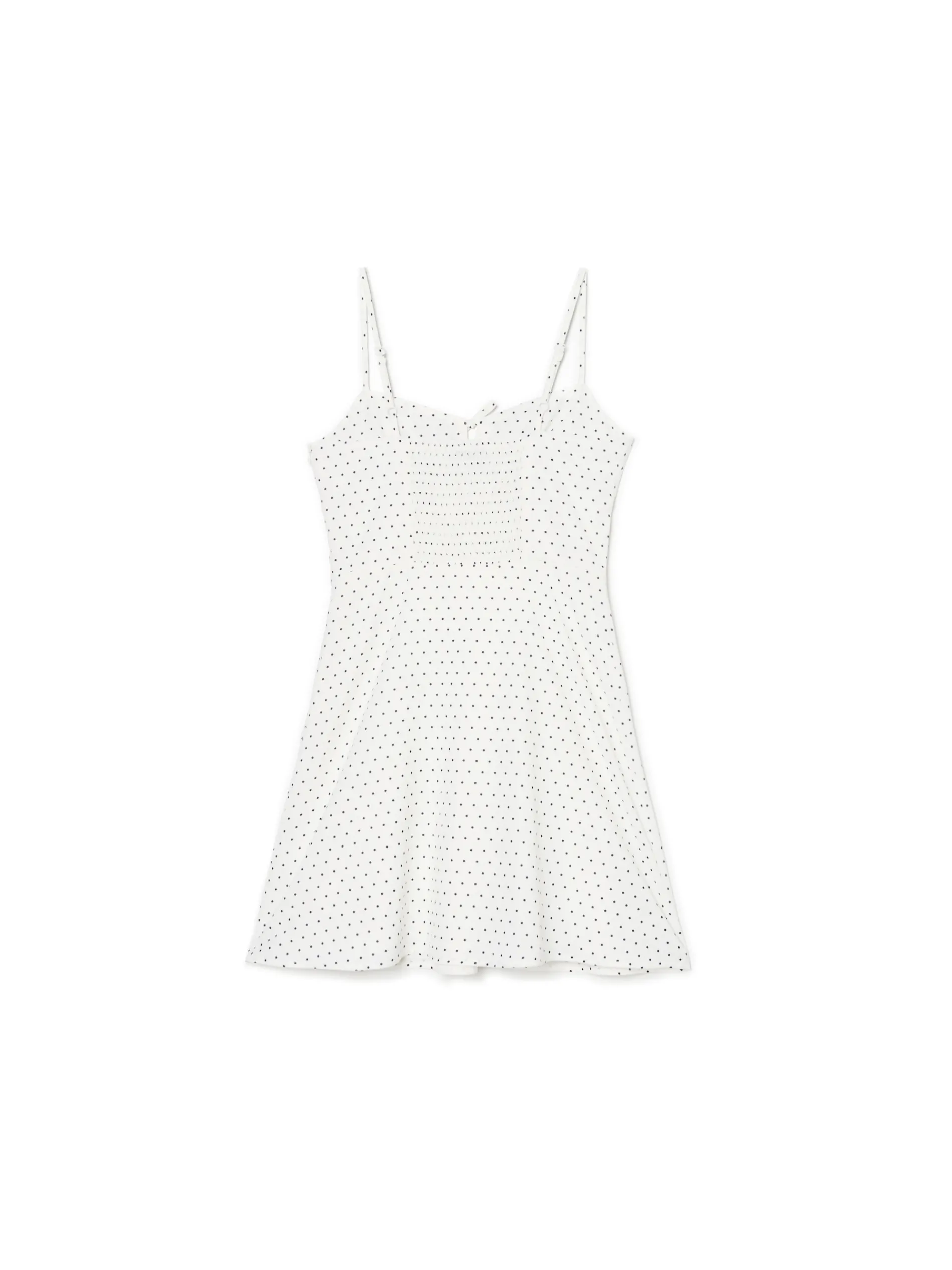 Lekka, zwiewna sukienka o długości mini na ramiączkach. Dekoracją są groszki na całym materiale i delikatna kokardka przy dekolcie. Idealna propozycja na lato! lekki materiał długość mini odcięcie w talii zapięcie na kryty zamek z boku dekolt w kształcie litery V elastyczna wstawka z tyłu wąskie ramiączka z regulacją długości z przodu ozdobne wiązanie wzór w groszki all over Wzrost modelki: 172 cm