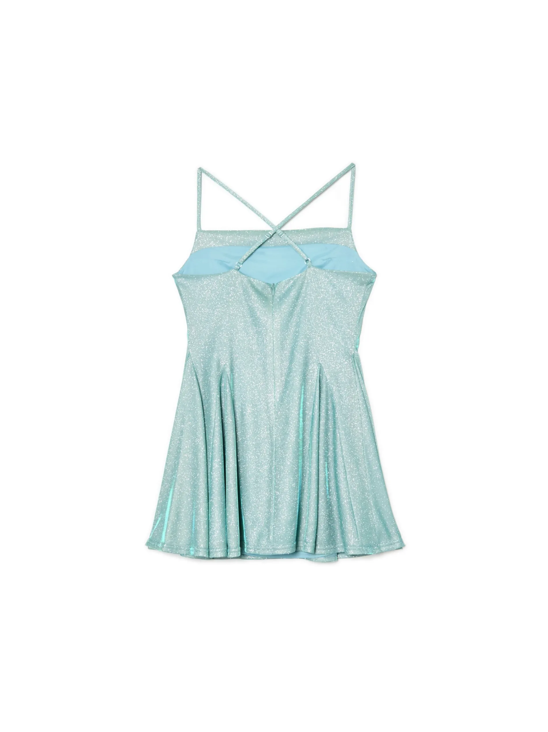 Chcesz skupić uwagę na sobie na imprezie sylwestrowej? Ta damska sukienka mini uszyta z delikatnie mieniącej się mieszanki tkanin Ci to zapewni. Dodatkowymi ozdobami są krzyżujące się na plecach cienkie ramiączka z regulacją i kliny na dole. delikatnie błyszczący materiał długość mini regulowane ramiączka krzyżujące się na plecach zapięcie na kryty zamek ozdobne falbany dodatkowe kliny nadające lekkości
