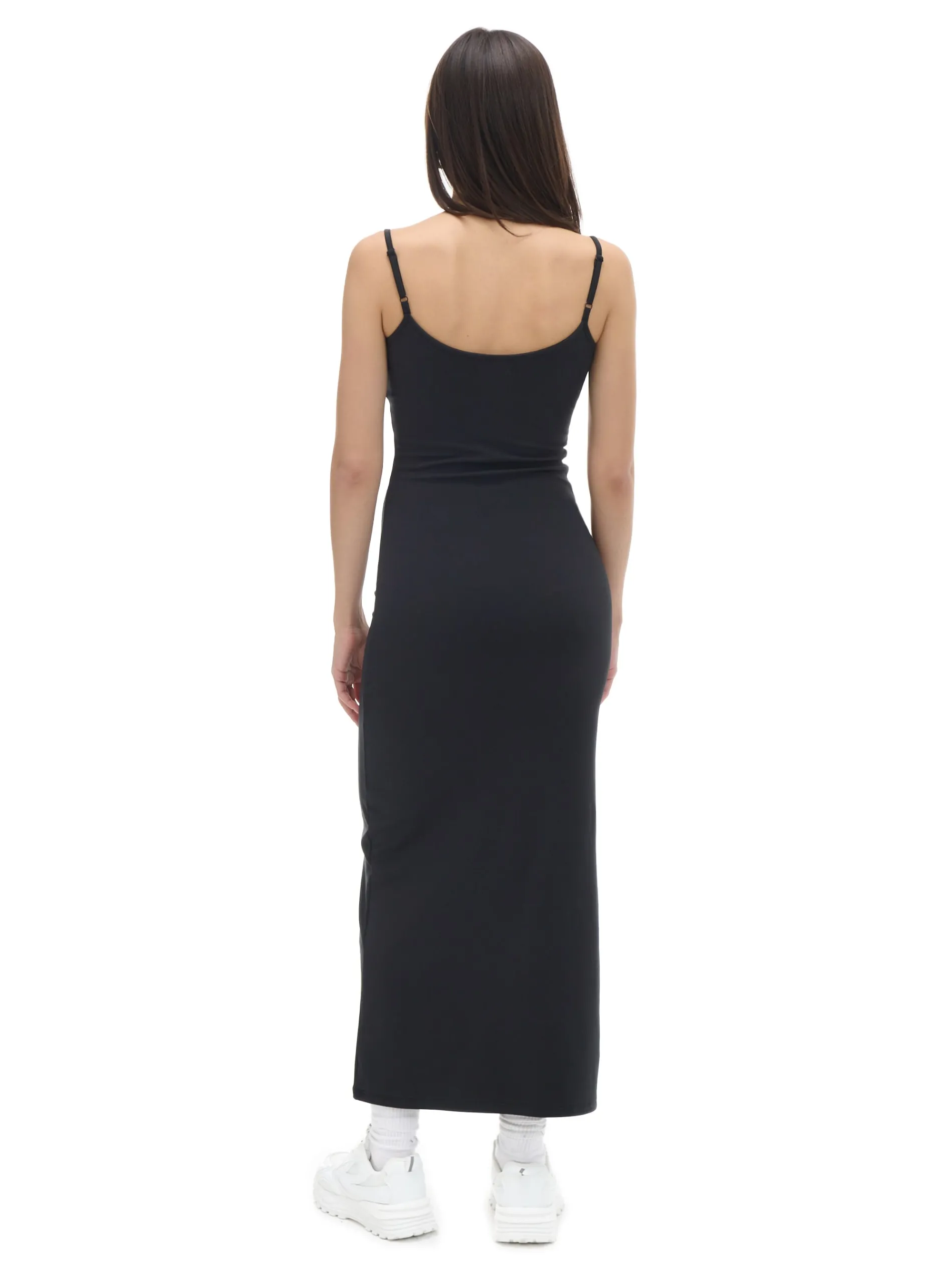 Długa sukienka, uszyta z czarnej dzianiny. dzianina z domieszką elastycznych włókien długość maxi dopasowany krój podkreślający sylwetkę okrągły dekolt wąskie ramiączka z regulacją długości