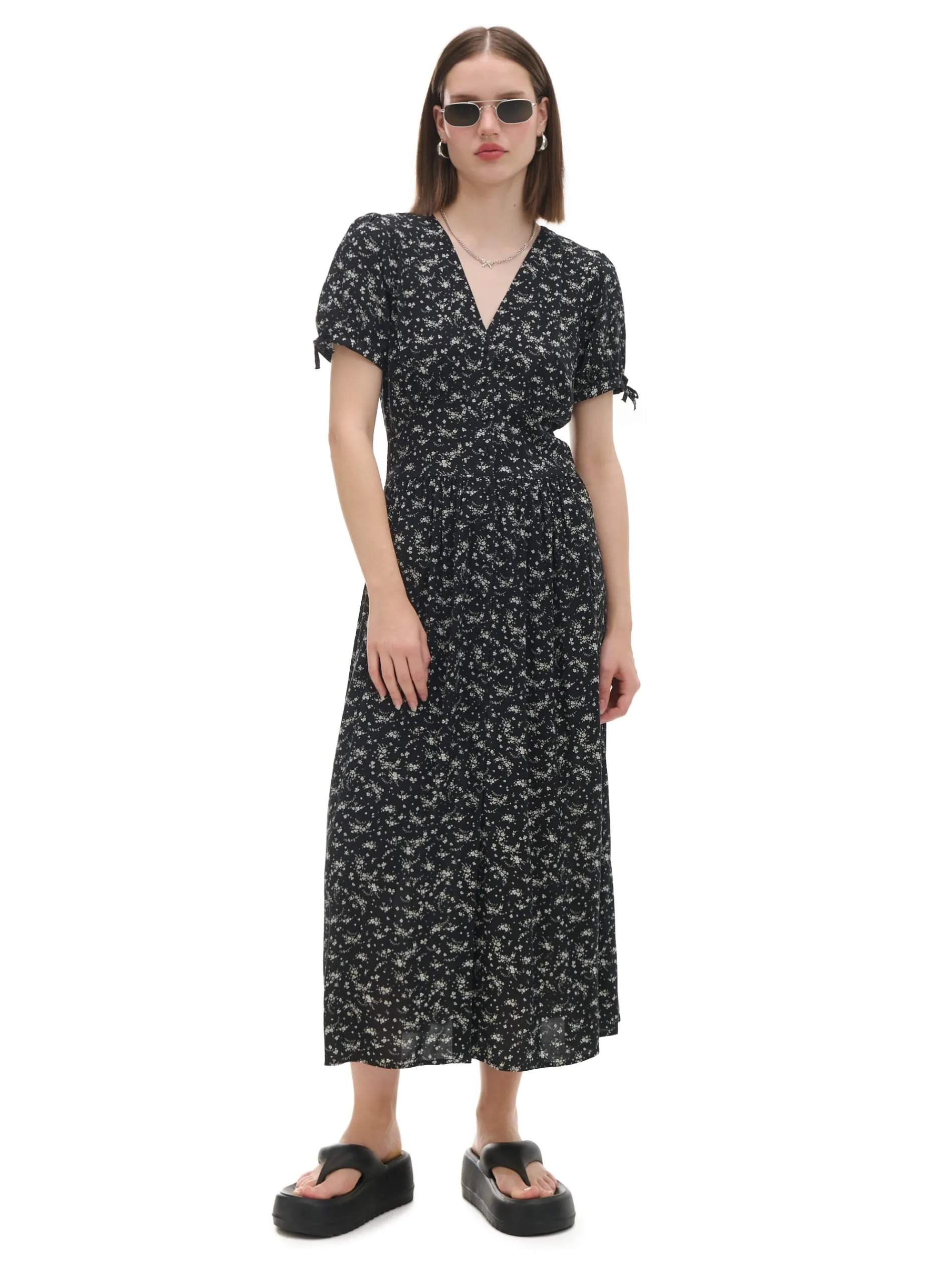 Sukienka damska o długości midi, uszyta z wiskozowej tkaniny. dekolt w kształcie litery V krótkie rękawy z ozdobnym wykończeniem zapięcie na guziki elastyczna gumka w pasie wzór w kwiaty na całości dostępne inne warianty kolorystyczne Wzrost modelki: 172 cm