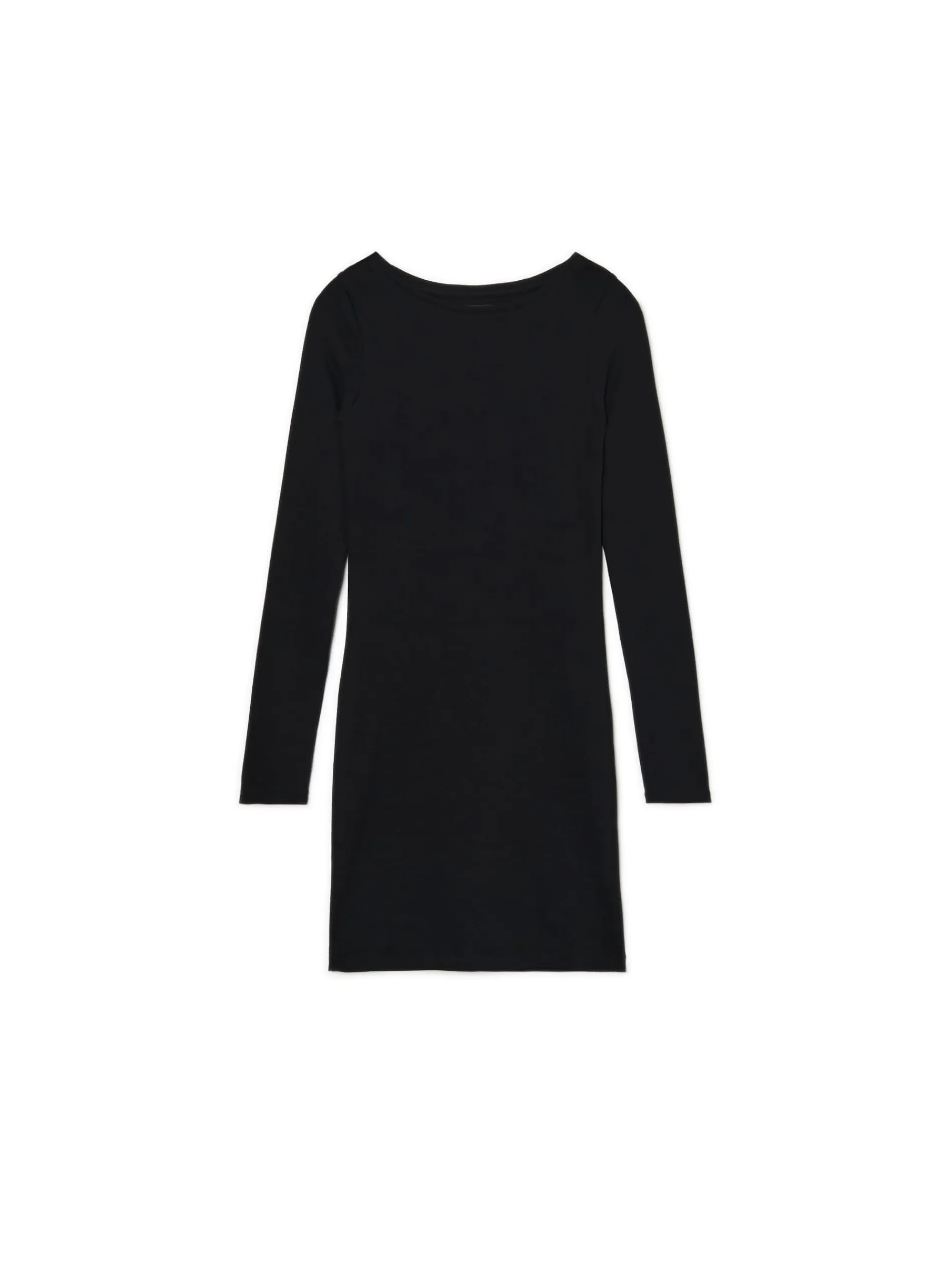 Damska sukienka o długości mini, uszyta z mieszanki dzianin z bawełną. Taki klasyk warto mieć awaryjnie w swojej szafie! bawełna z dodatkiem elastycznych włókien długość midi długie, dopasowane rękawy dekolt w łódkę