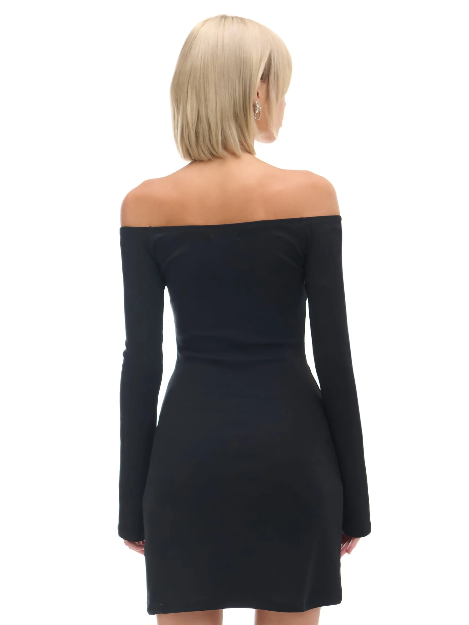 Damska sukienka o długości mini, uszyta z dzianinowego materiału z bawełną. Ozdobą są długie rękawy rozszerzane ku dołowi, nadające lekkości całej stylizacji. bawełna z dodatkiem elastycznych włókien delikatne taliowanie dekolt w łódkę wykończony gumką lekko rozszerzane rękawy opadające ramiona Wzrost modelki: 177 cm