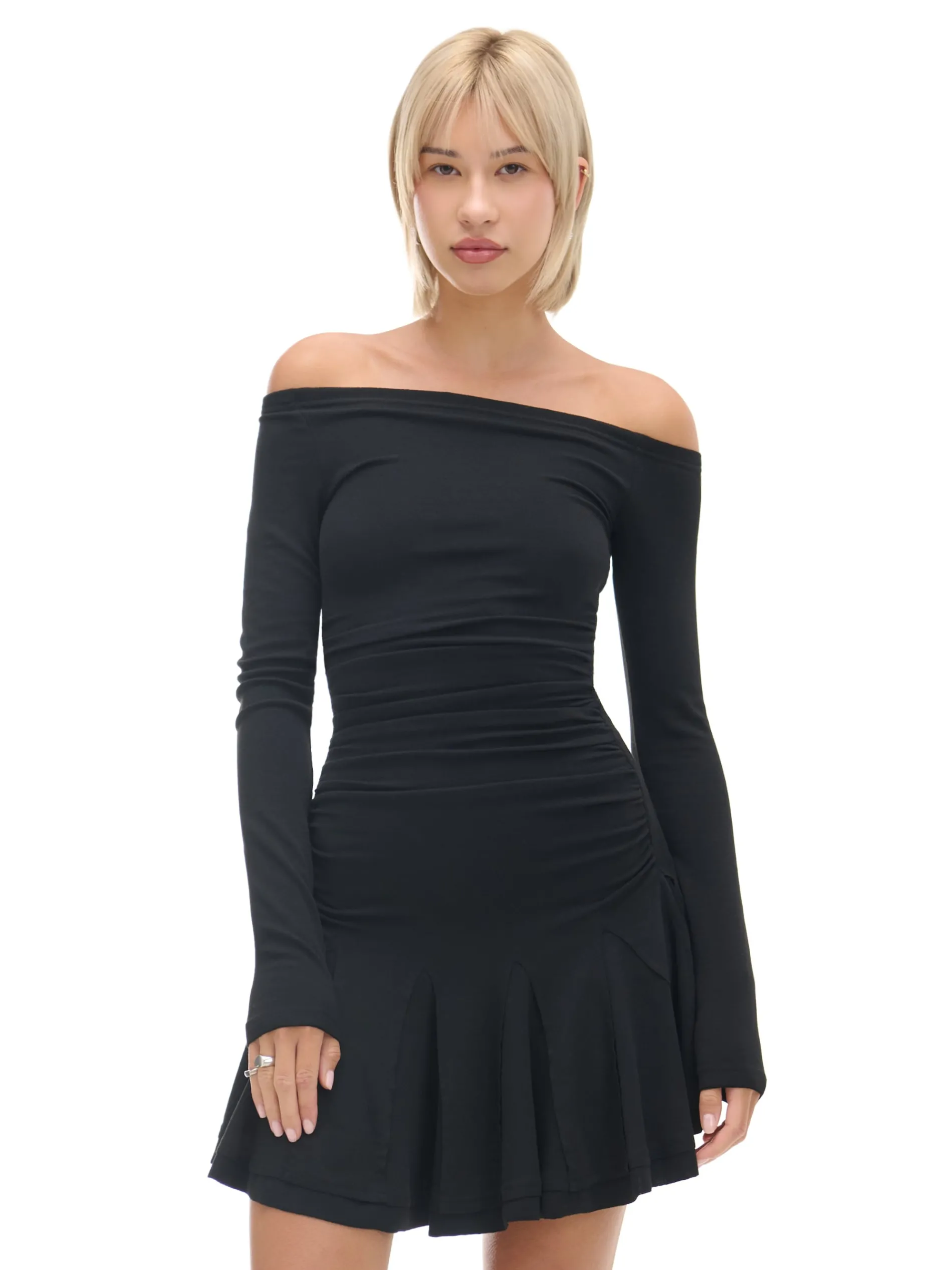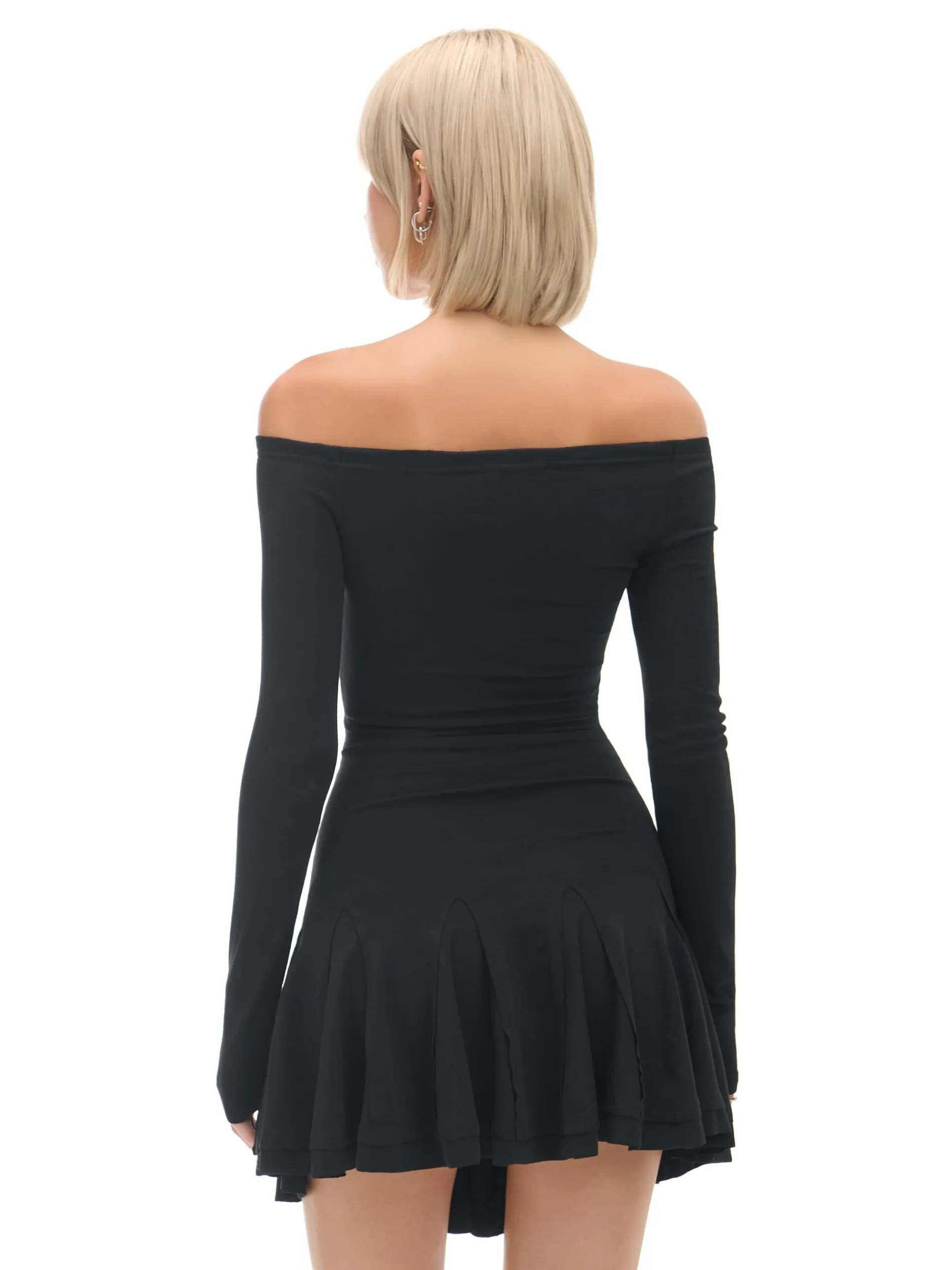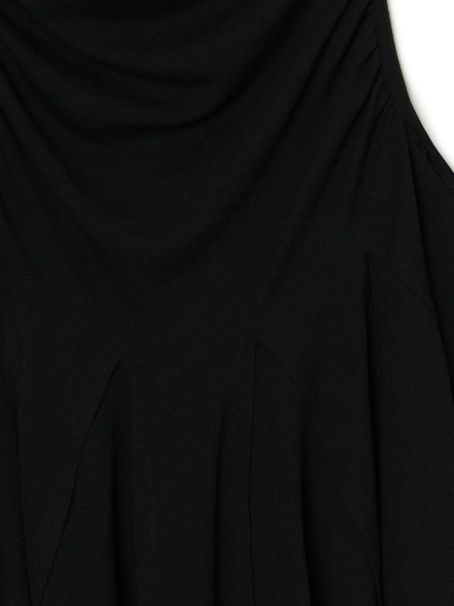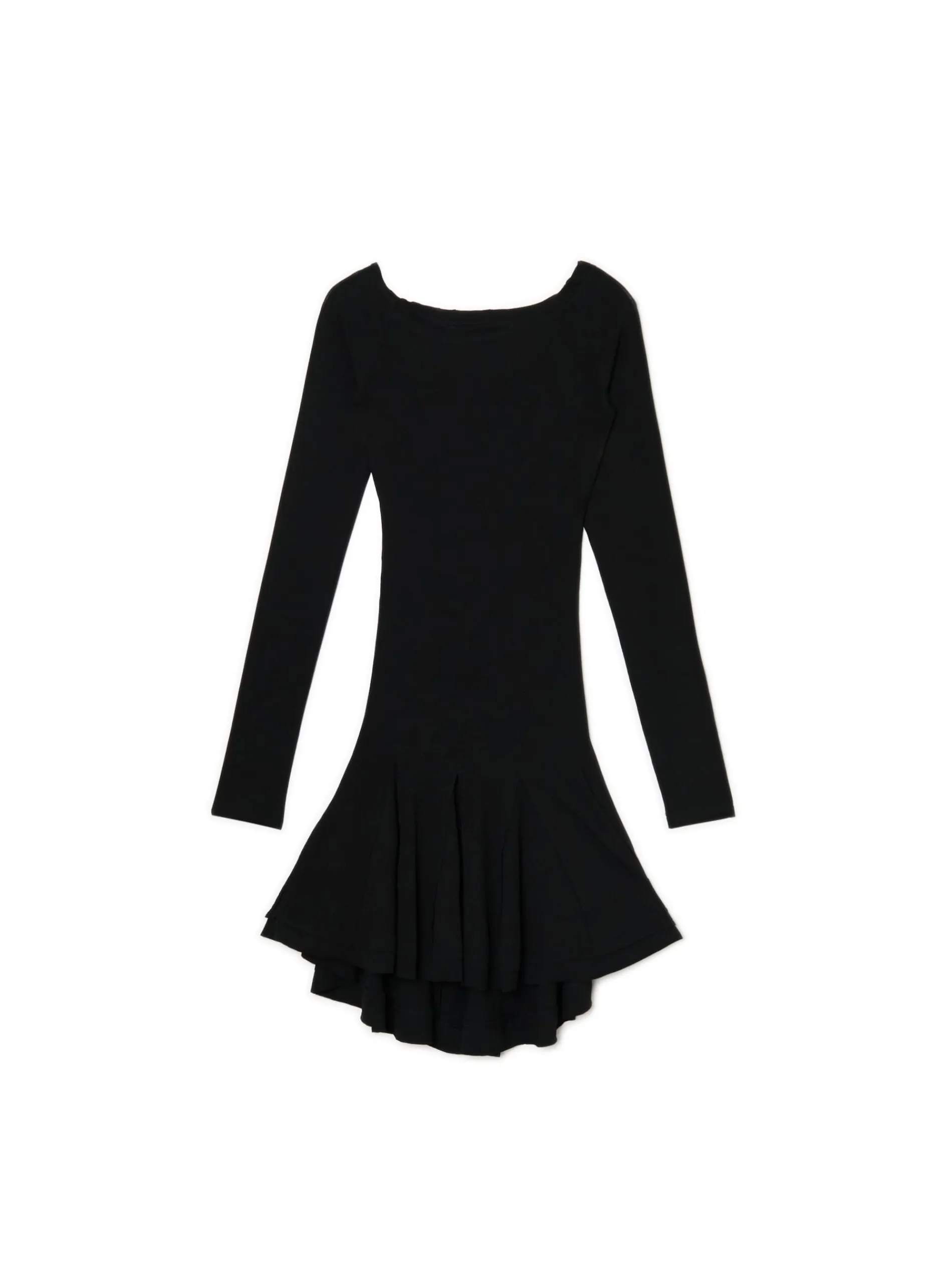 Krótka czarna sukienka, uszyta z lekkiej dzianiny zawierającej wiskozę. długość mini krój A dekolt typu łódka długie, proste rękawy marszczenia w talii plisowany dół surowe wykończenie brzegów Wzrost modelki: 177 cm