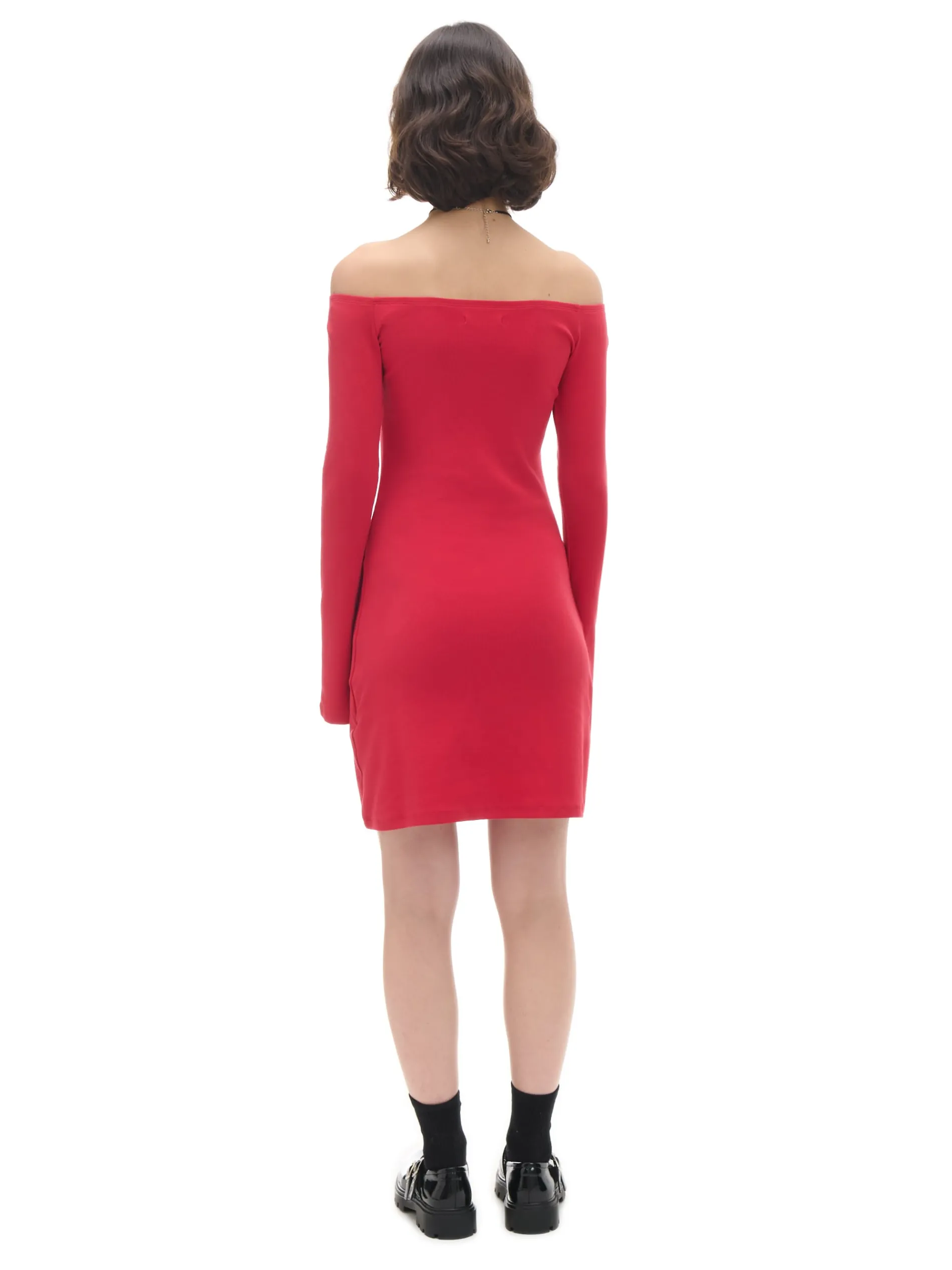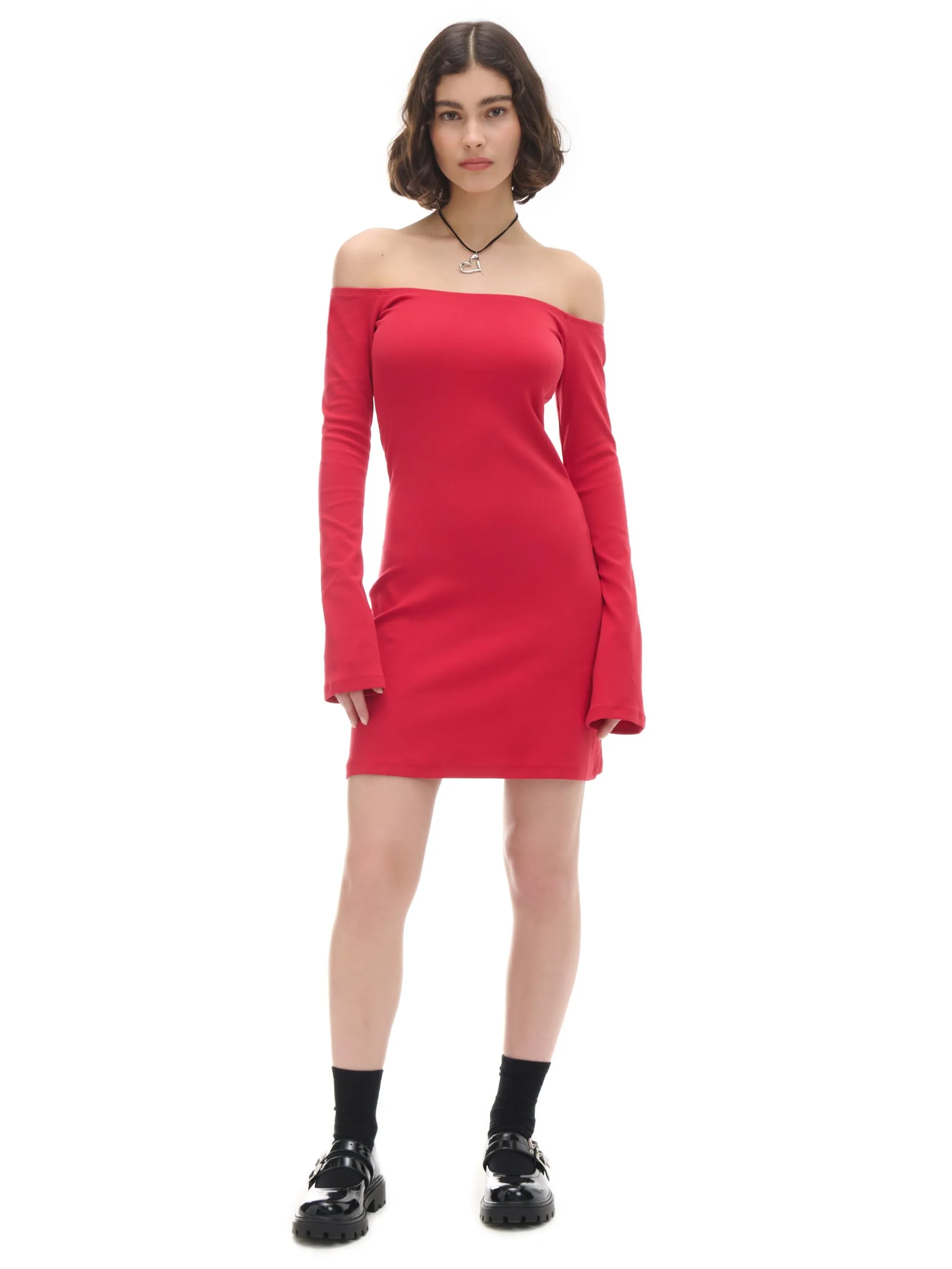 Damska sukienka o długości mini, uszyta z dzianinowego materiału z bawełną. Ozdobą są długie rękawy rozszerzane ku dołowi, nadające lekkości całej stylizacji. bawełna z dodatkiem elastycznych włókien delikatne taliowanie dekolt w łódkę wykończony gumką lekko rozszerzane rękawy opadające ramiona Wzrost modelki: 172 cm